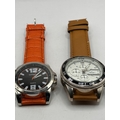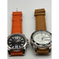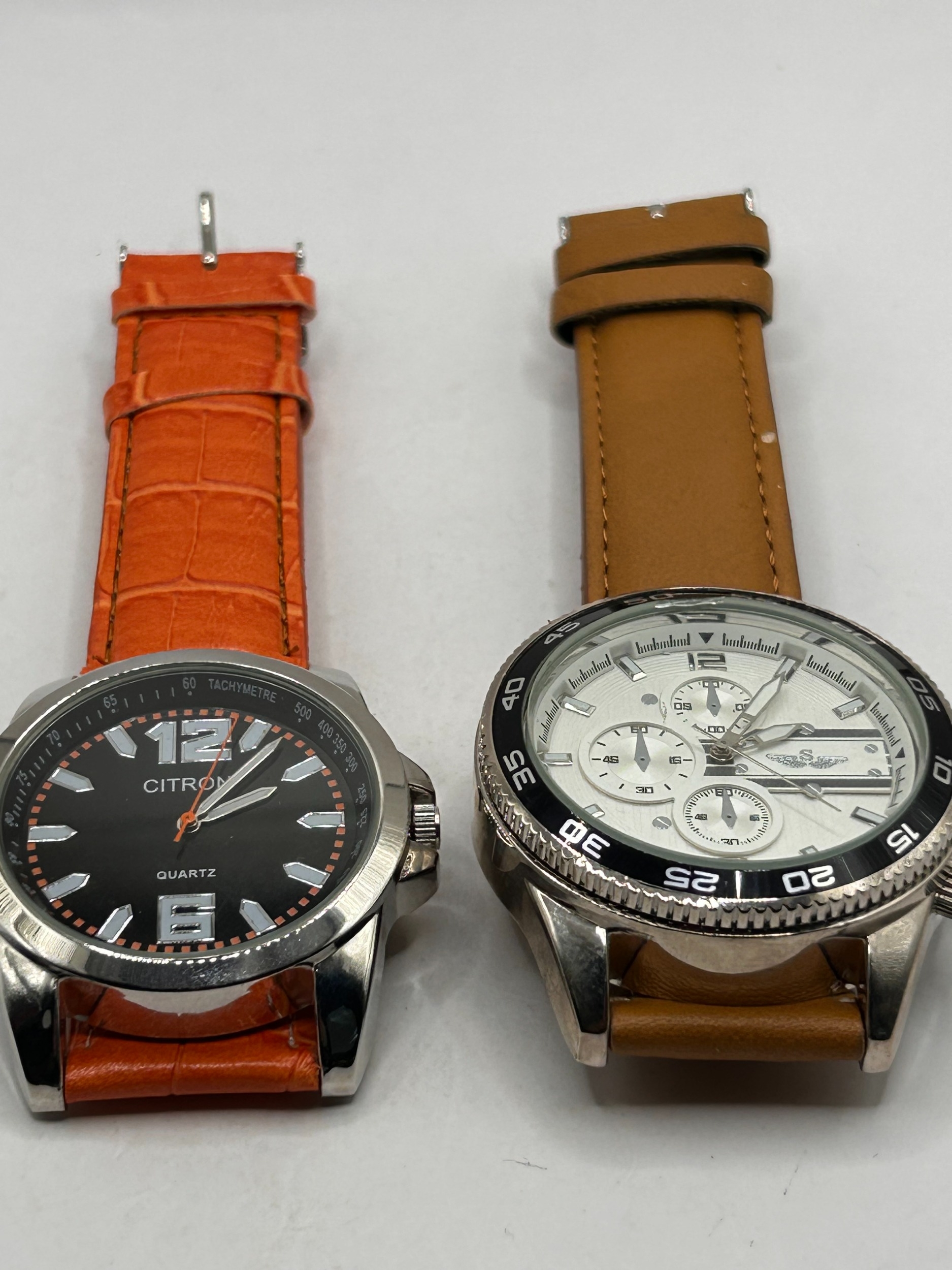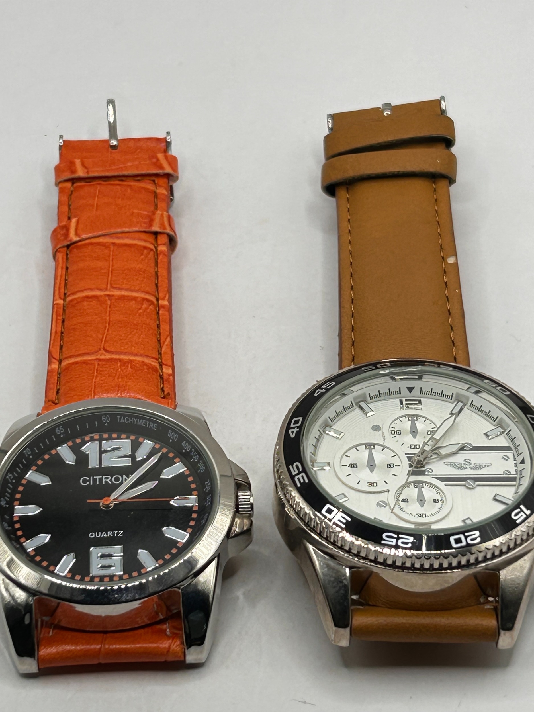 A pair of mens wristwatches. The first watch, marked CITRON, features a silver-tone case and a black dial inscribed with the brand name and QUARTZ. The dial utilizes large silver numerals at the 12 and 6 positions, with stick indices elsewhere. The fixed bezel is inscribed with a tachymeter scale. This watch is fitted with an orange, crocodile-textured faux leather strap. The second watch is a chronograph-style timepiece with a silver-tone case and a white dial featuring three functional or decorative subdials and stick indices. The dial bears an emblem and partially obscured text below the 12 o'clock position. This watch is set within a black rotating diving bezel marked 0 to 60 and is fitted with a smooth tan leather strap. Both watches are quartz movements.