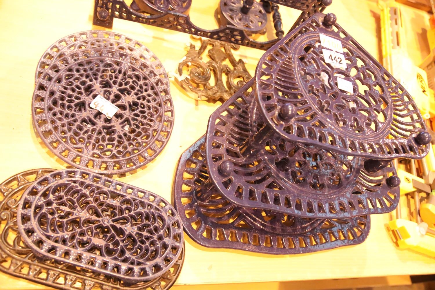 Blue cast iron kitchenalia including pan stand, wine rack and trivets etc. Not available for in-house P&P.