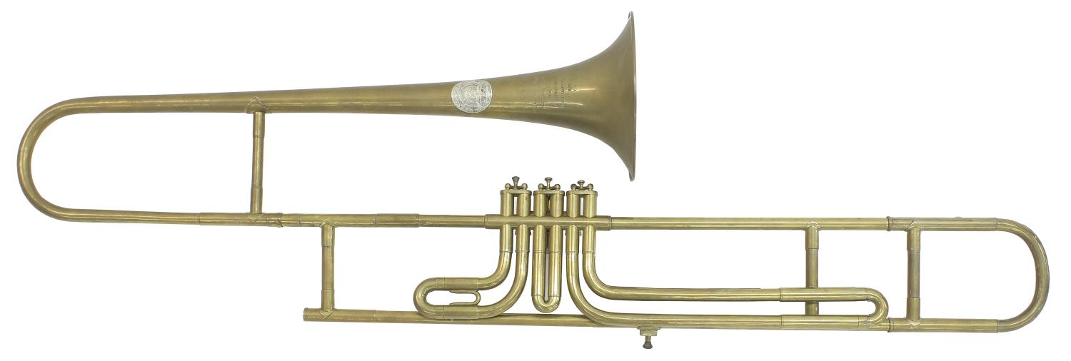 Brass three valve trombone, signed F&L de Cart Freres, Lierre, made circa 1880, bell diameter 17.6cm