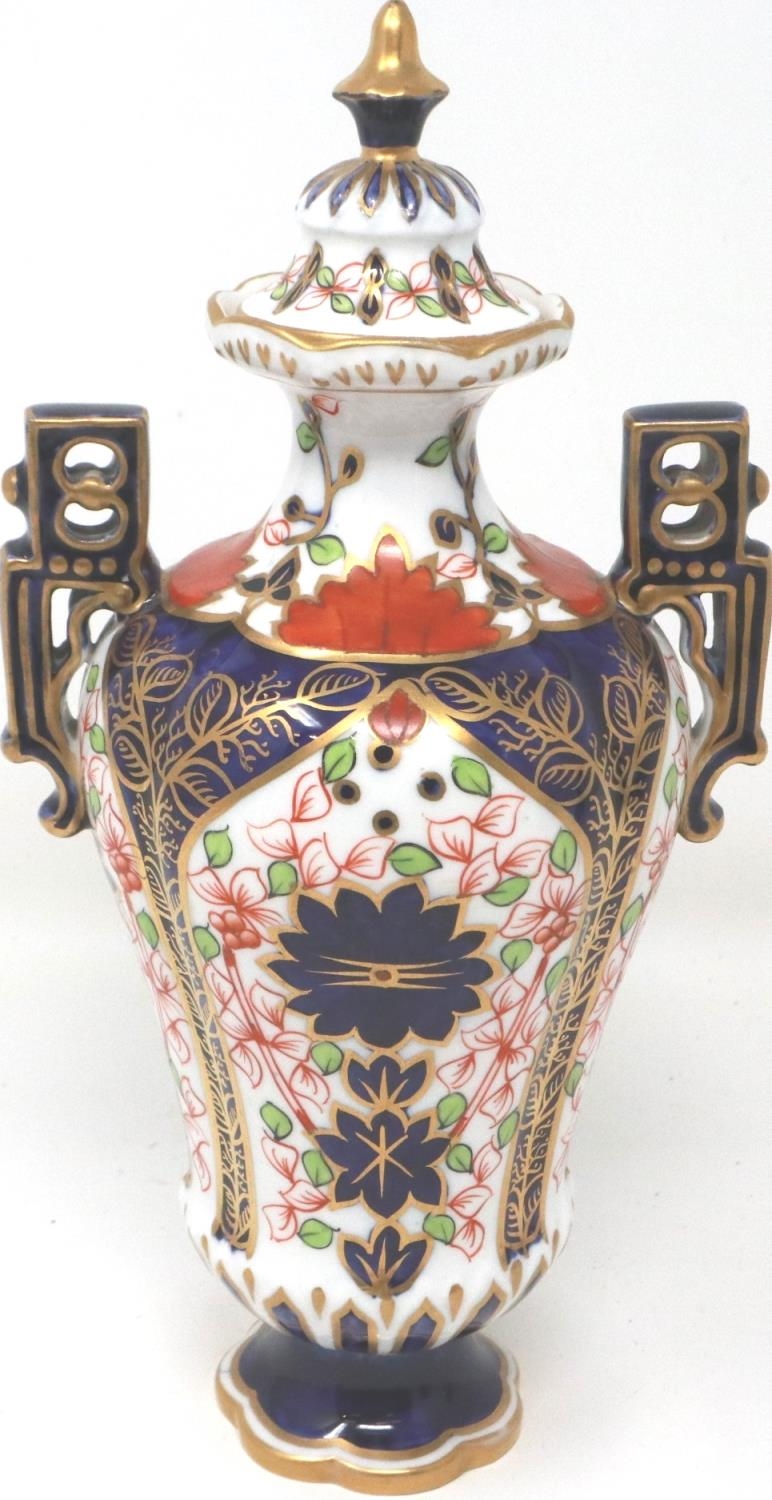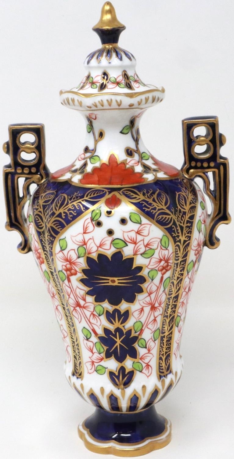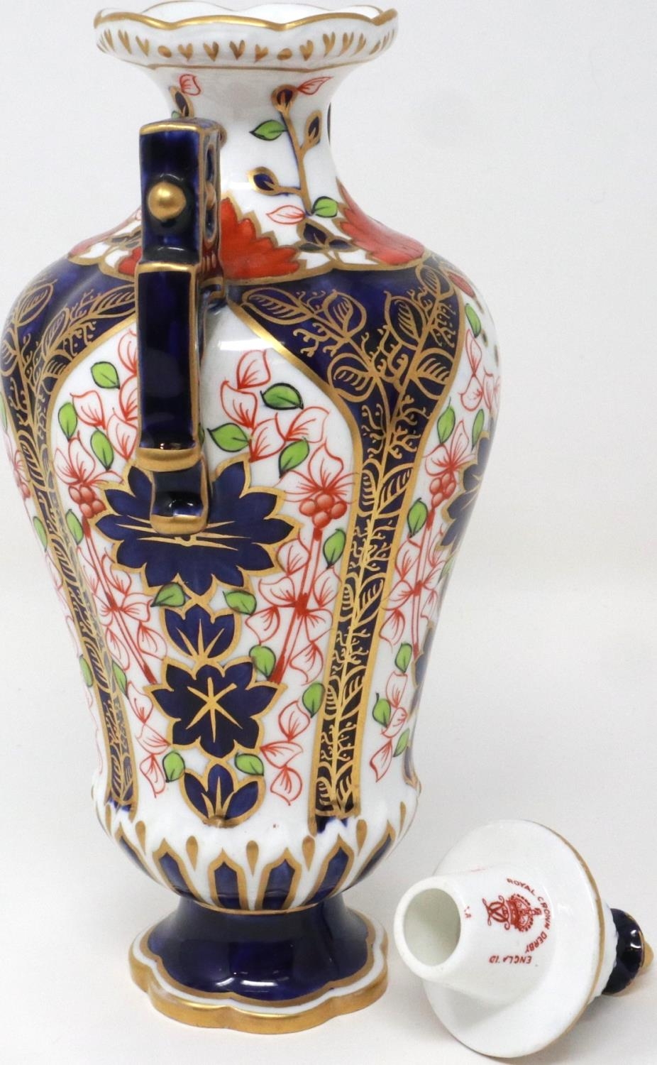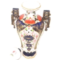 19th century Royal Crown Derby twin handled urn in the Imari pattern, H: 22 cm, small chip to base, no visible restorations. P&P Group 1 (£14+VAT for the first lot and £1+VAT for subsequent lots)
