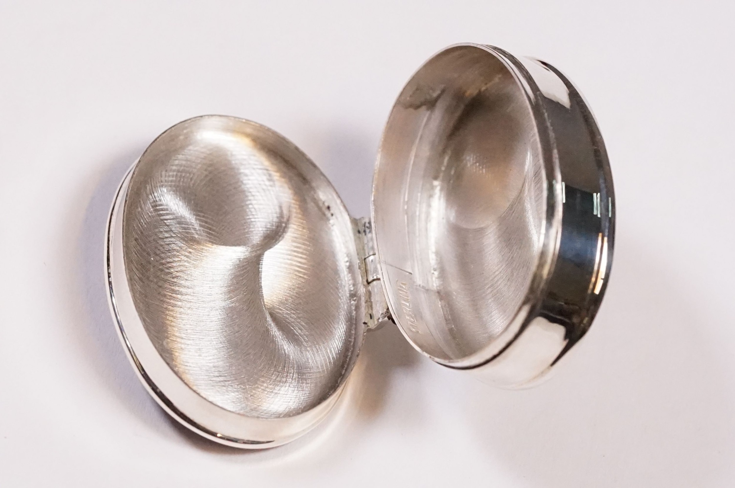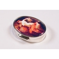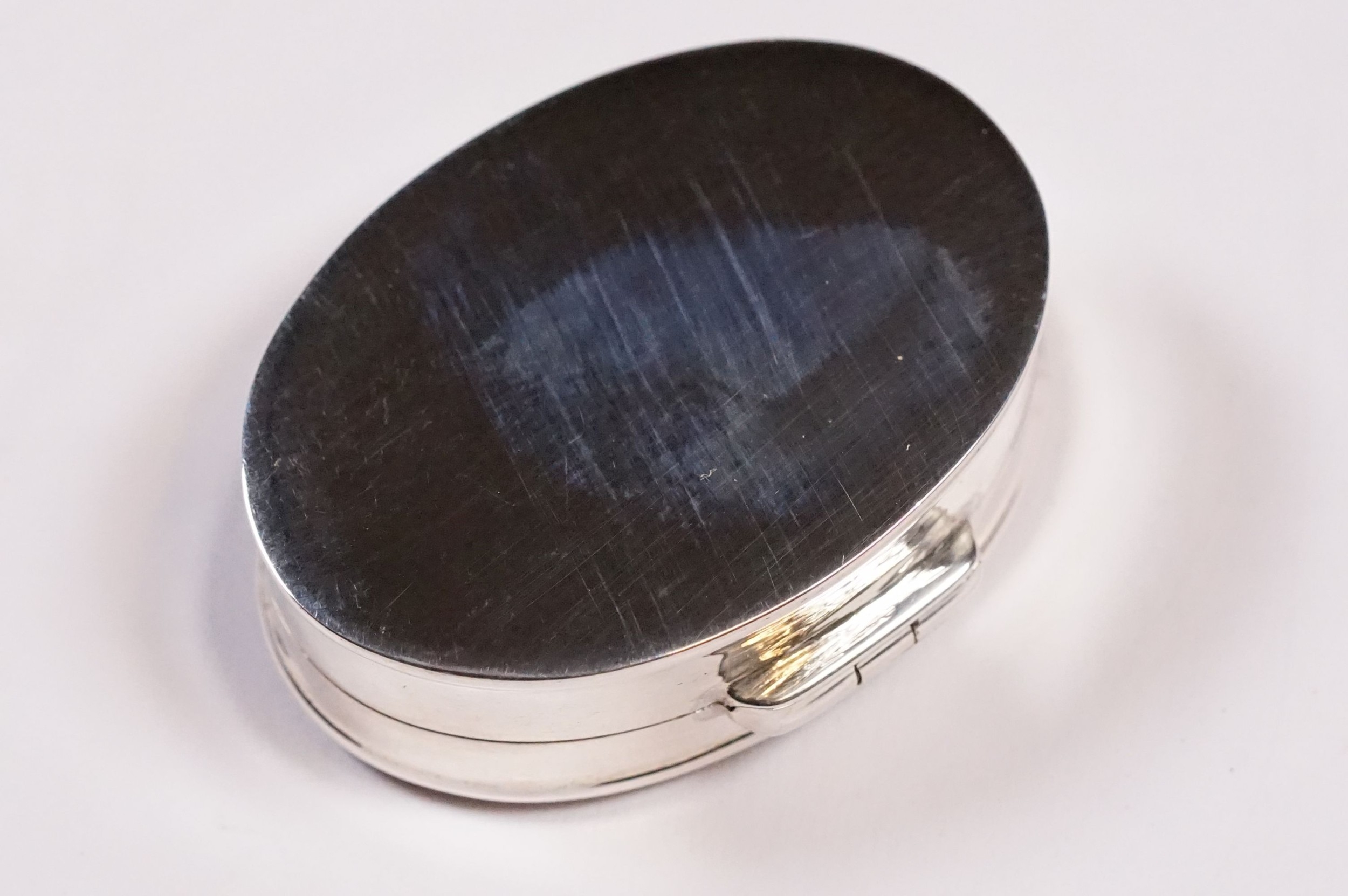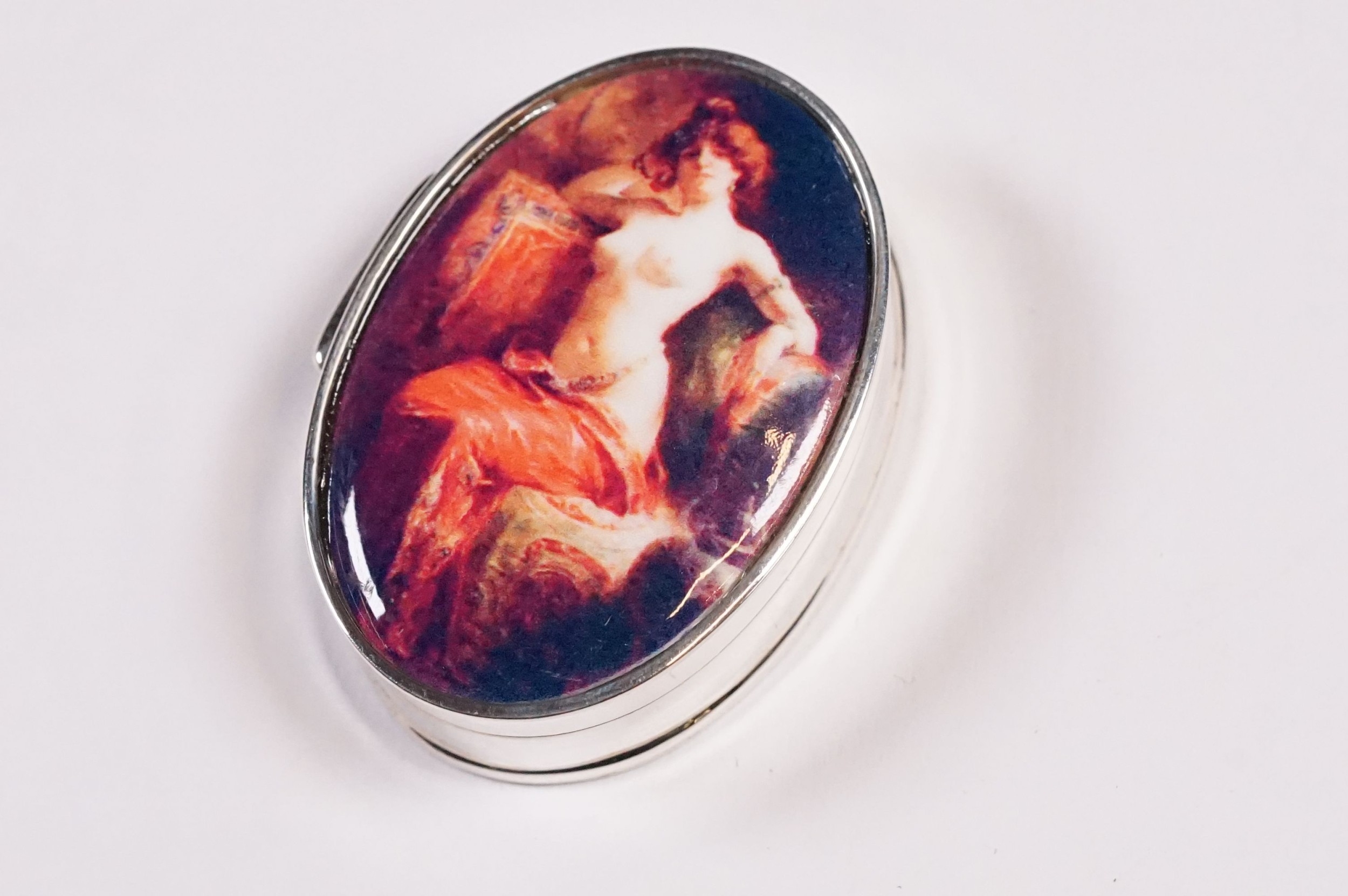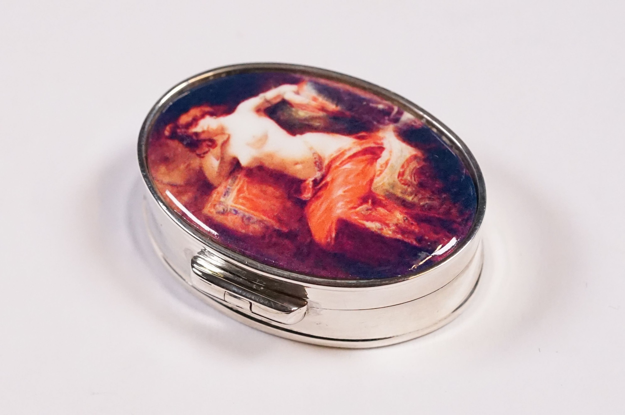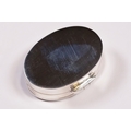 Silver oval shaped pill box with enamel lid.