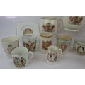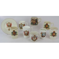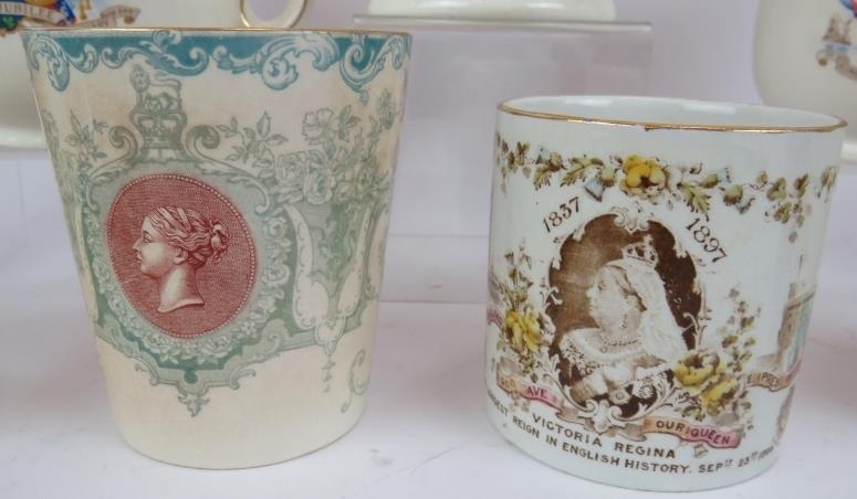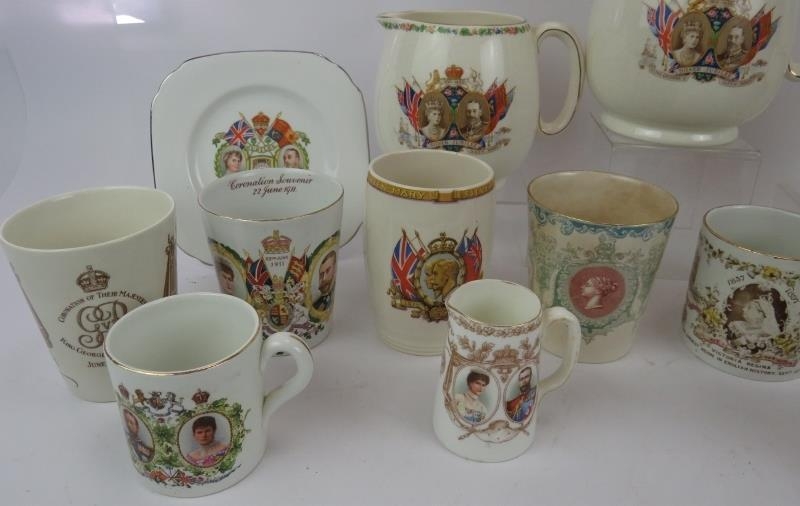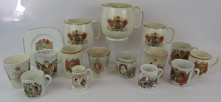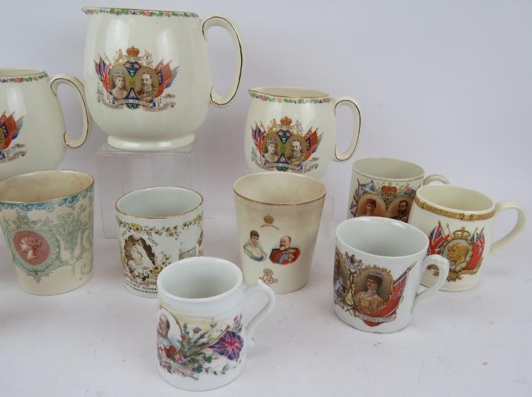 A set of 3 George V silver jubilee jugs, nine pieces of George V commemorative ware, two pieces of Queen Victoria commemorative ware and two Edward VII pieces of commemorative ware. (16).