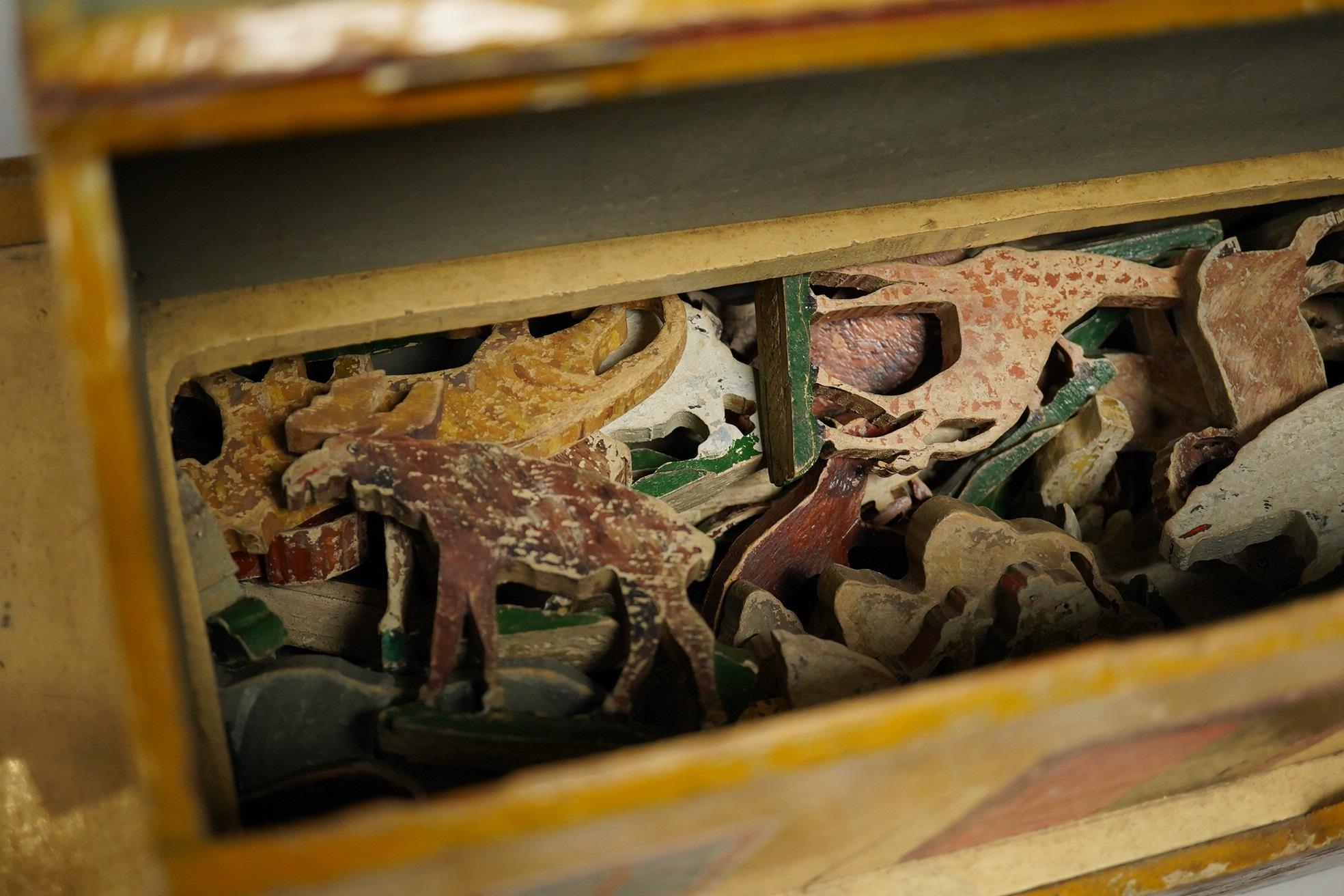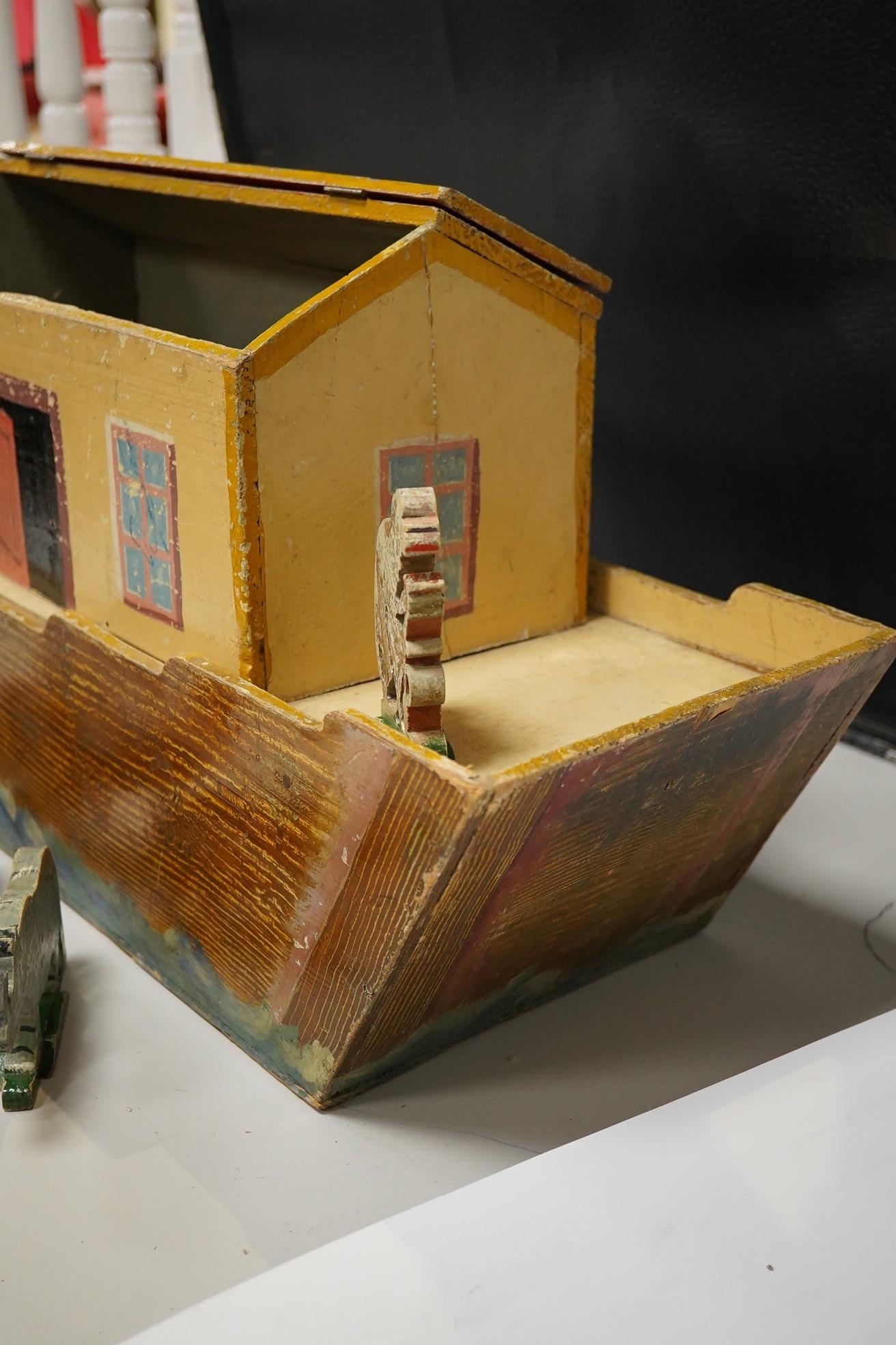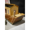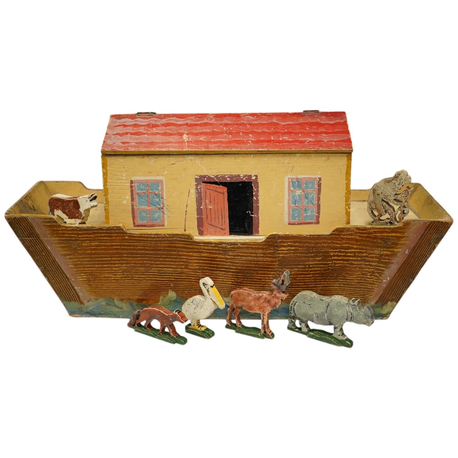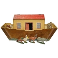 An early 20th century painted pine Noah's Ark and semi-flat animal figures, the hull 68.5cm long. Condition fair, general wear and scuffing to the paintwork.