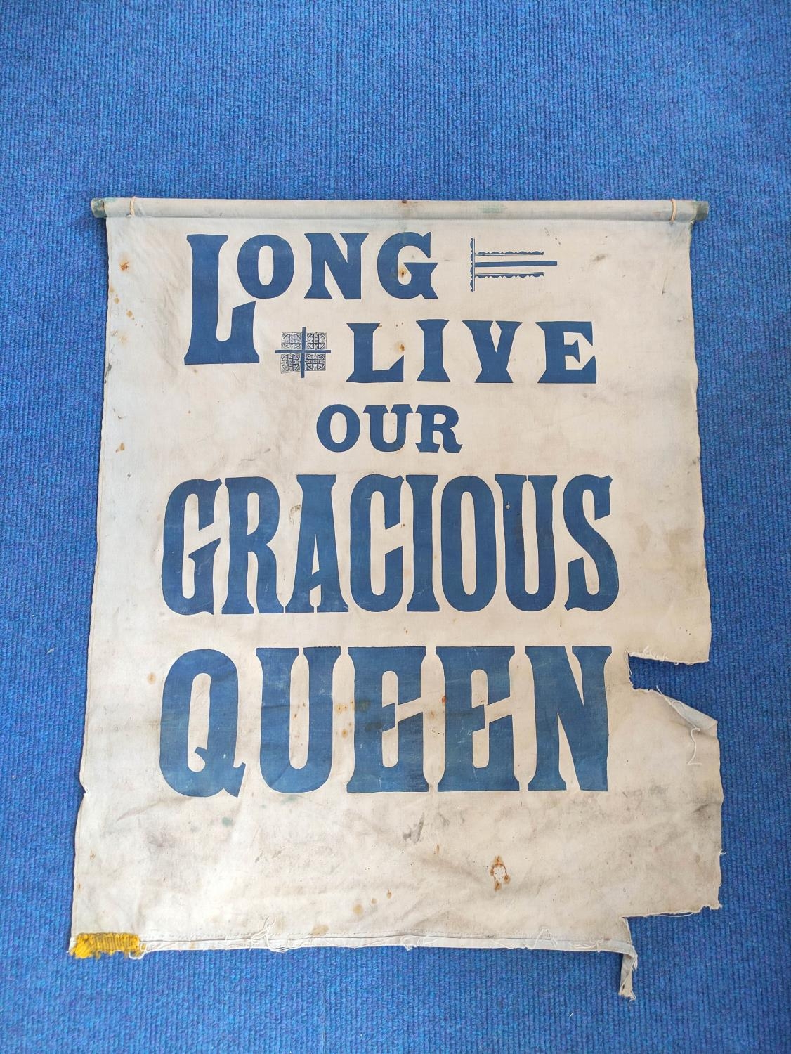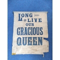 Victorian canvas banner with the text "Long Live Our Gracious Queen". Possibly from Victoria's Diamond Jubilee of 1897. 88cm x 73cm.