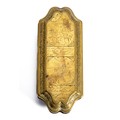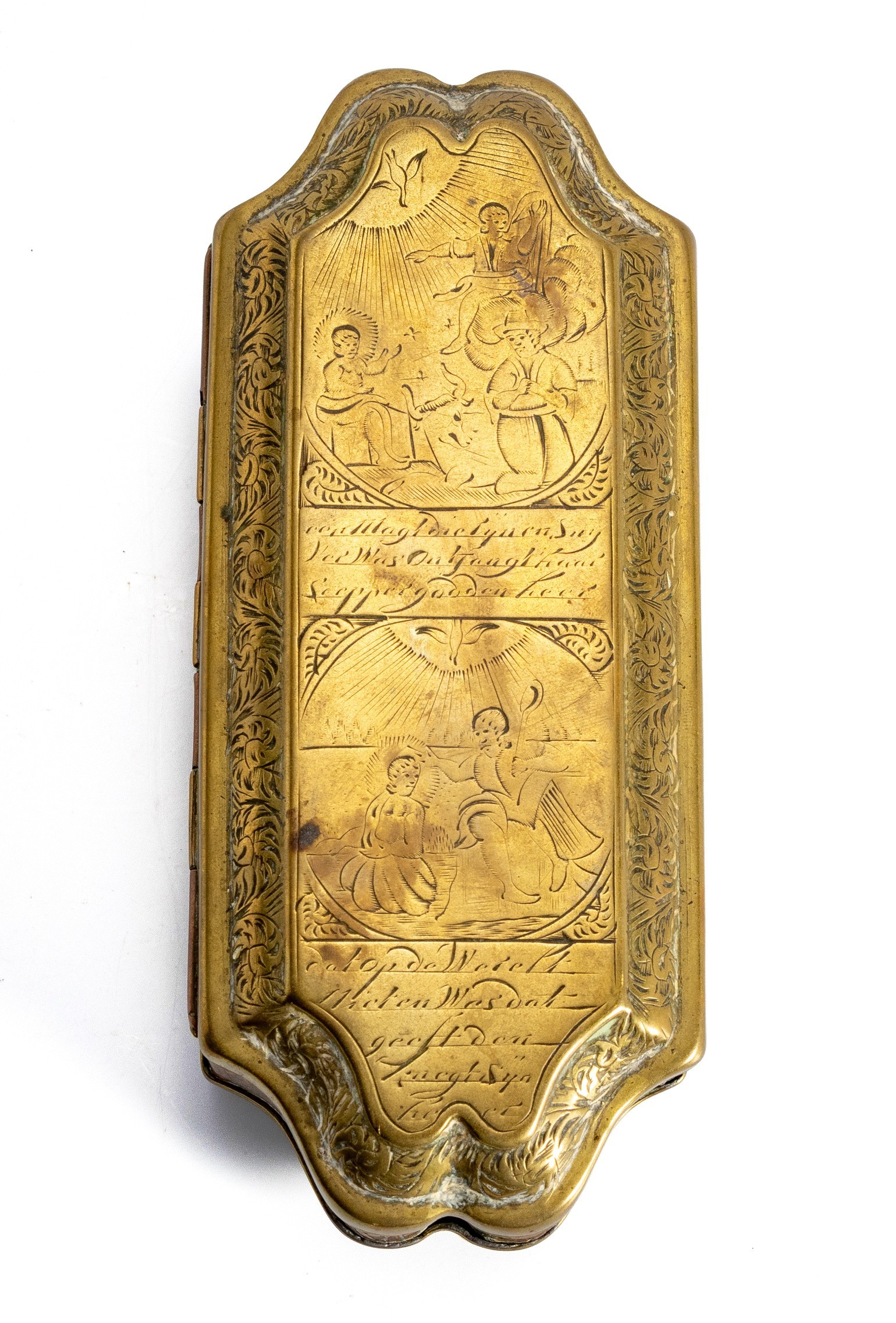 Sarcophagus-shaped, the hinged cover chased with biblical scenes and inscribed in Dutch within a scrolling border