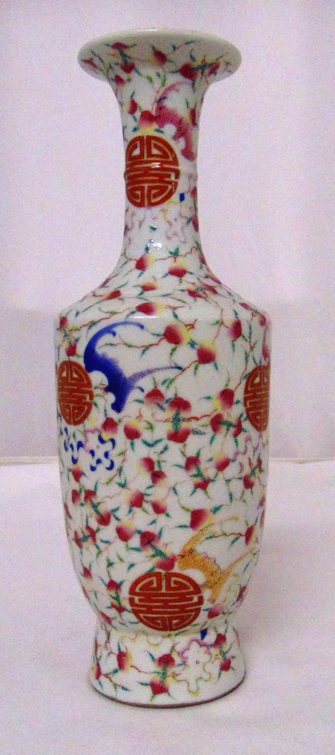 A Chinese polychromatic stem vase decorated with bats and symbols, marks to the base, 31cm (h)