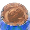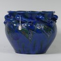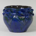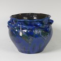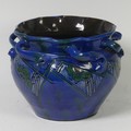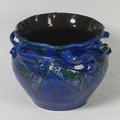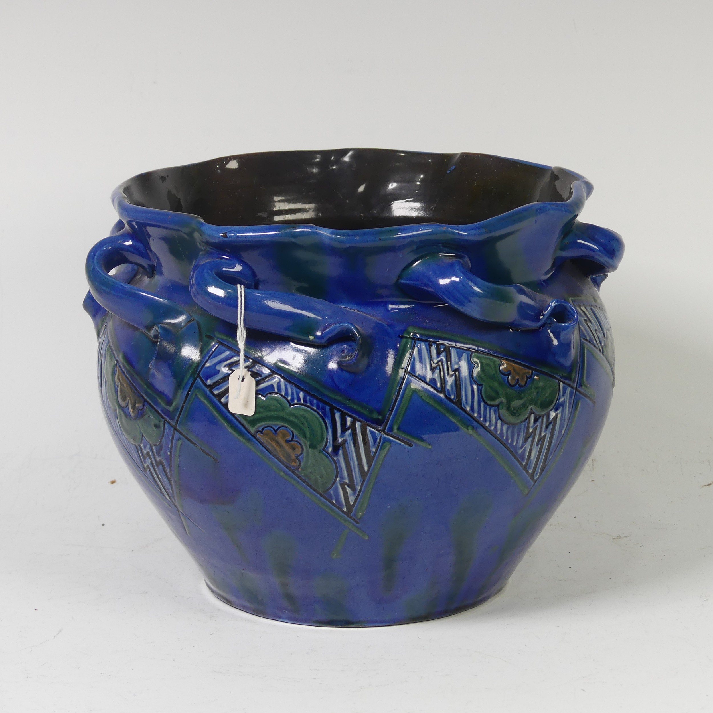 A C. H. Brannam Barum pottery Jardinière, early 20th Century, with twisted handles, decorated in coloured enamels, impressed mark to base, some losses and cracking of glaze, repaired, 20.2cm high, 23.5cm diameter.