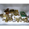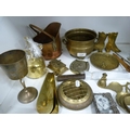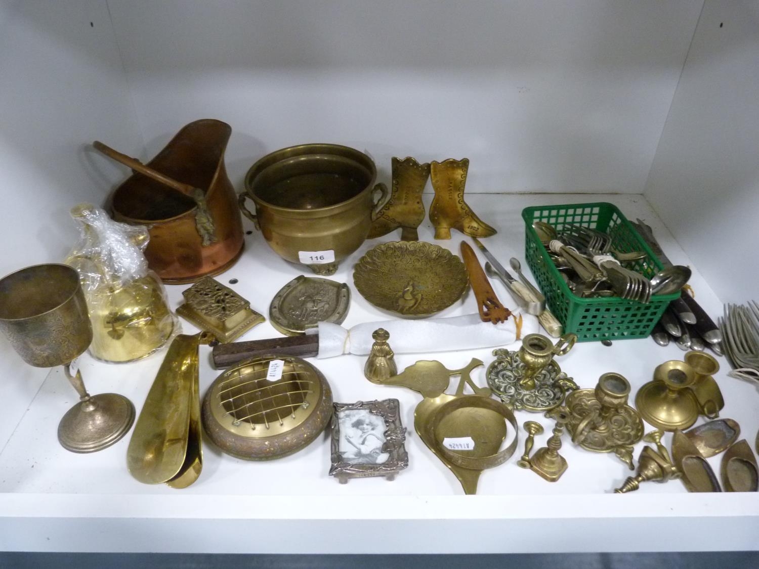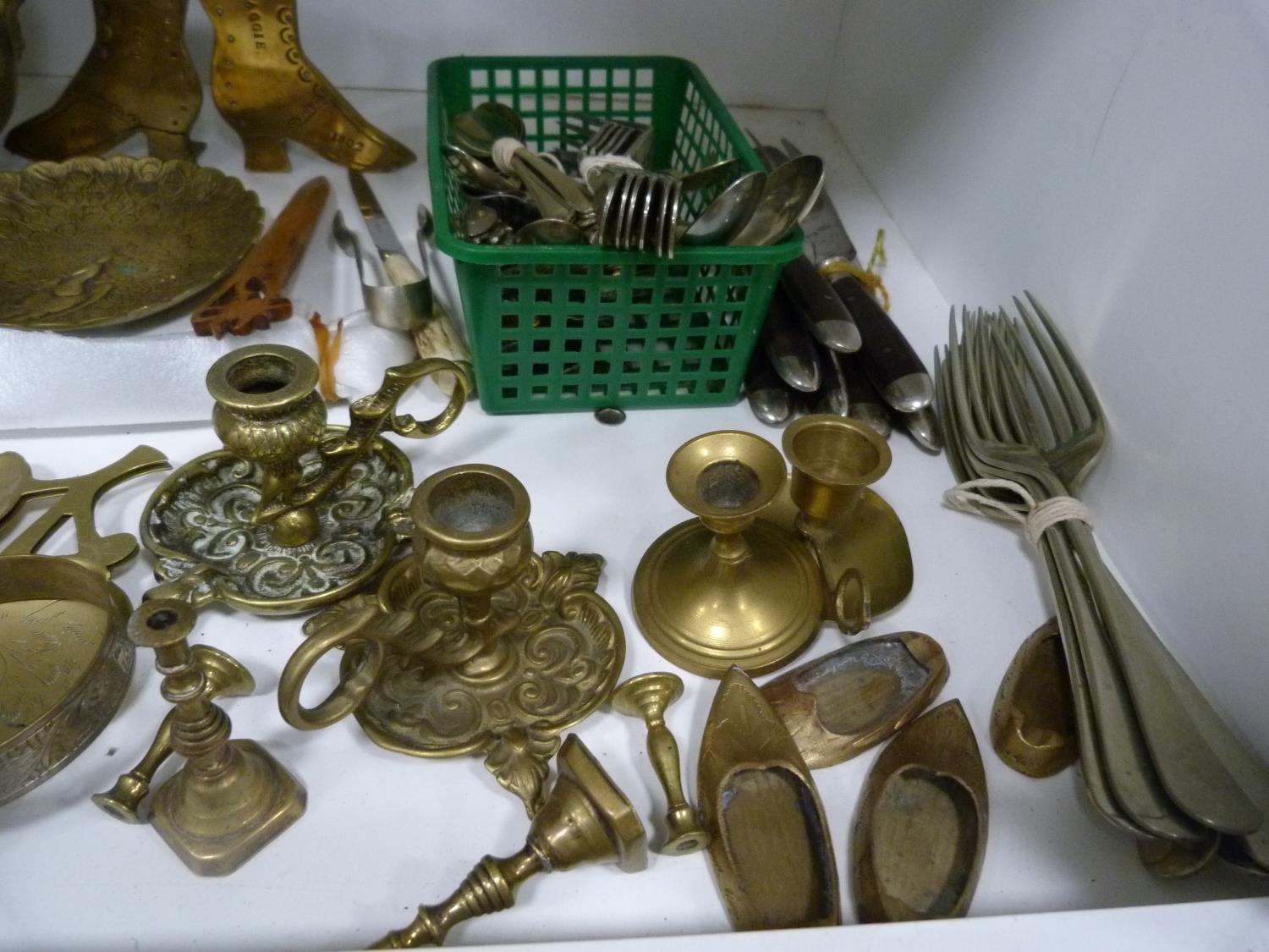 Small brass planter, miniature copper coal depot, watering can, shoe horns, photograph frame, candlesticks and loose cutlery etc.