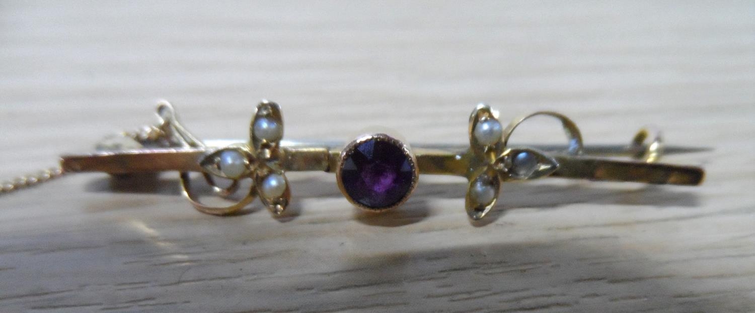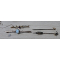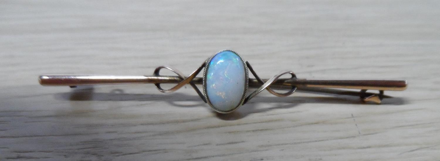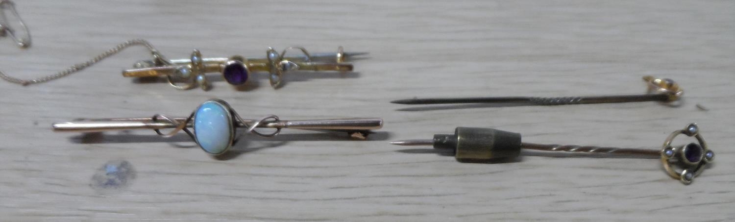 Two Edwardian 9ct bar brooches, one set with an oval cut Opel together with 2 other items etc (4)