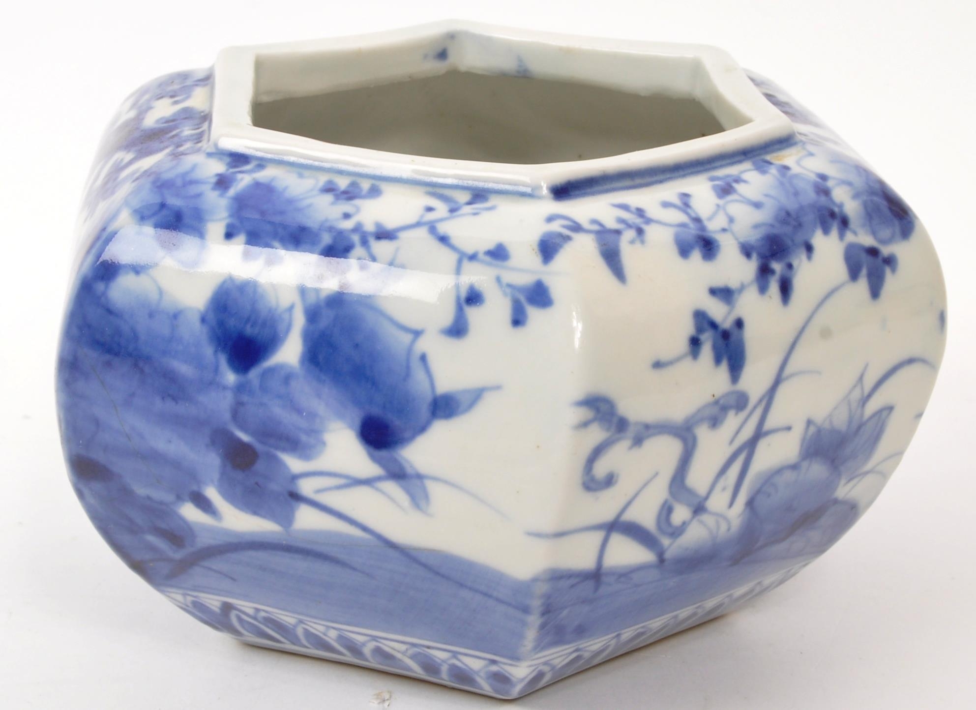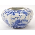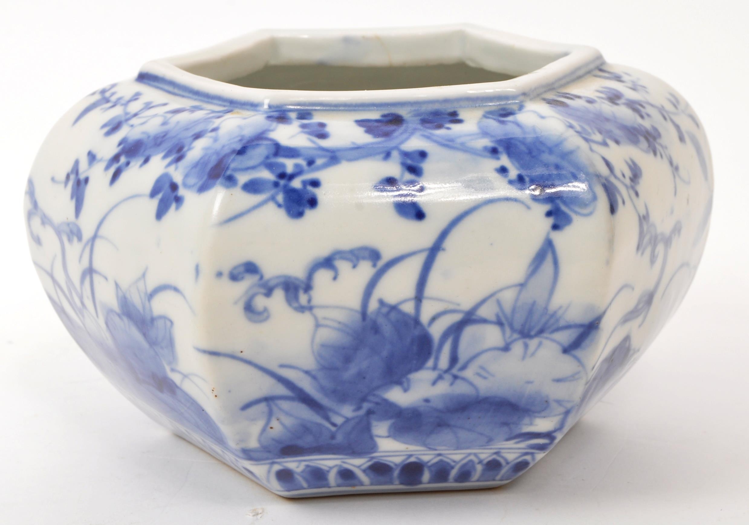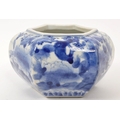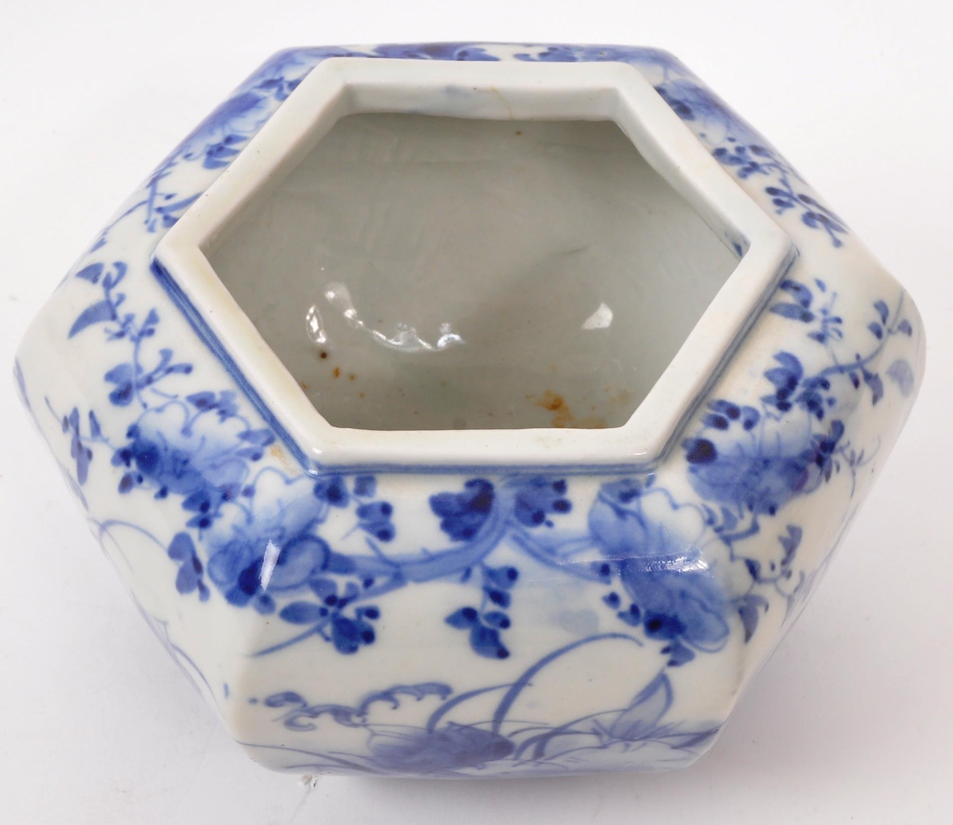 Early 20th century blue and white porcelain china Chinese planter / water bowl / pot. Hexagonal shape with transfer print of foliate and floral design. Measures approx. 10cm x 16cm