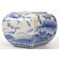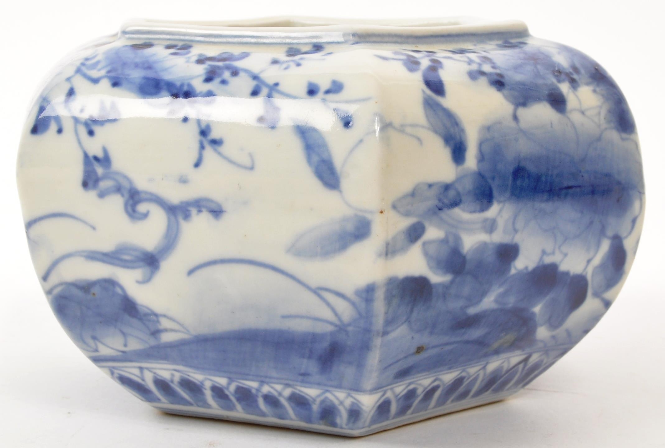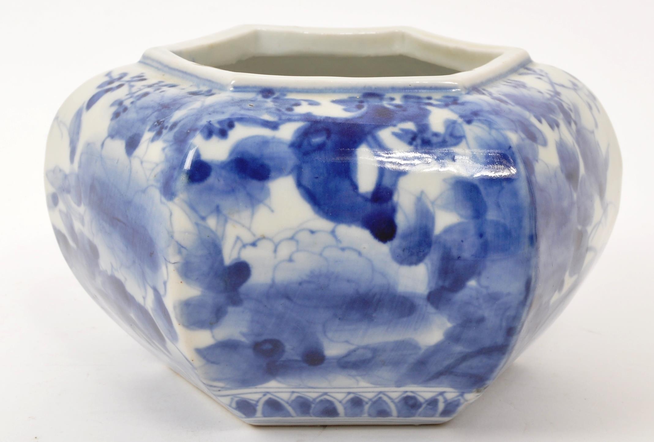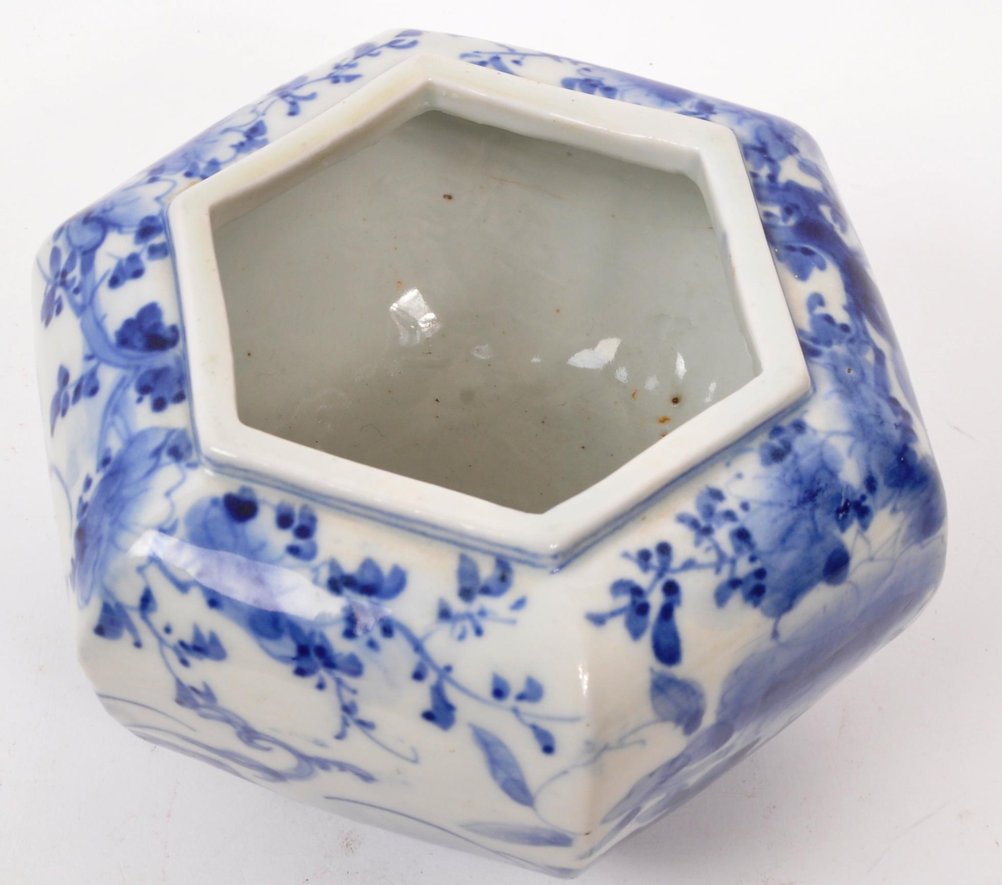 Early 20th century blue and white porcelain china Chinese planter / water bowl / pot. Hexagonal shape with transfer print of foliate and floral design. Measures approx. 10cm x 16cm
