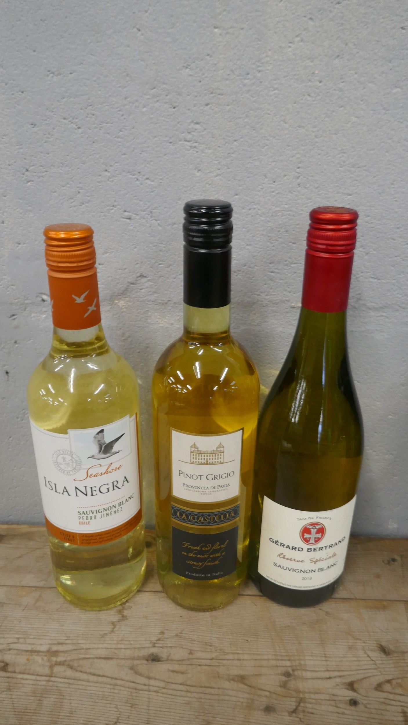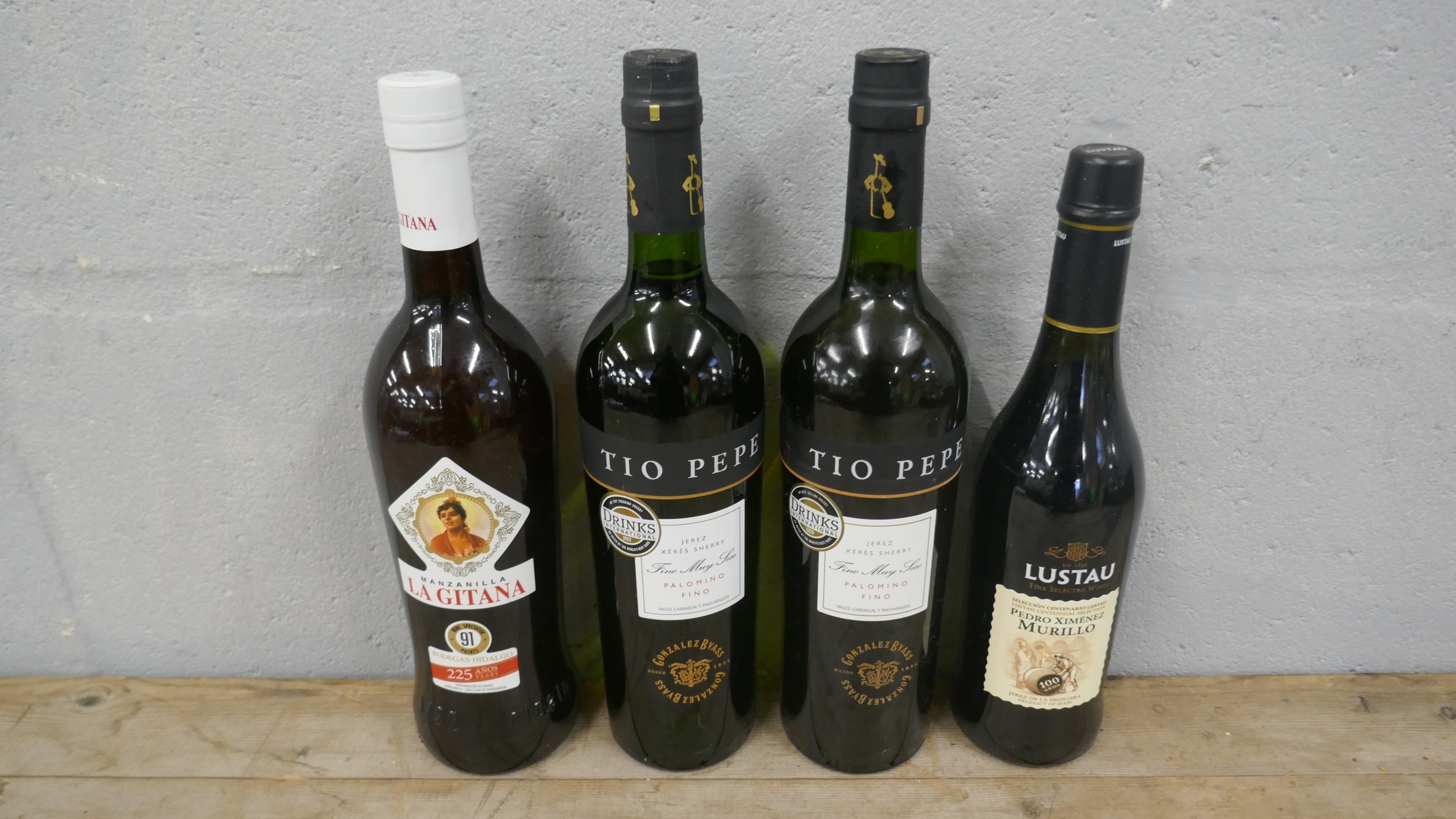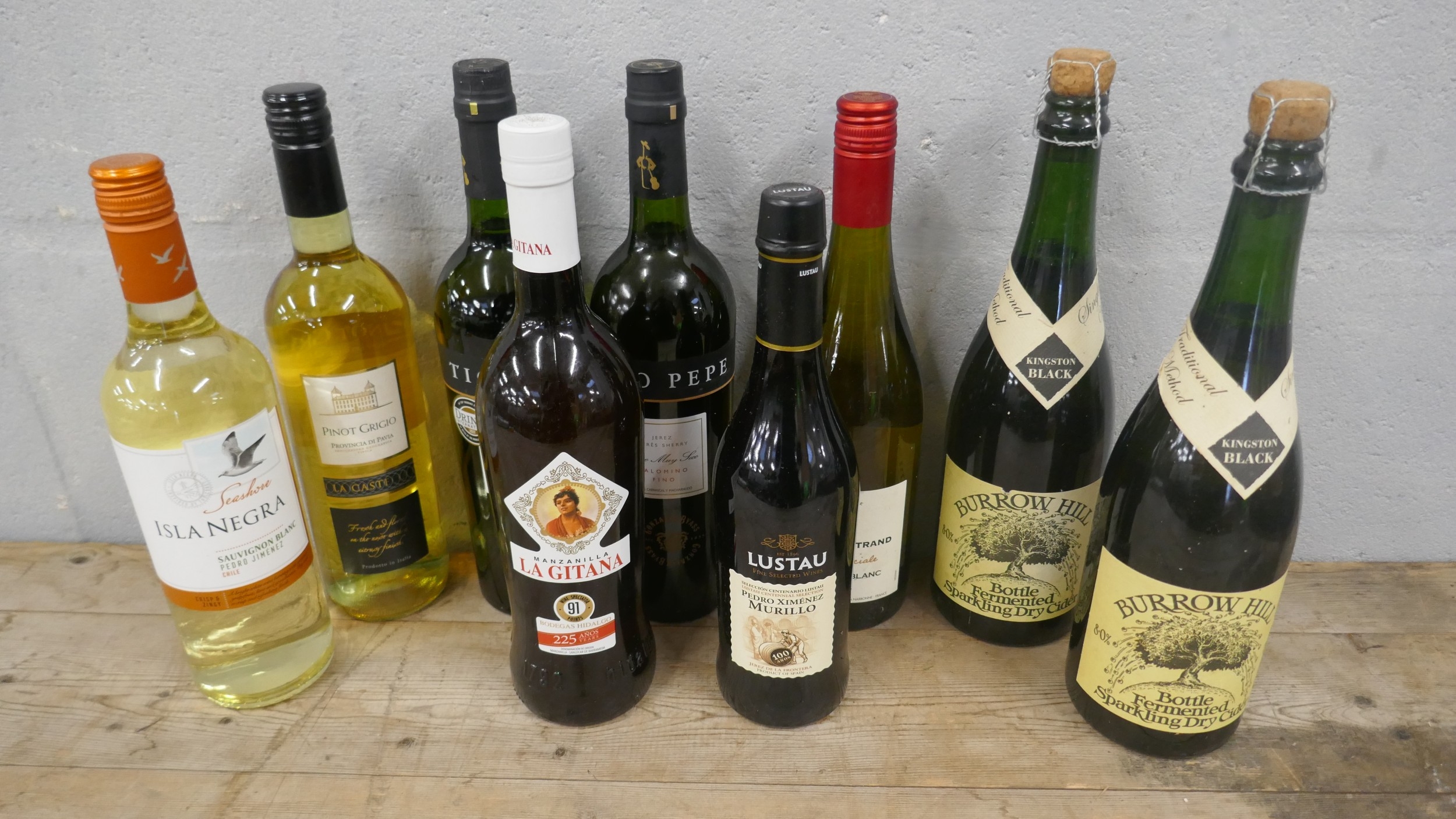 Nine bottles of assorted alcohol including Tio Pepe, Isla Negra, La Castella Pinot Grigio, La Gitana, Lustau Murillo, Sauvignon Blanc and Burrow Hill