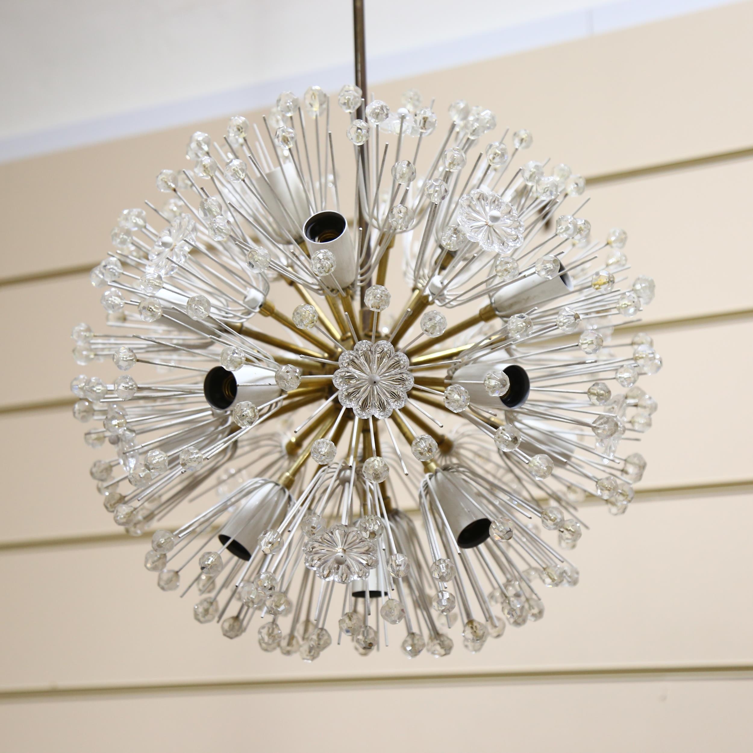Emil Stejnar for Rupert Nikoll, Austria, a 1950s' designed Sputnik or Dendelion candelabra, with brass stem and frame and mounted glass beads and flowers, 17 light fittings, approx height 75cm, diameter 45cm