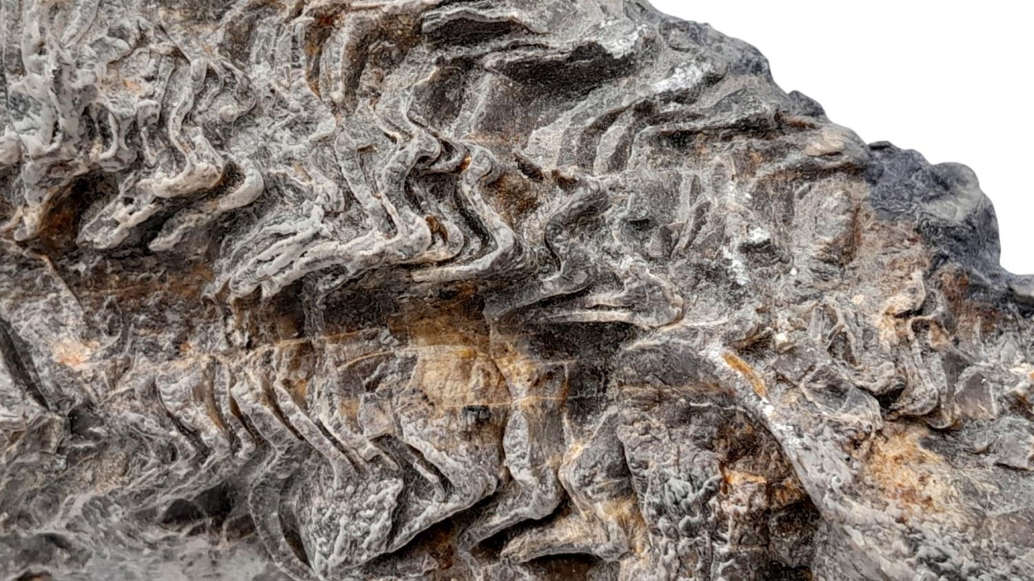 valve slightly asymmetrically domed, the right valve ribbed with strongly folded lamellae. A good representative of