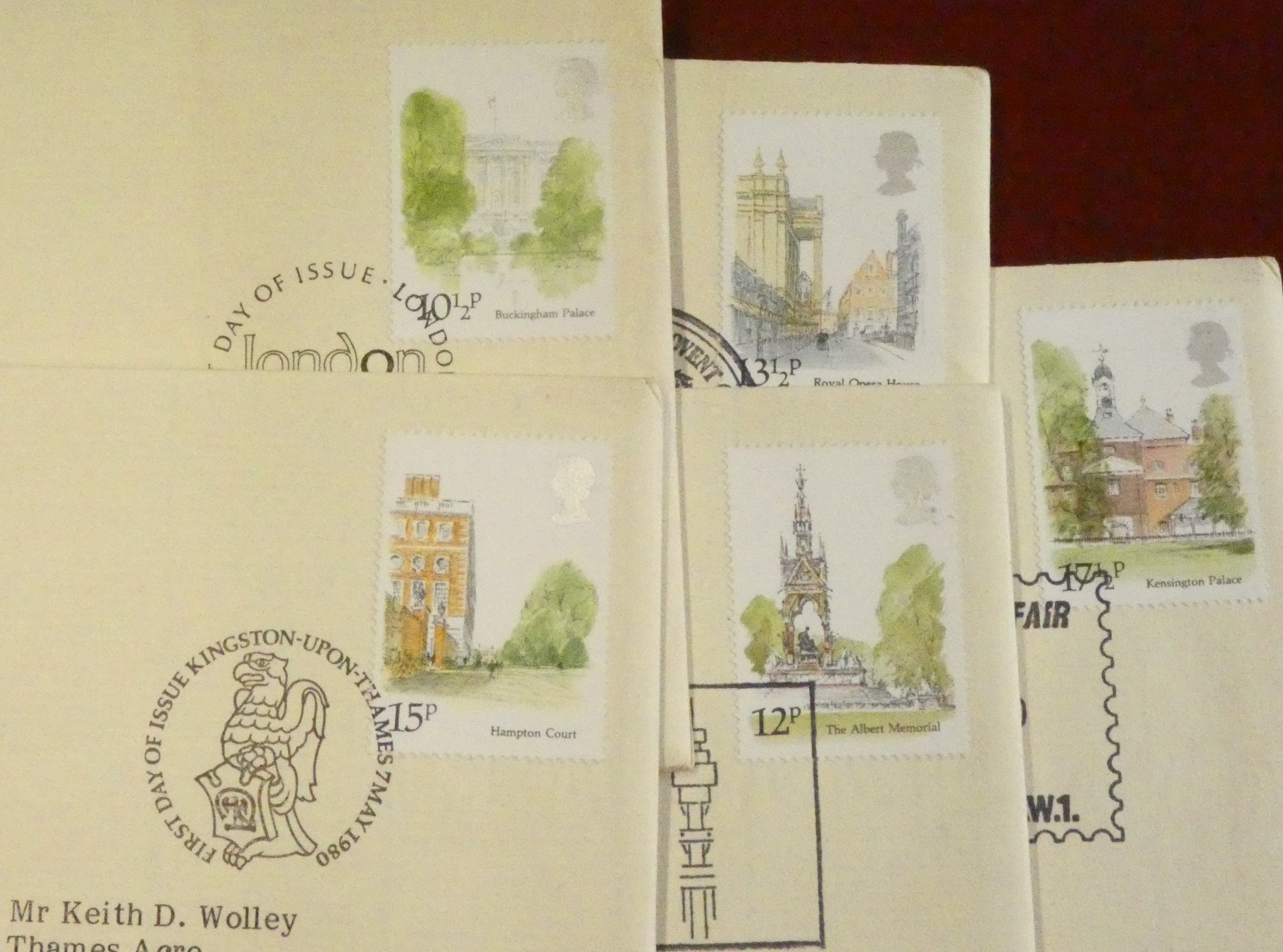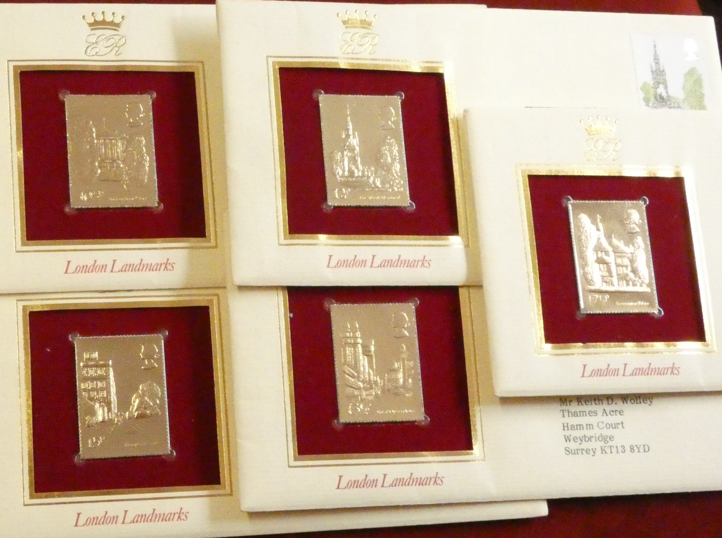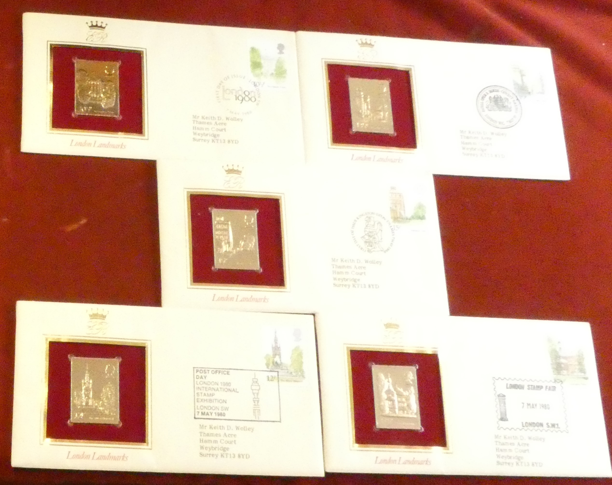 GB FDCs 1980 London Landmarks set on five FDCs each with gold ingot replica of the stamp. Scarce series.