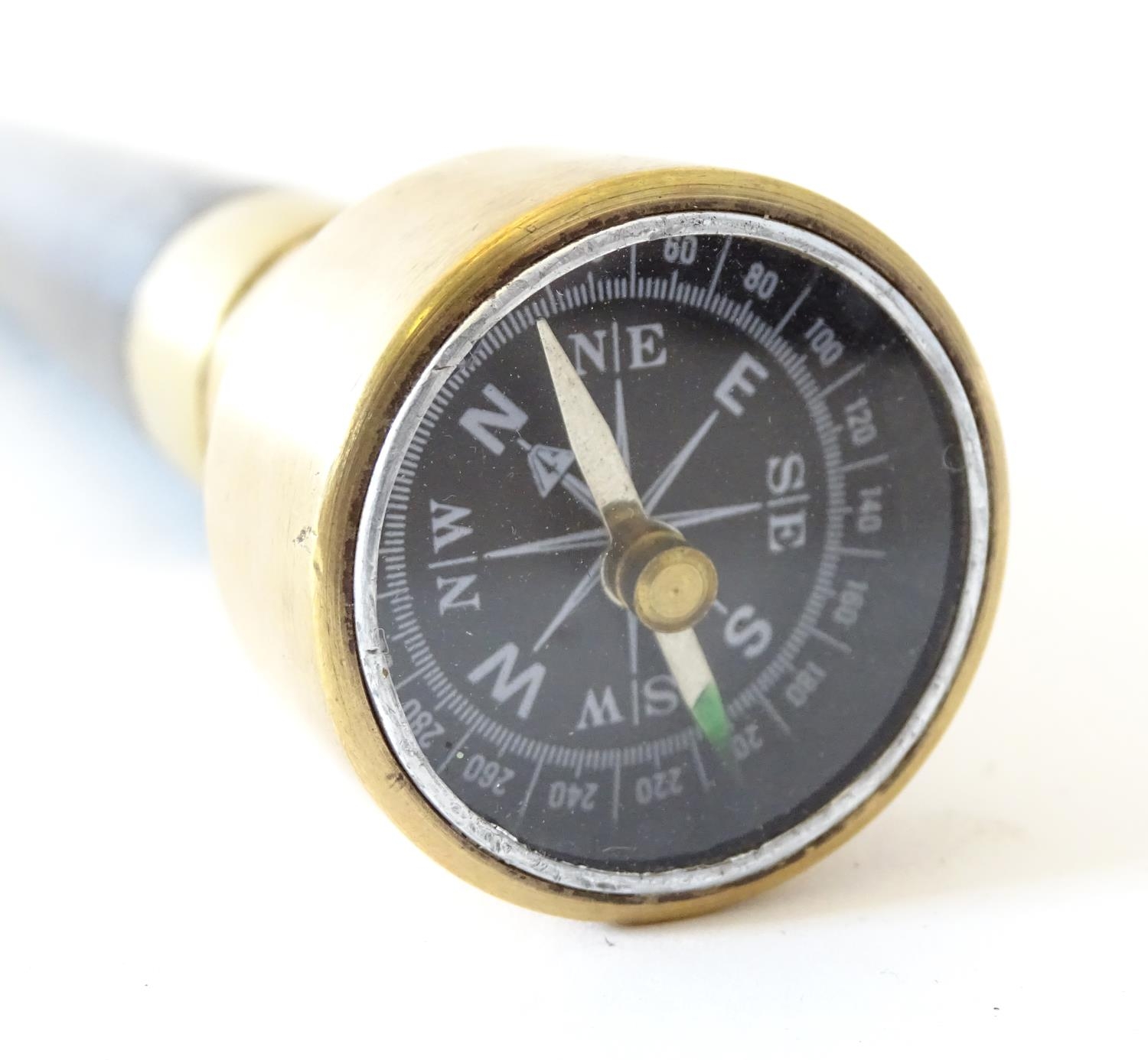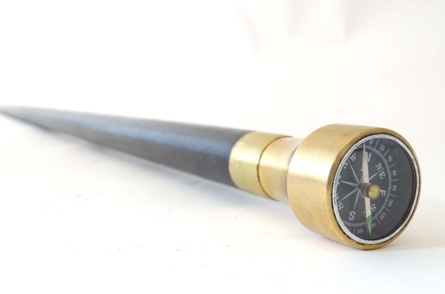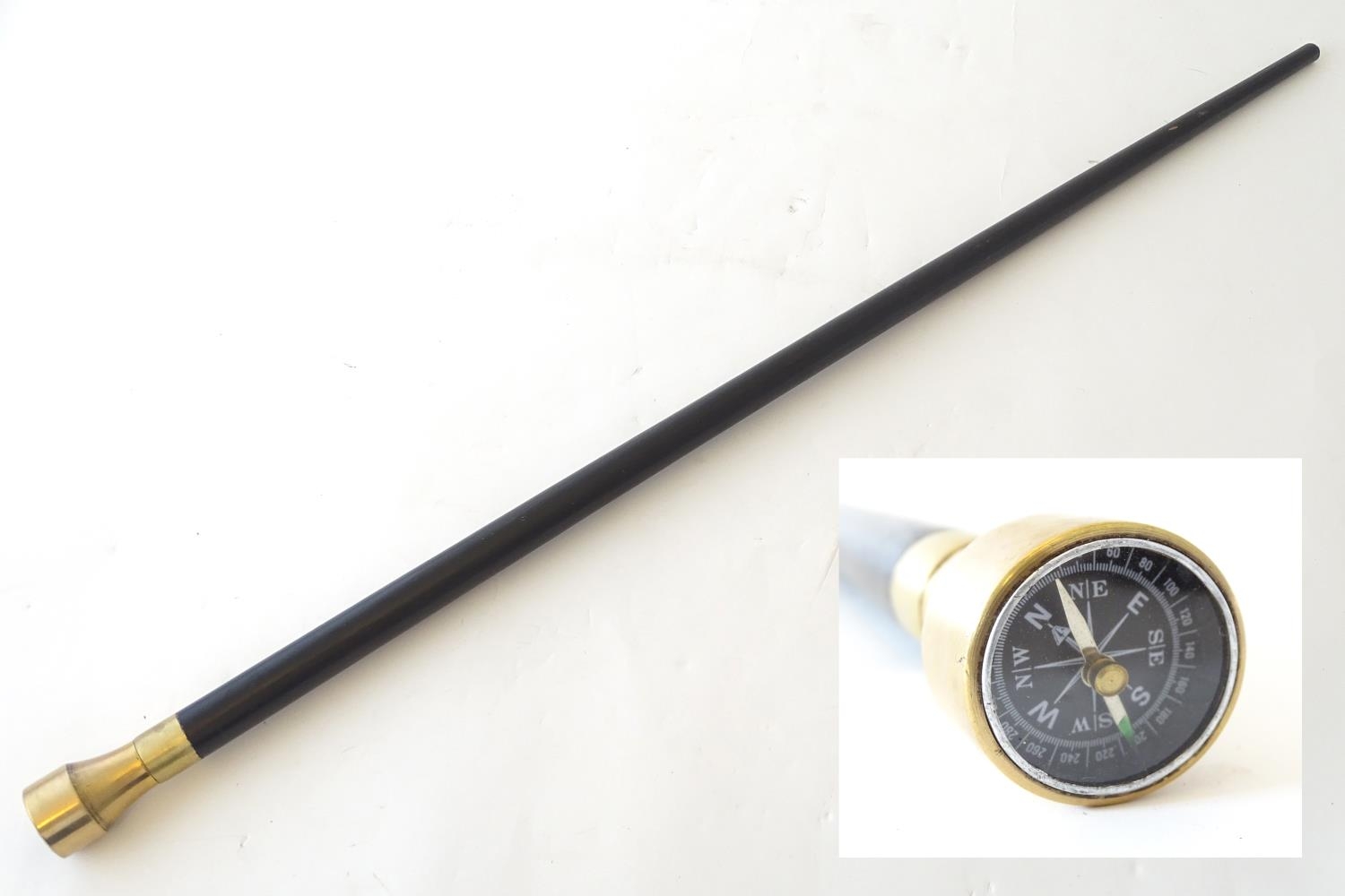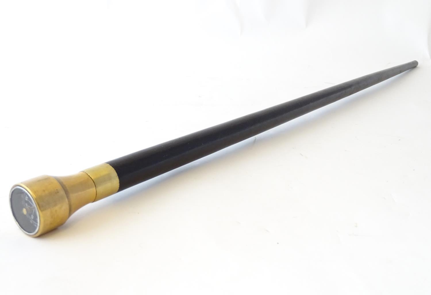 A walking cane with an ebonised shaft, the metal pommel with inset compass. Approx. 34 1/4"