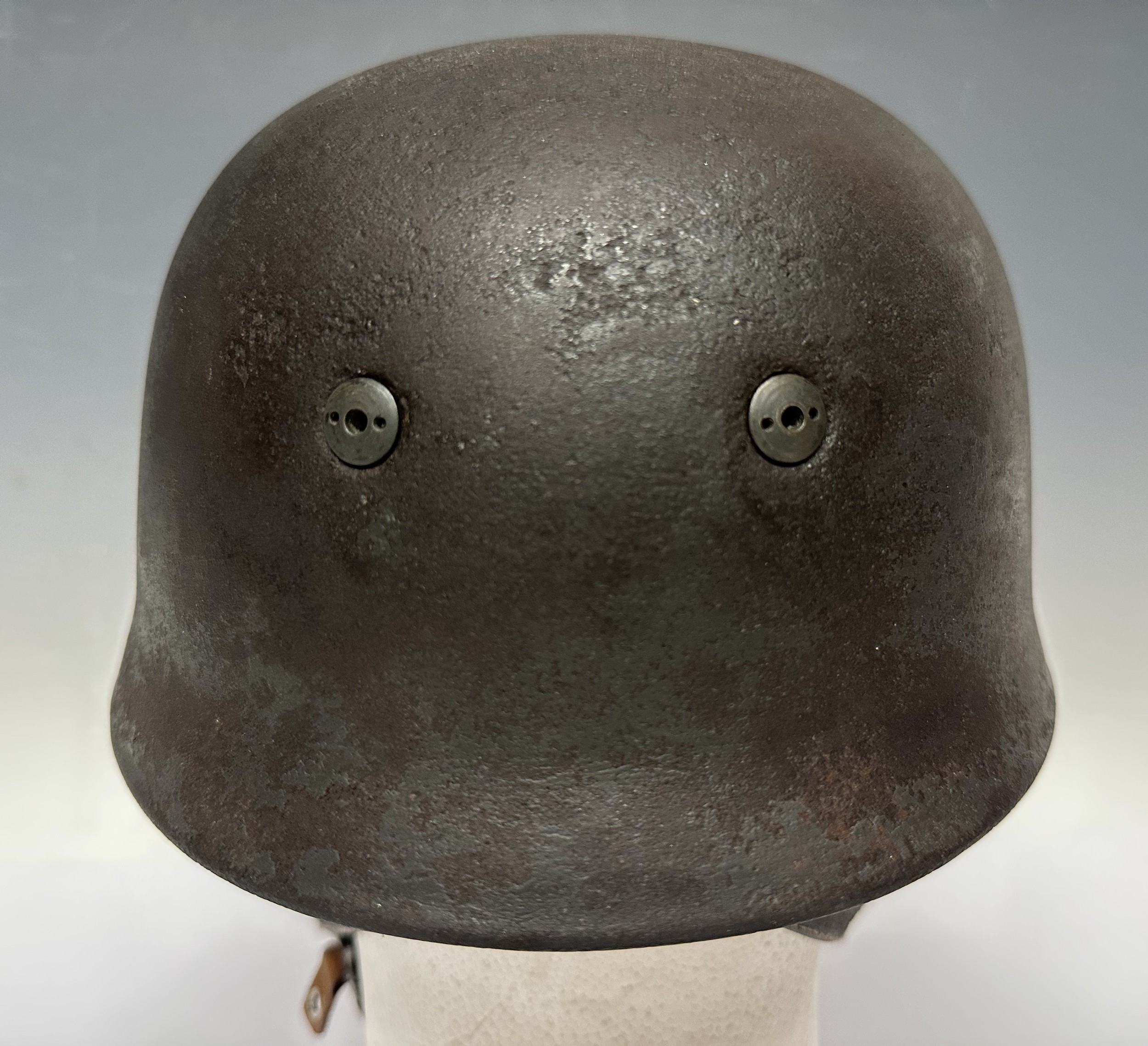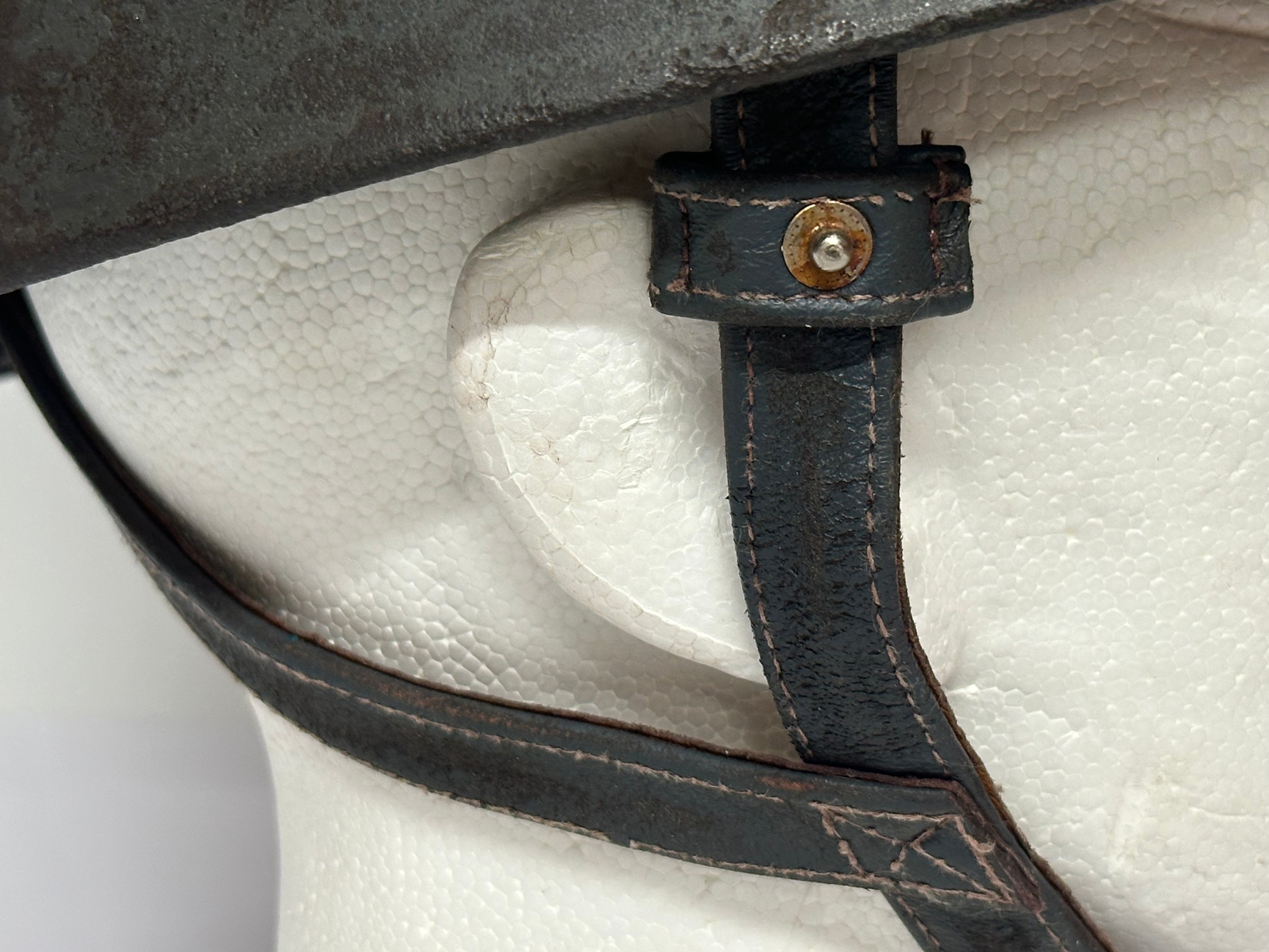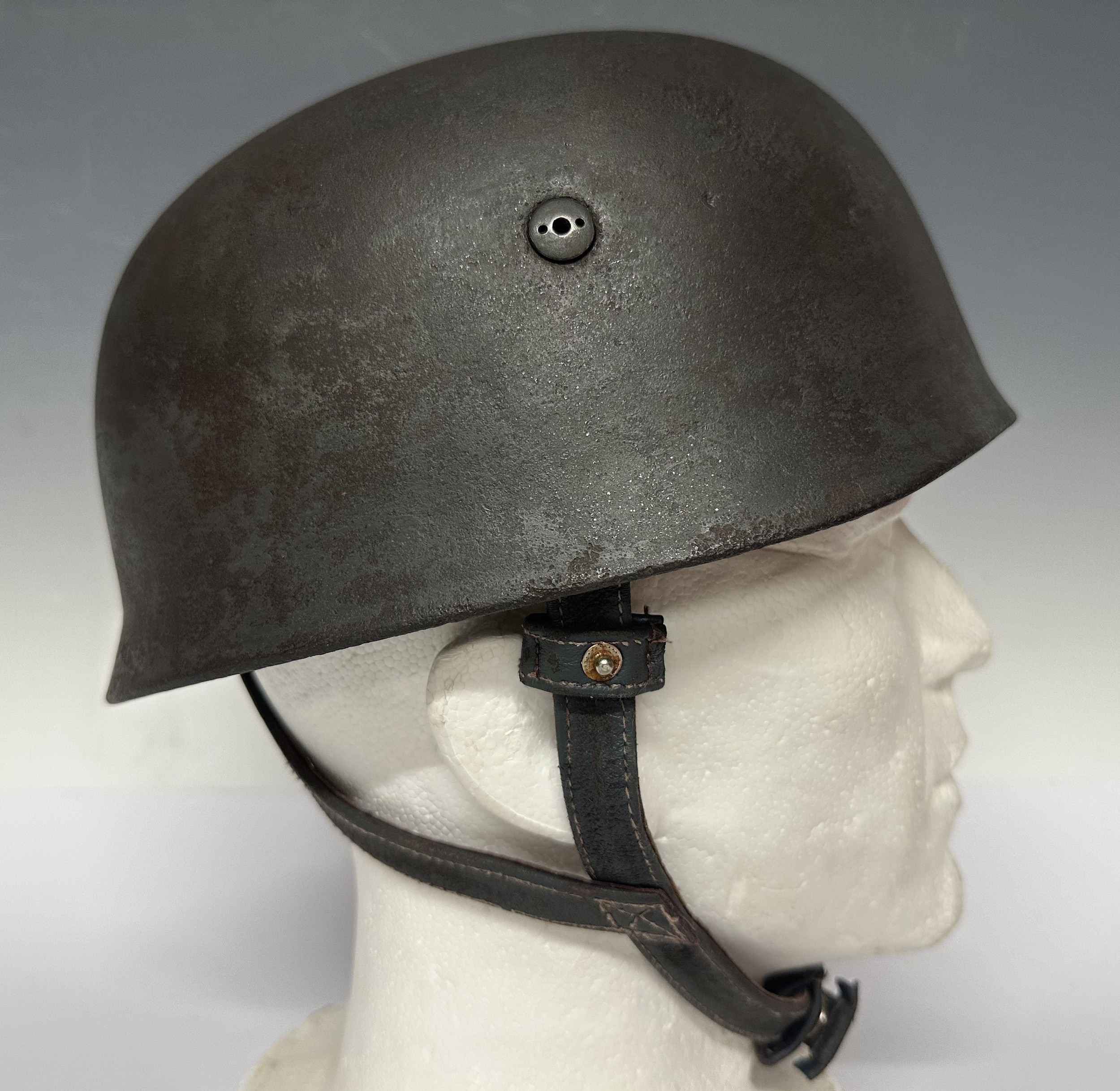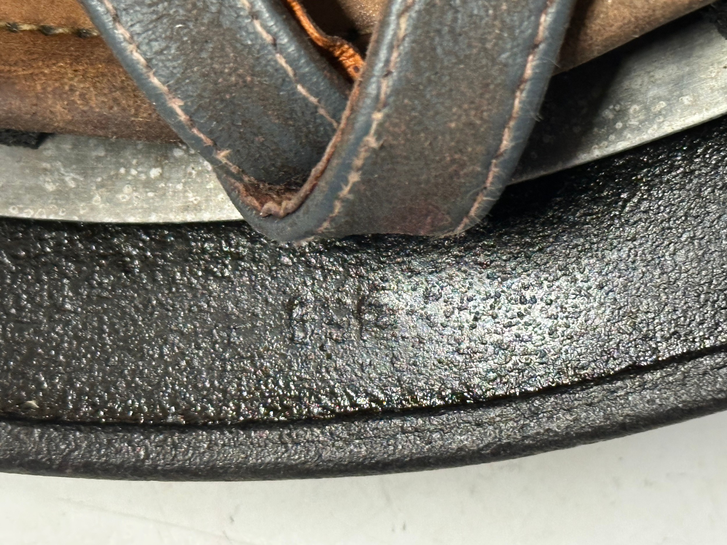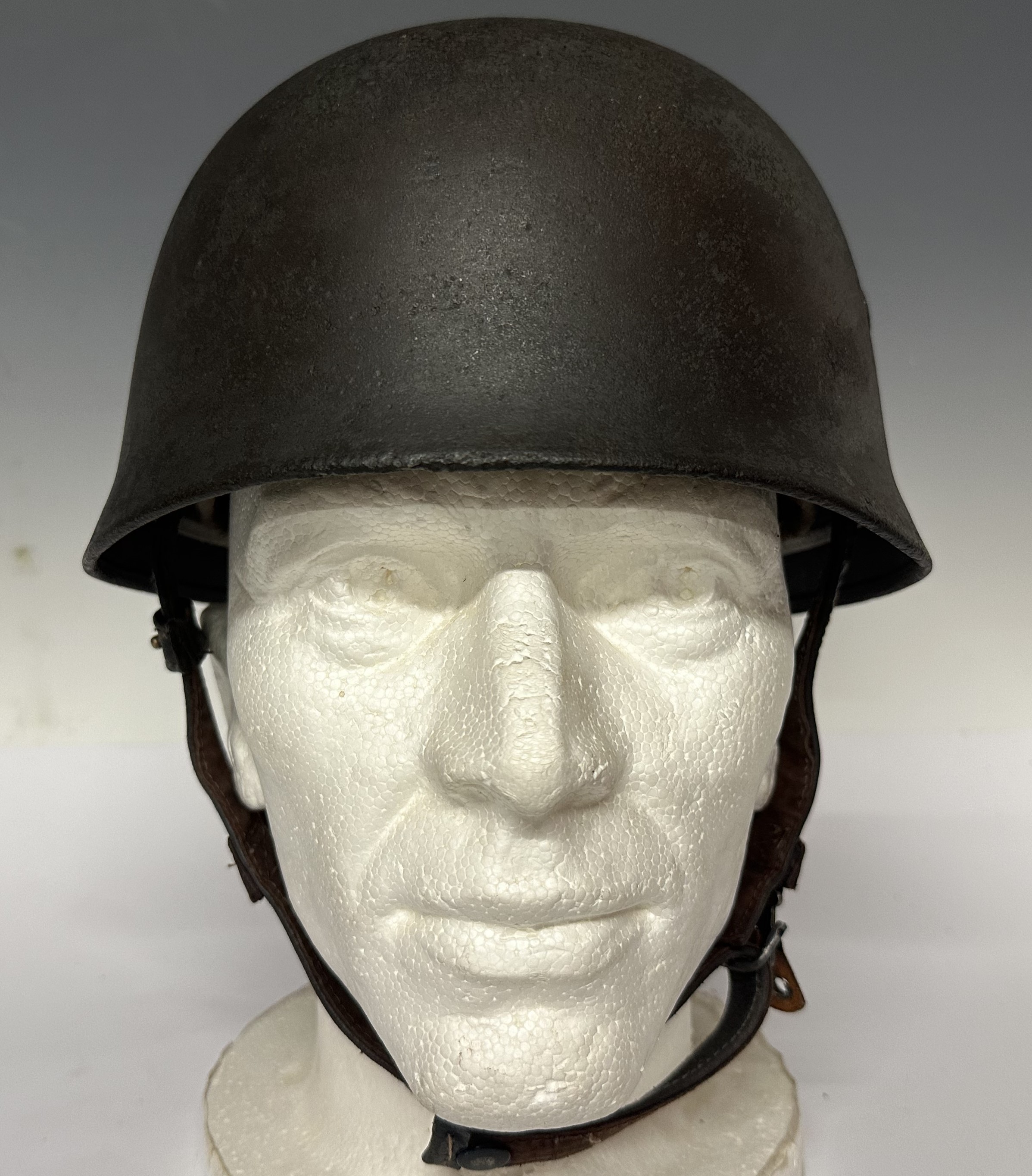 Good restored condition. Rust pitting overall inside and out to the shell. Traces of original paint. Repro chinstraps.