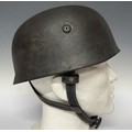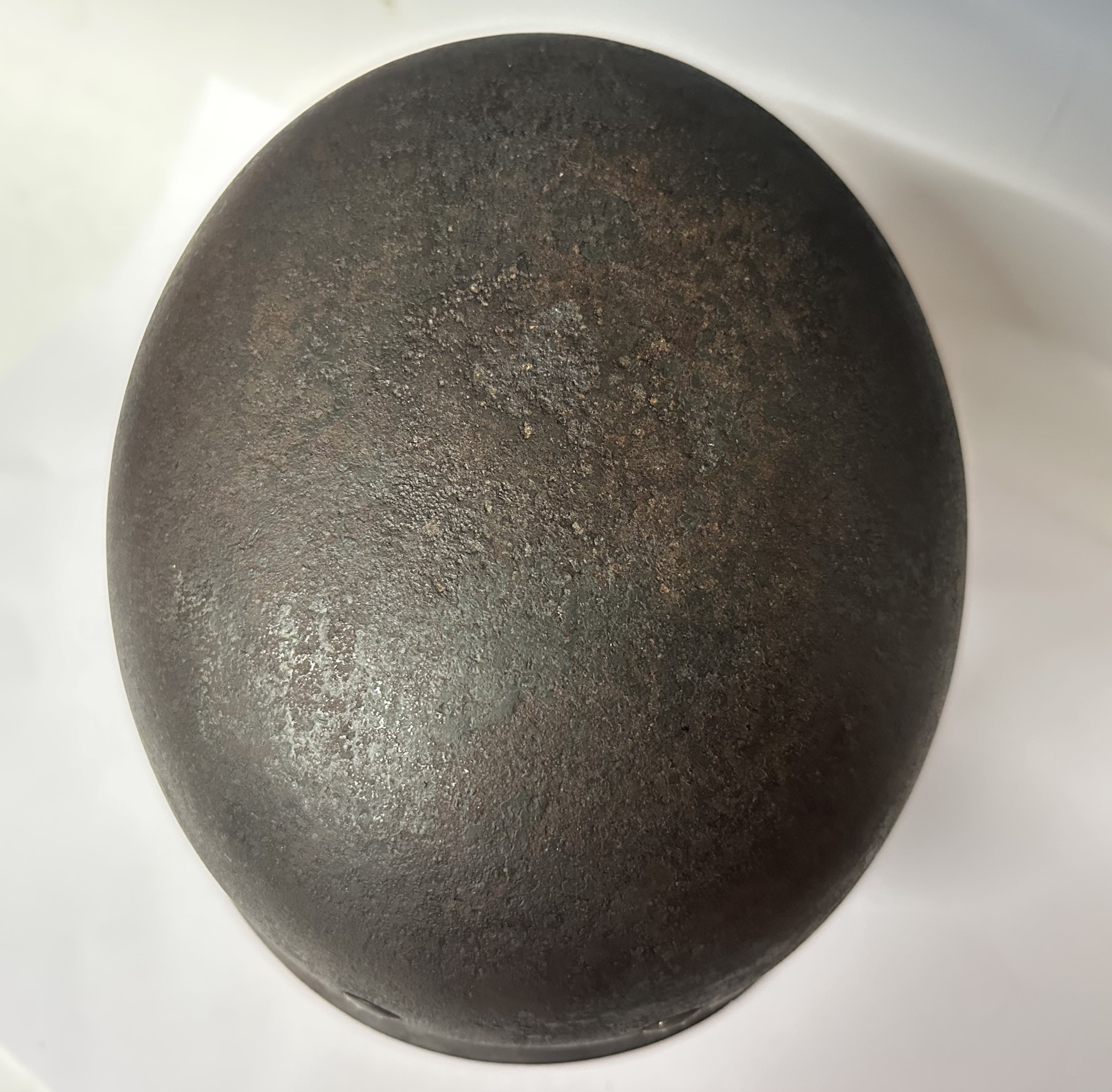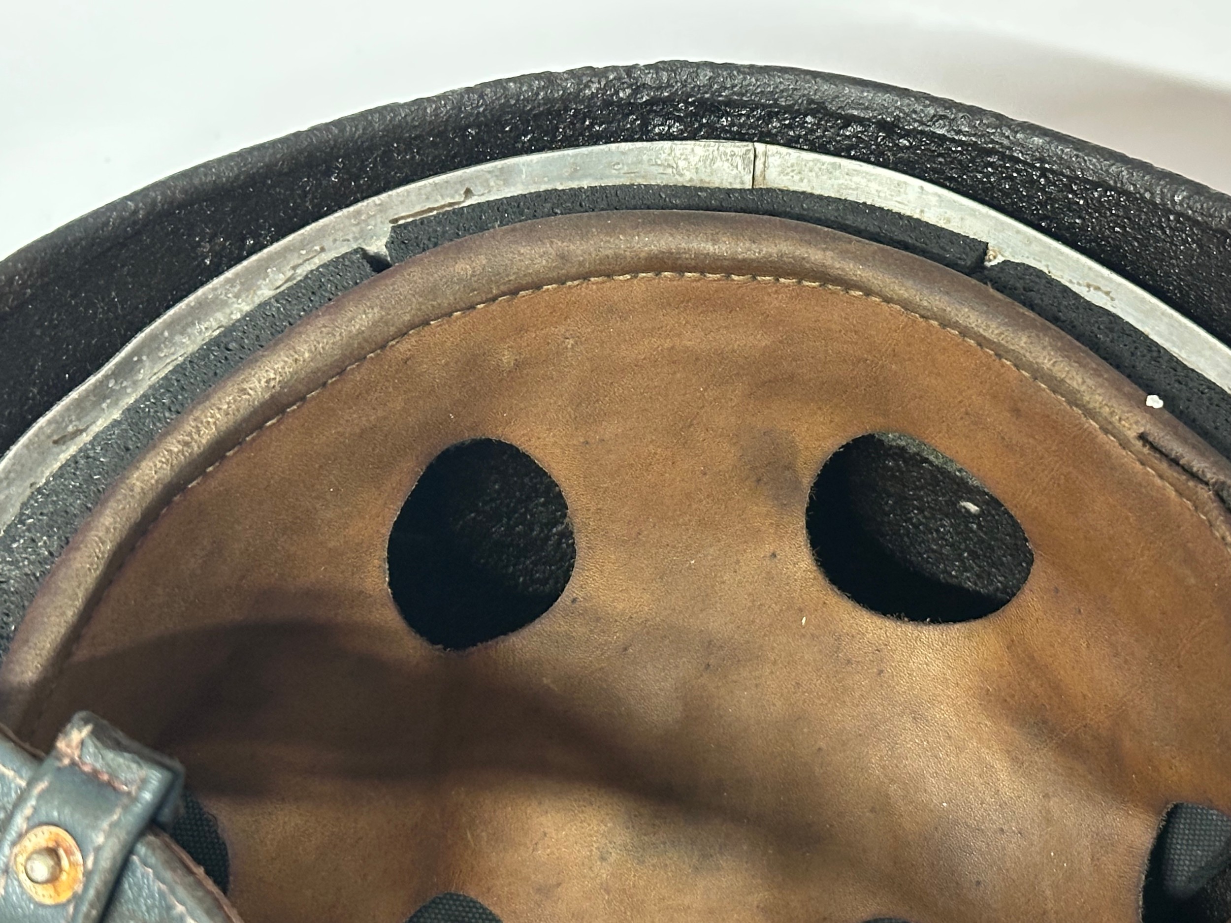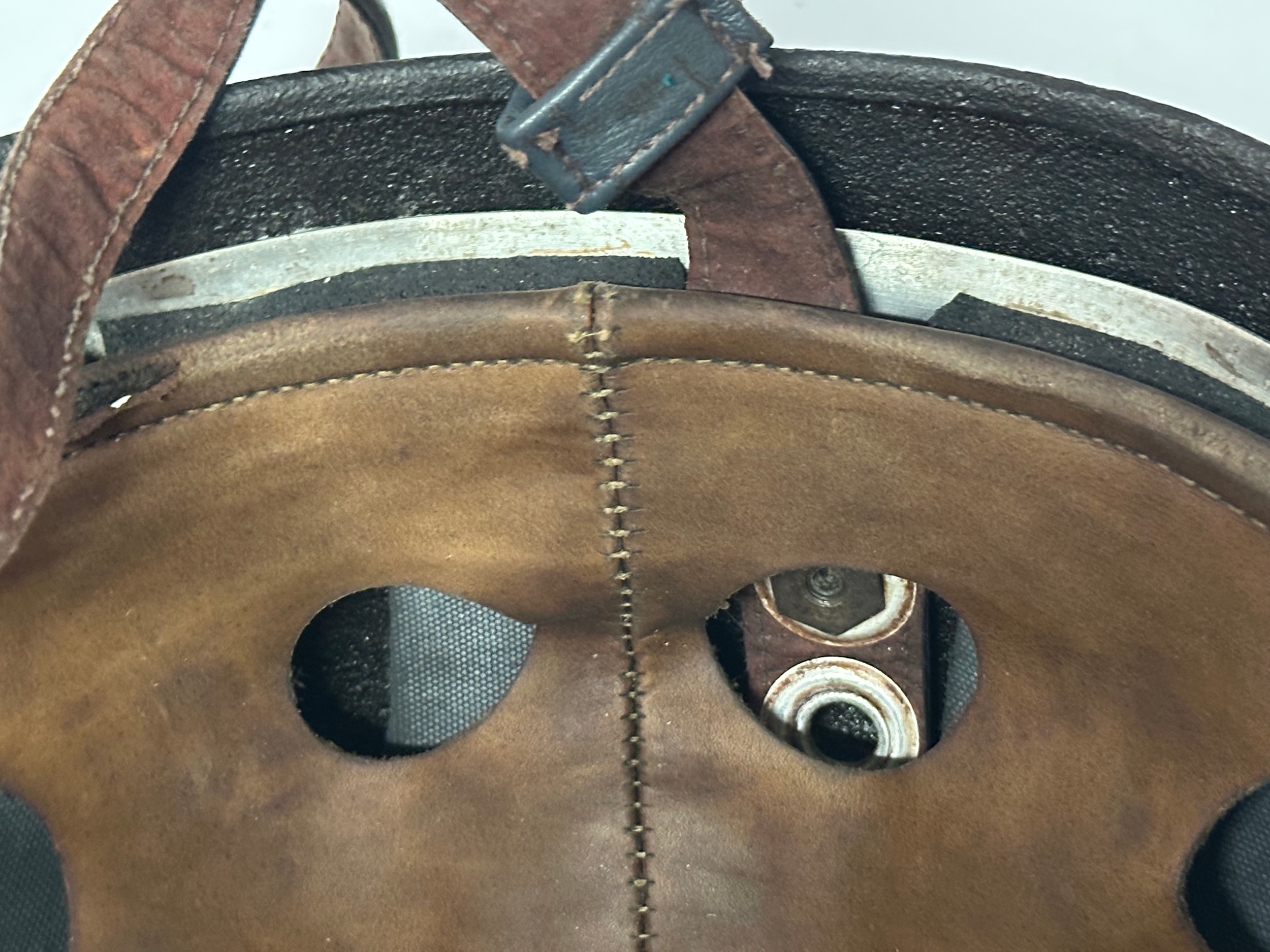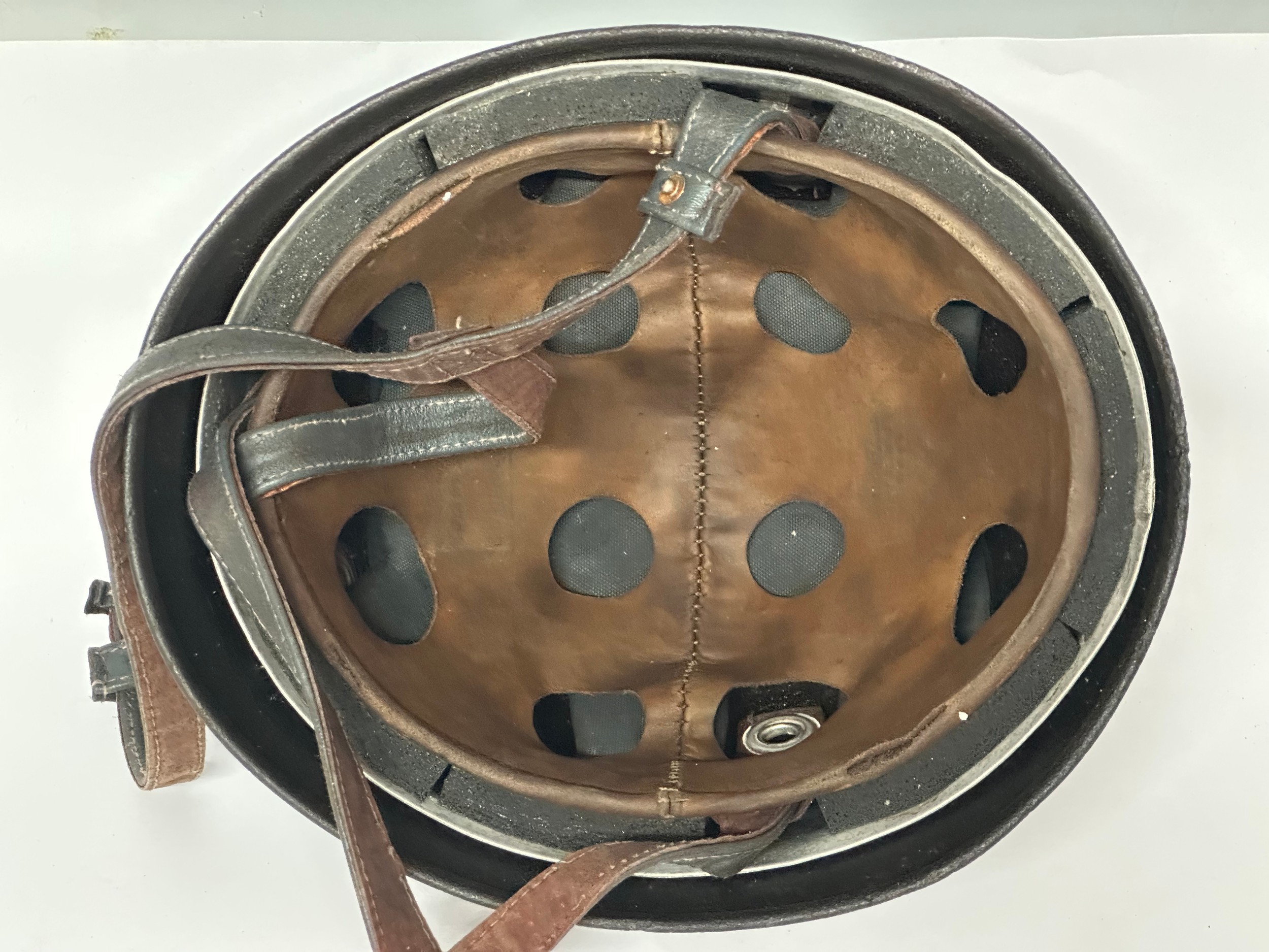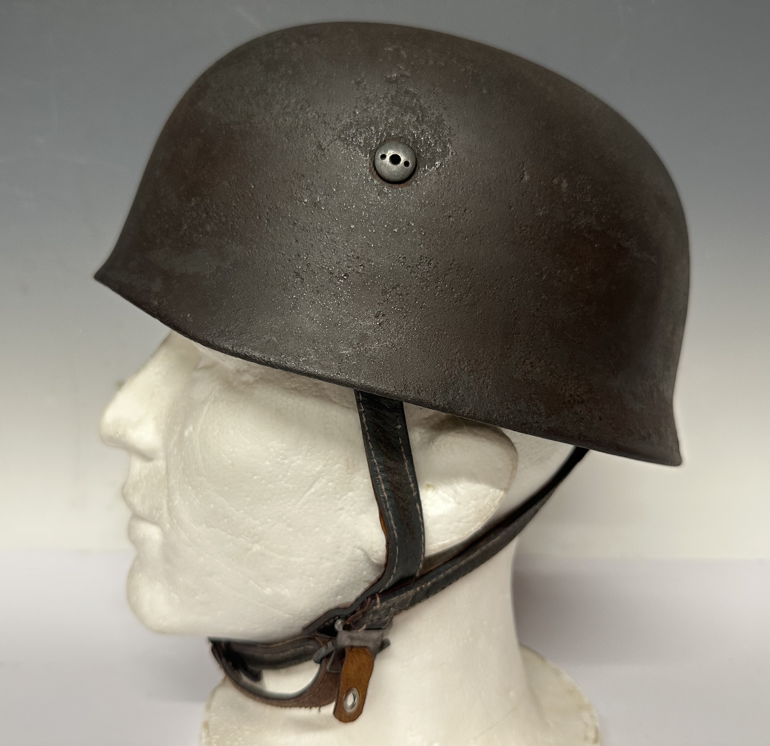 Good restored condition. Rust pitting overall inside and out to the shell. Traces of original paint. Repro chinstraps.