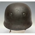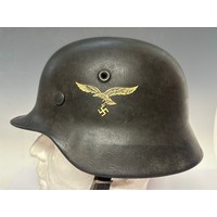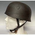 WW2 Third Reich Luftwaffe Fallschirmjager Steel Helmet in restored condition. Original shell with light rust pitting and traces of original paint. Early pattern spanner bolts for liner. Maker and size marked "ET68". Lot number 69xx. Original liner band and liner which is faintly maker and size marked. Chinstraps are high quaility modern replacements.