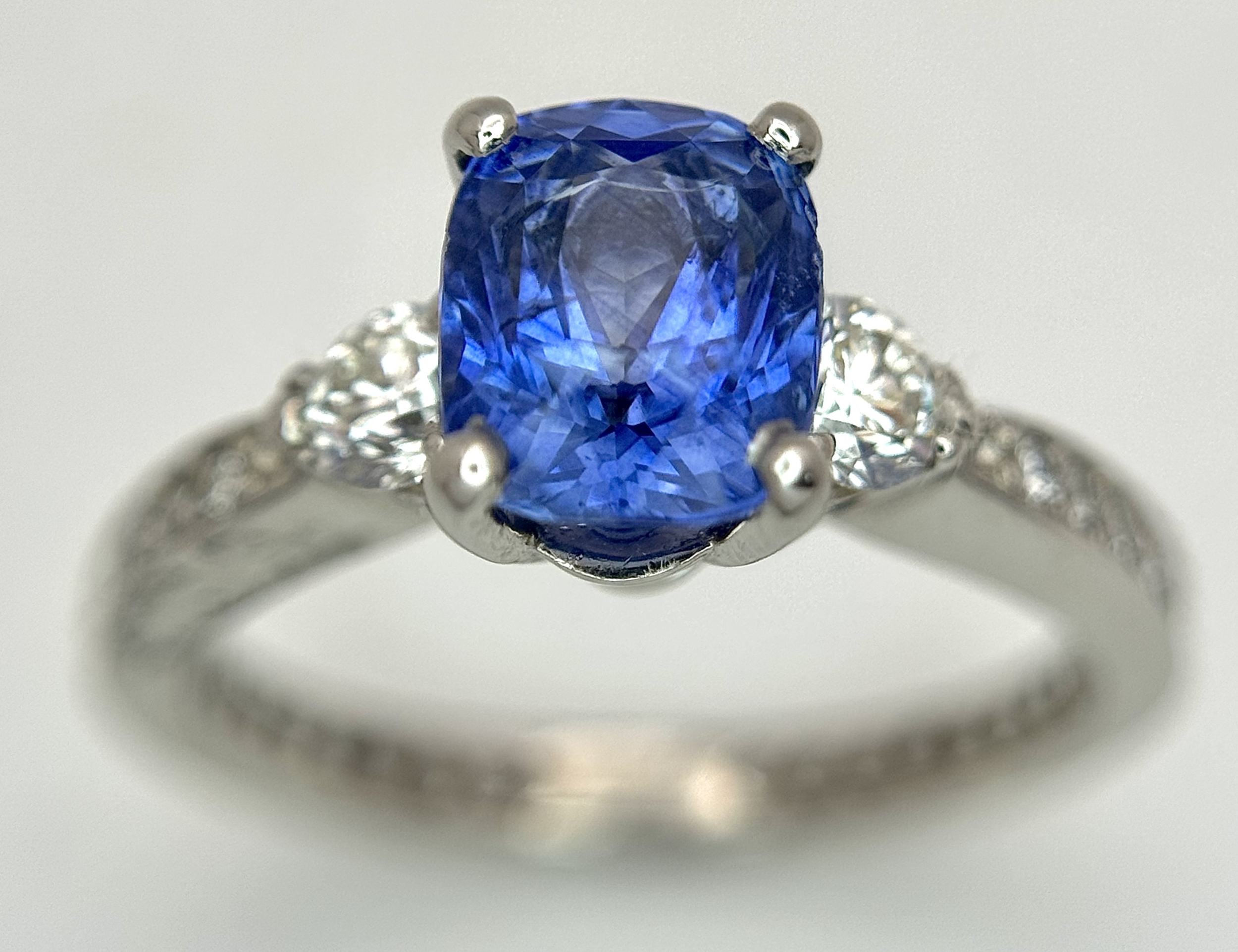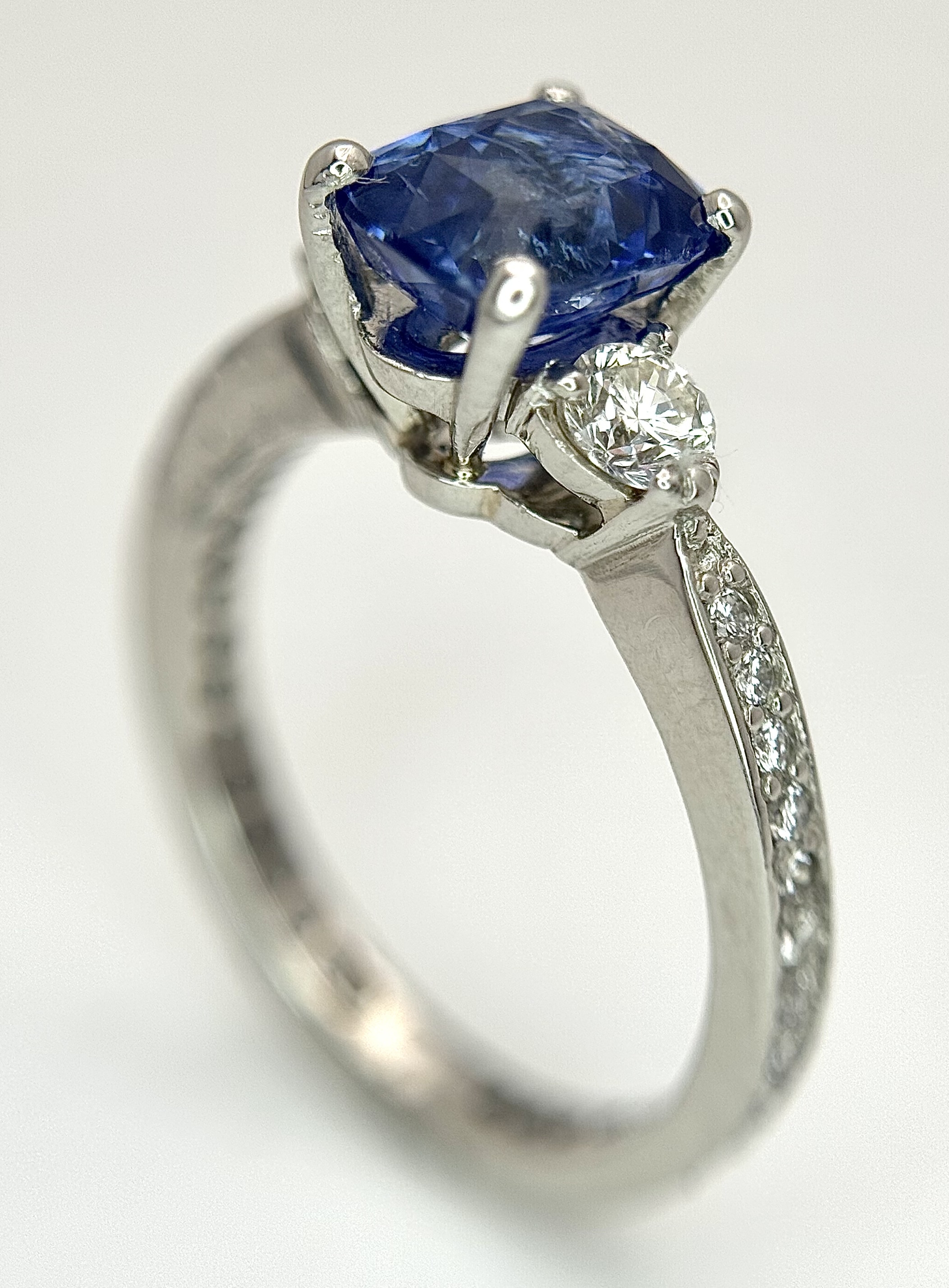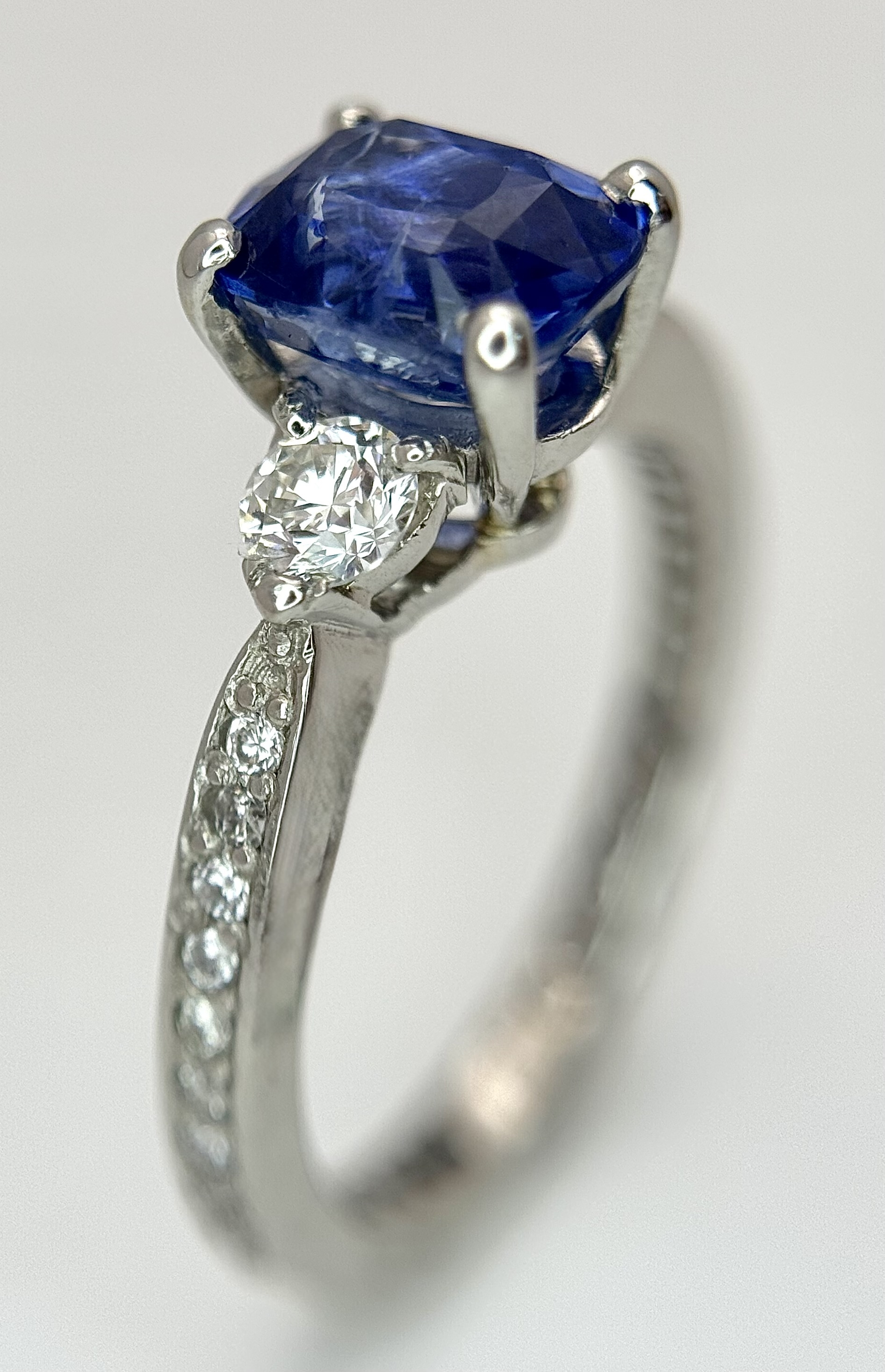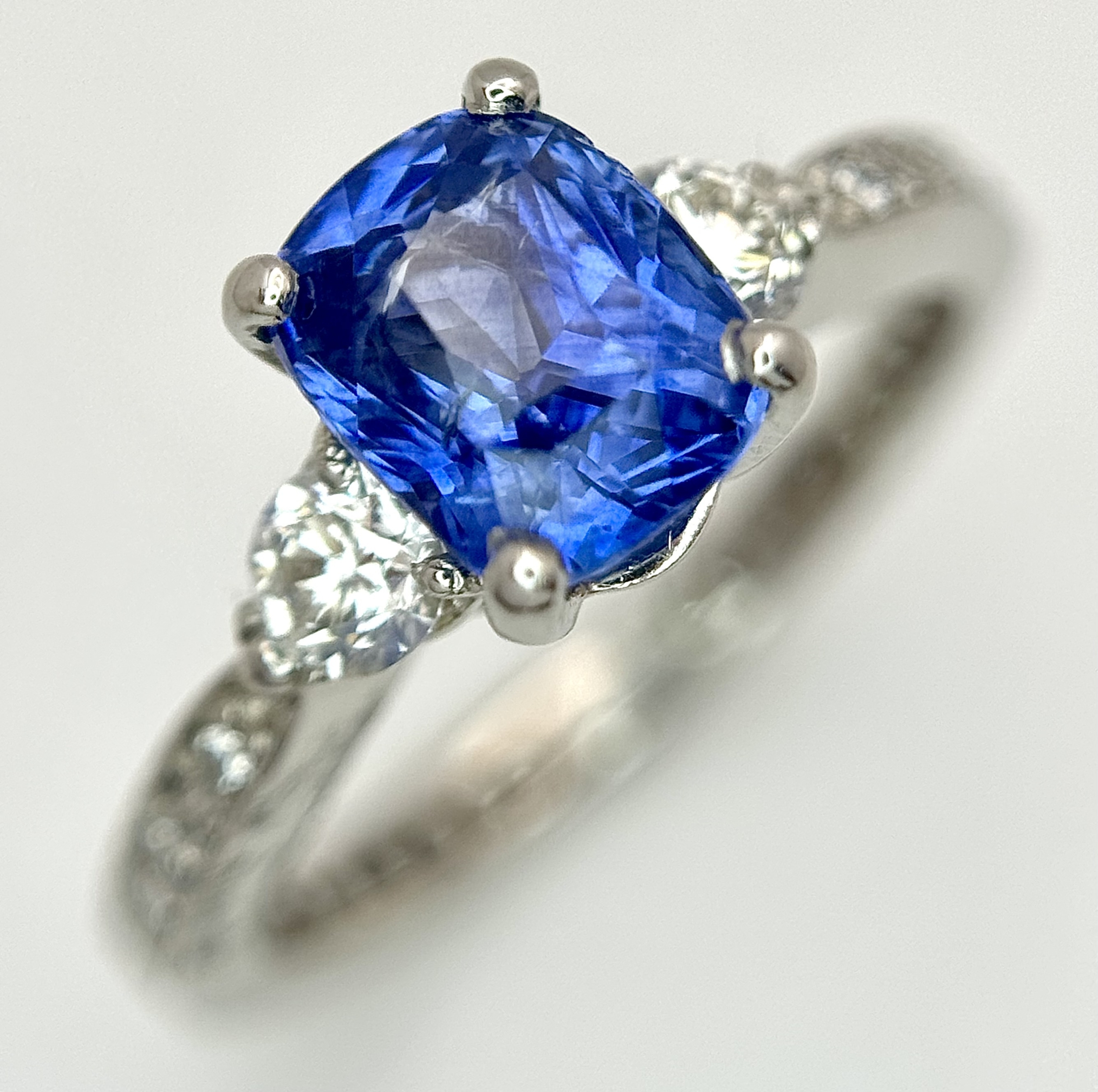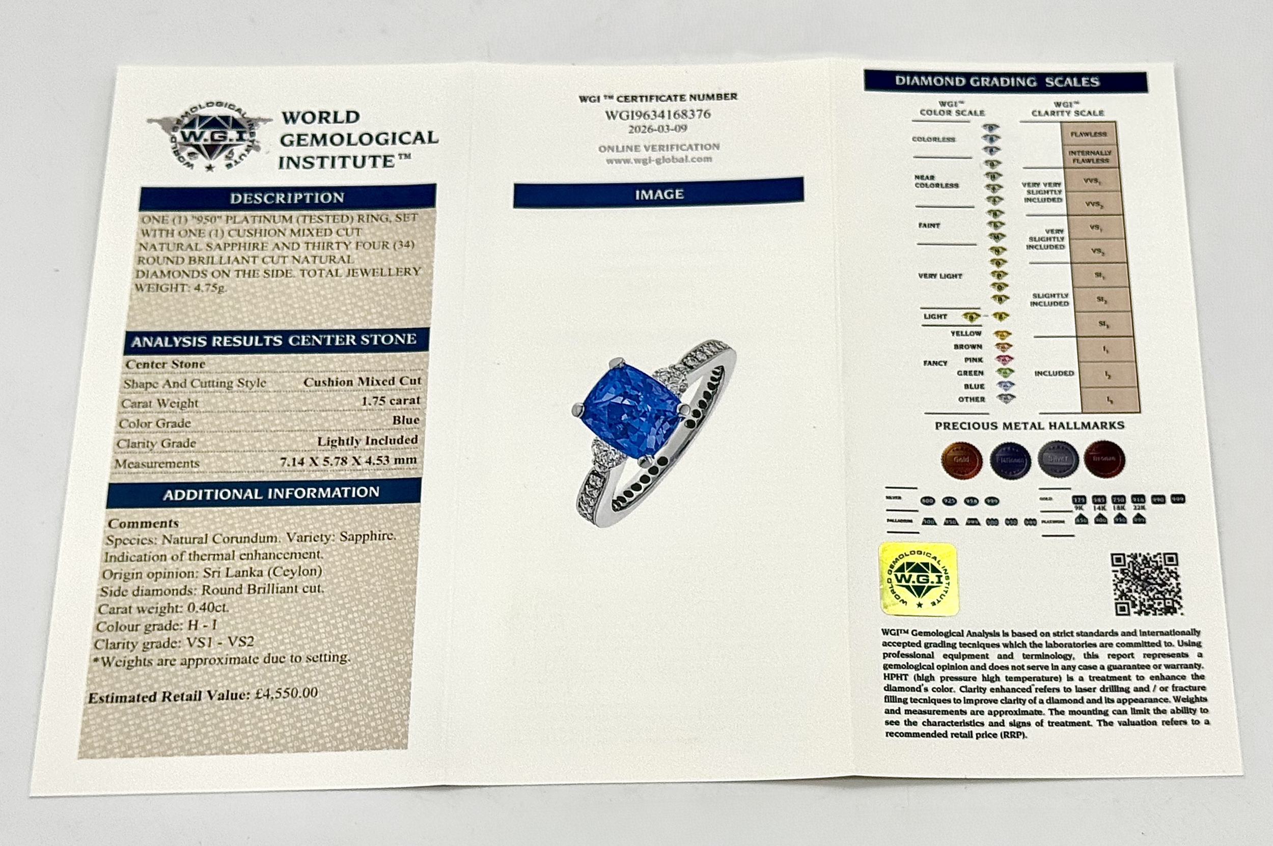 A Dazzling 950 Platinum Sapphire and Diamond Ring. A 1.75ct cushion mixed cut sapphire with thirty-four round brilliant cut diamonds either side. Size K - K 1/2. 4.75g total weight. Comes with WGI certificate. Ref: 9/36356