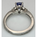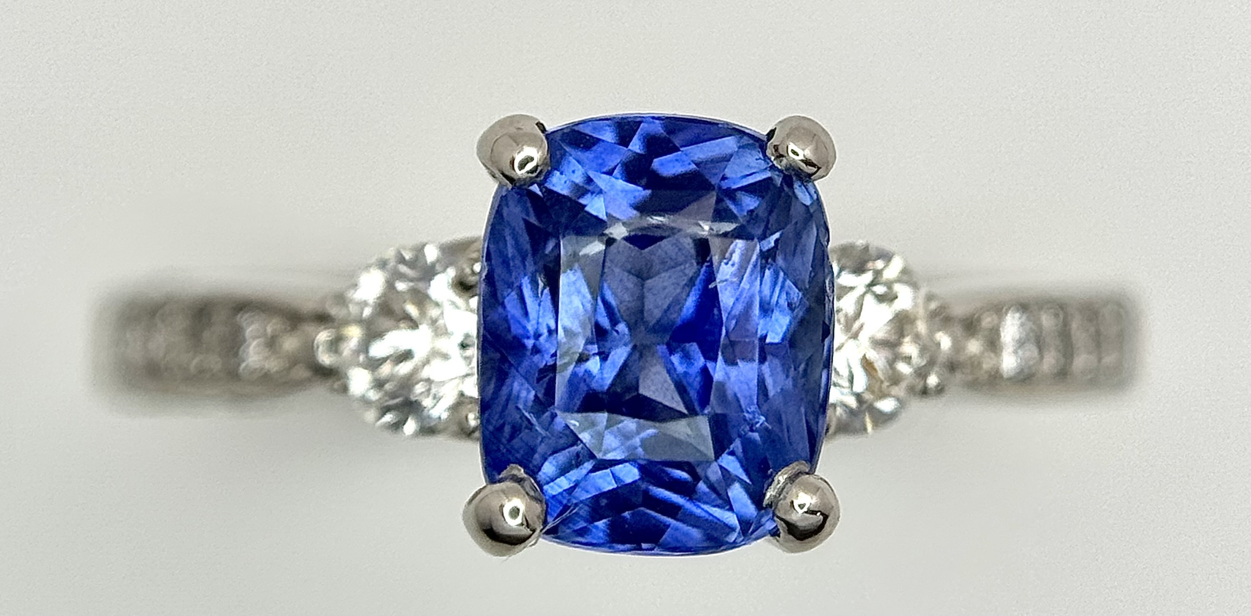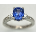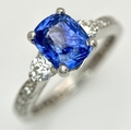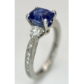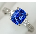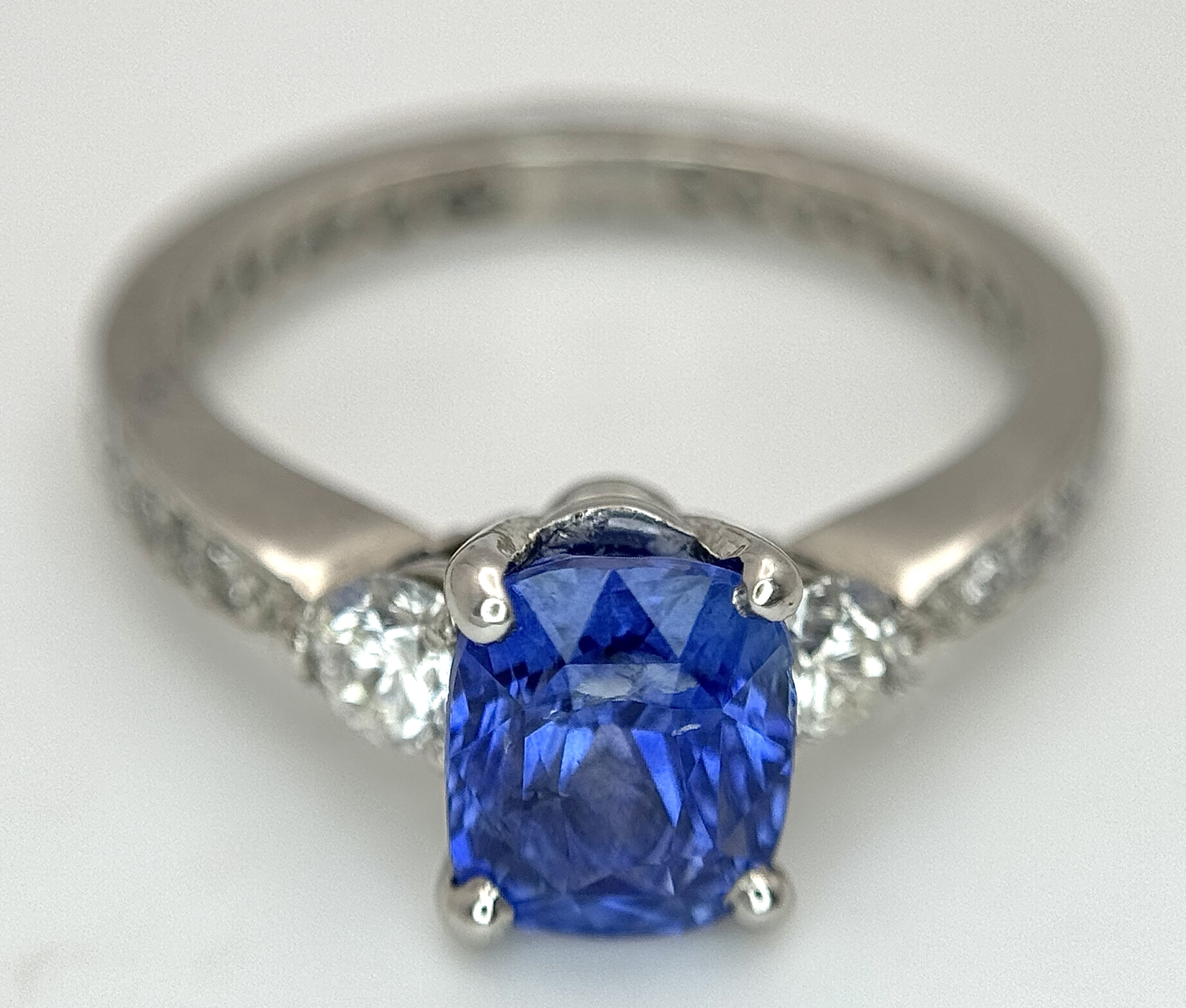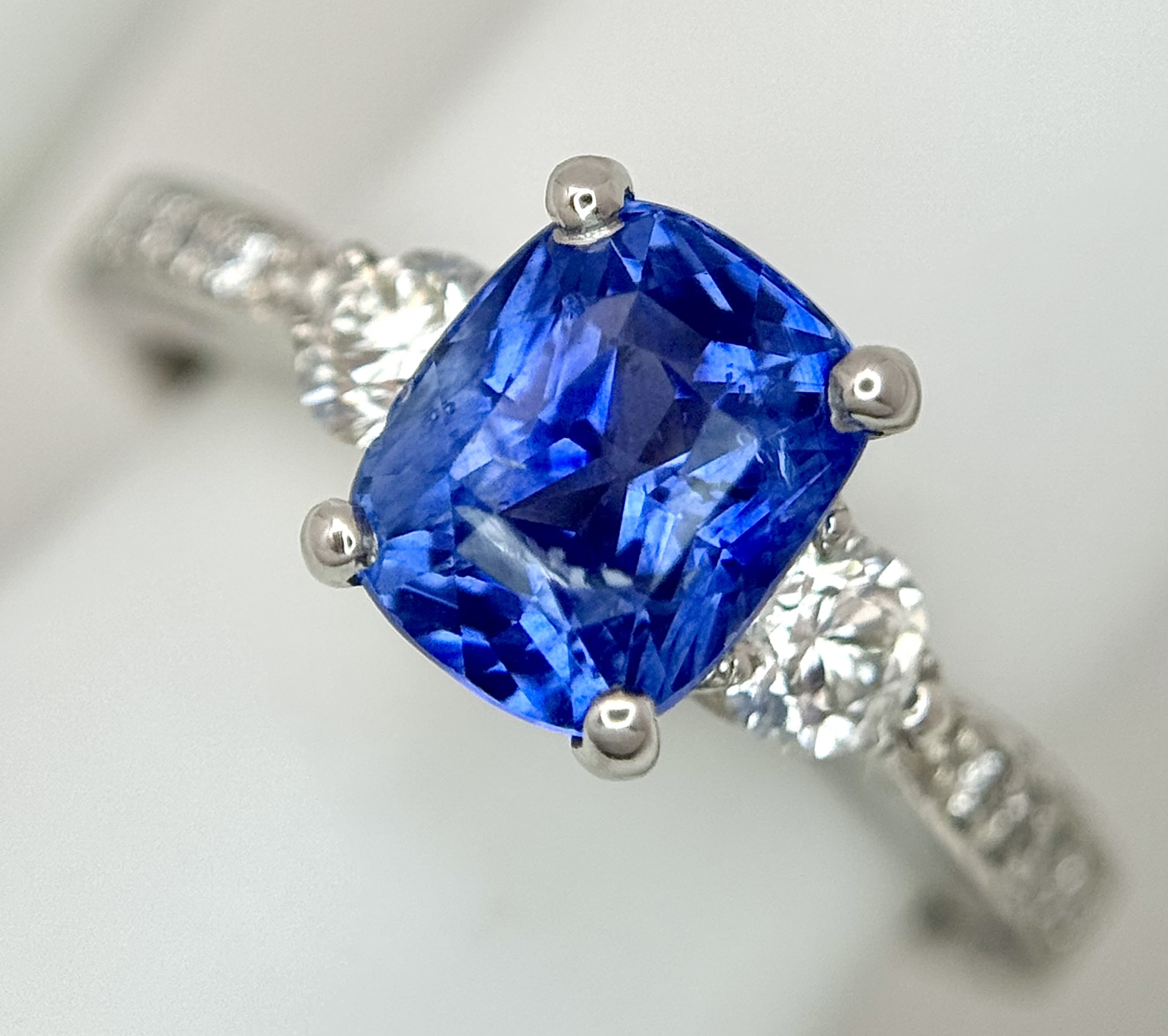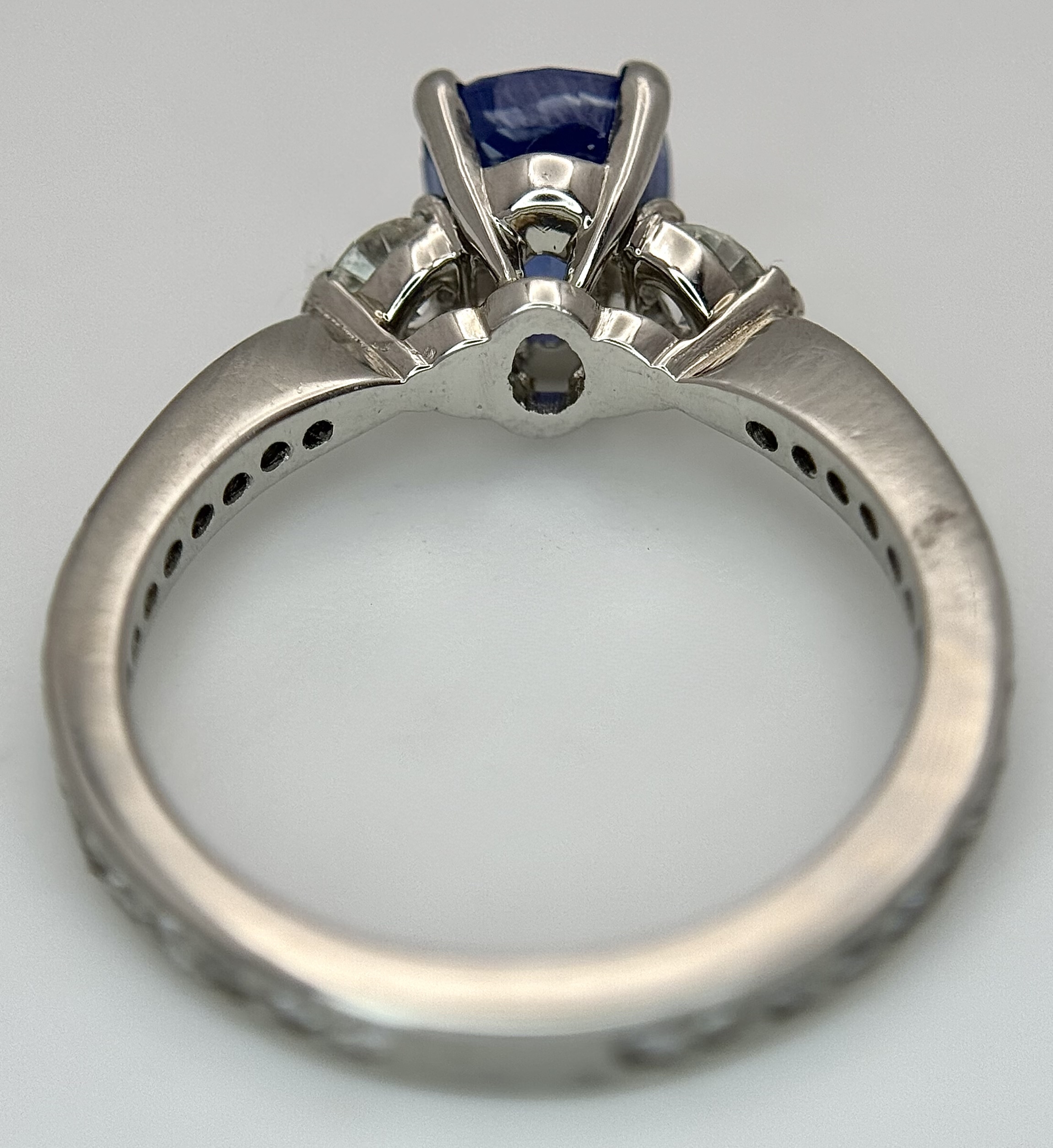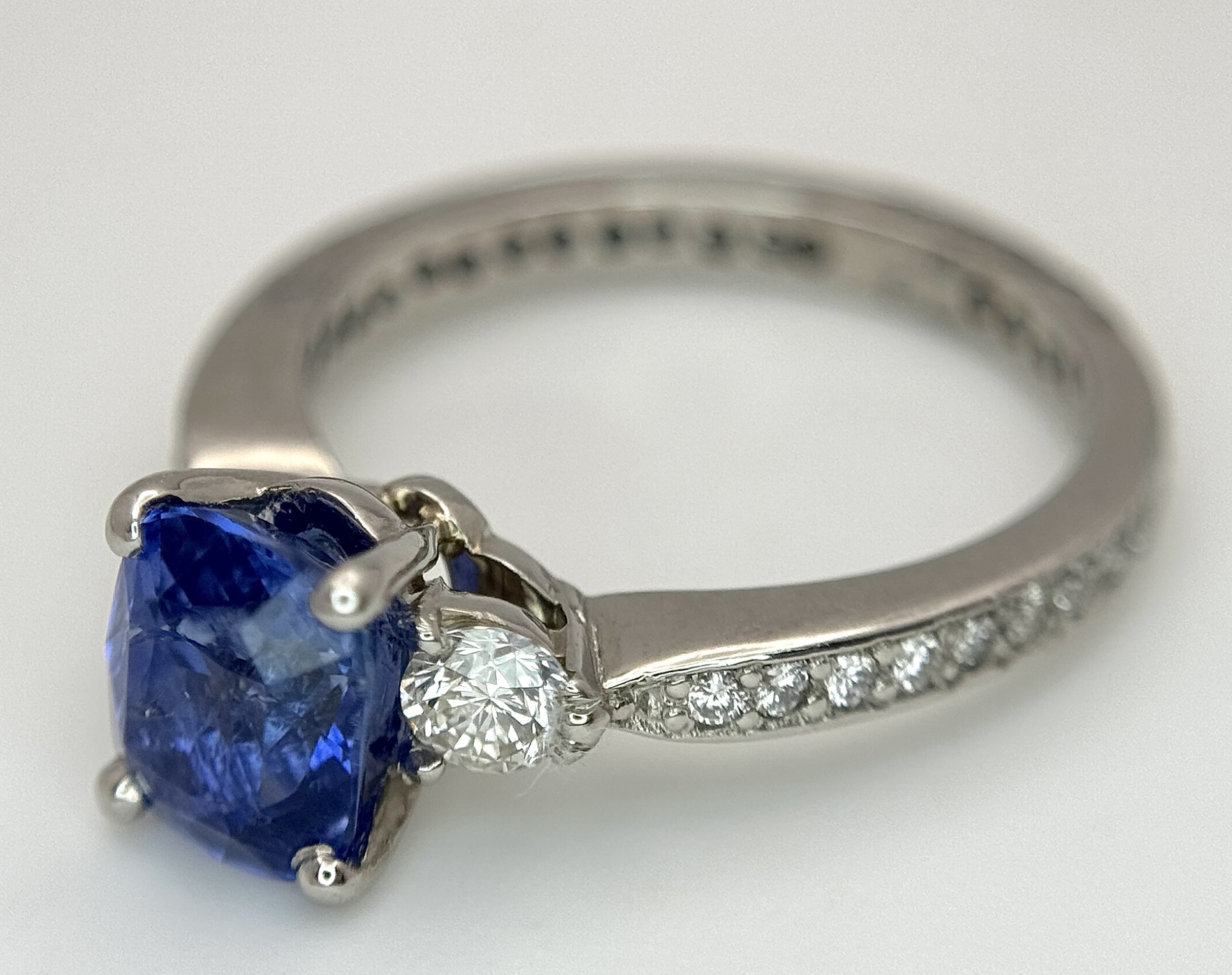 A Dazzling 950 Platinum Sapphire and Diamond Ring. A 1.75ct cushion mixed cut sapphire with thirty-four round brilliant cut diamonds either side. Size K - K 1/2. 4.75g total weight. Comes with WGI certificate. Ref: 9/36356