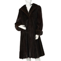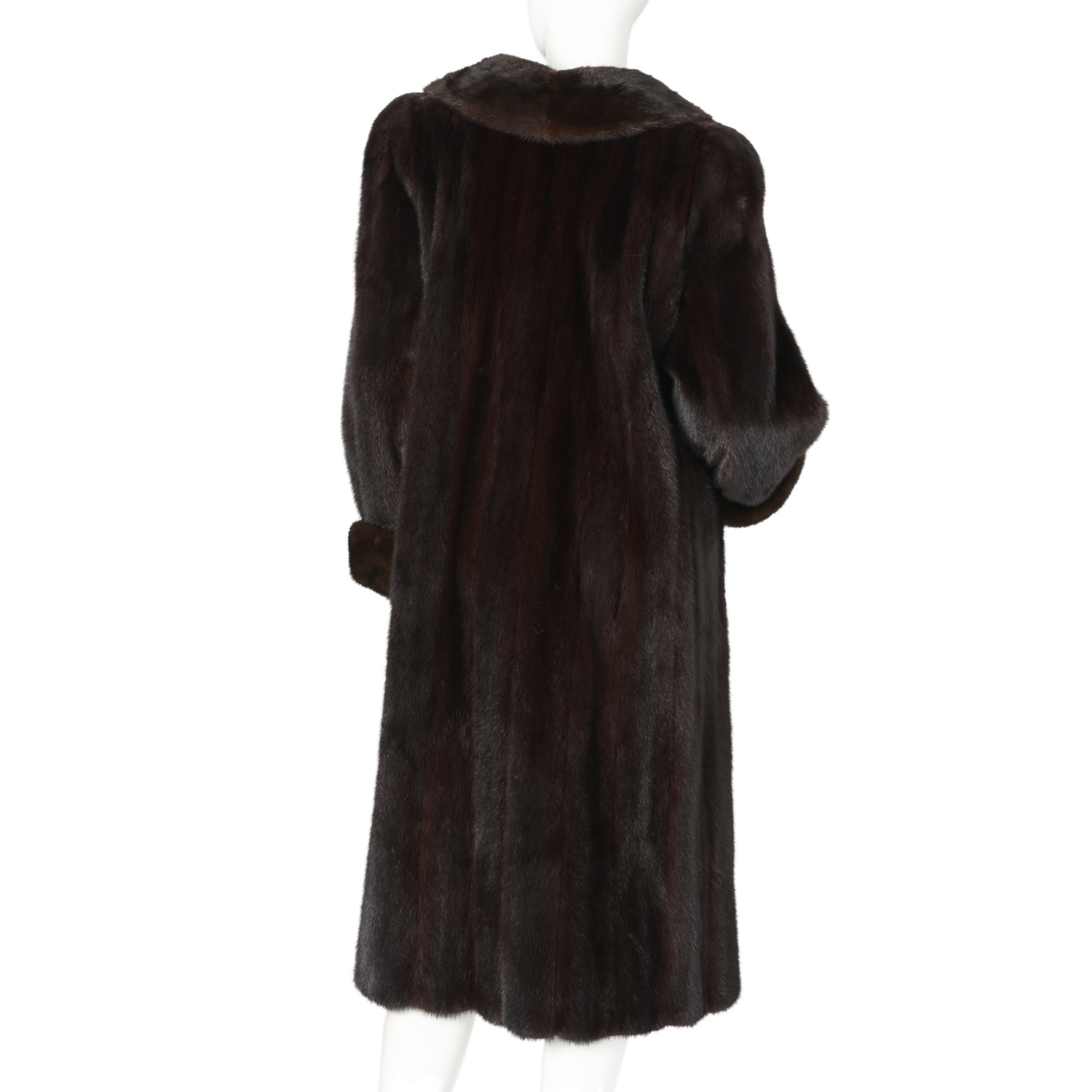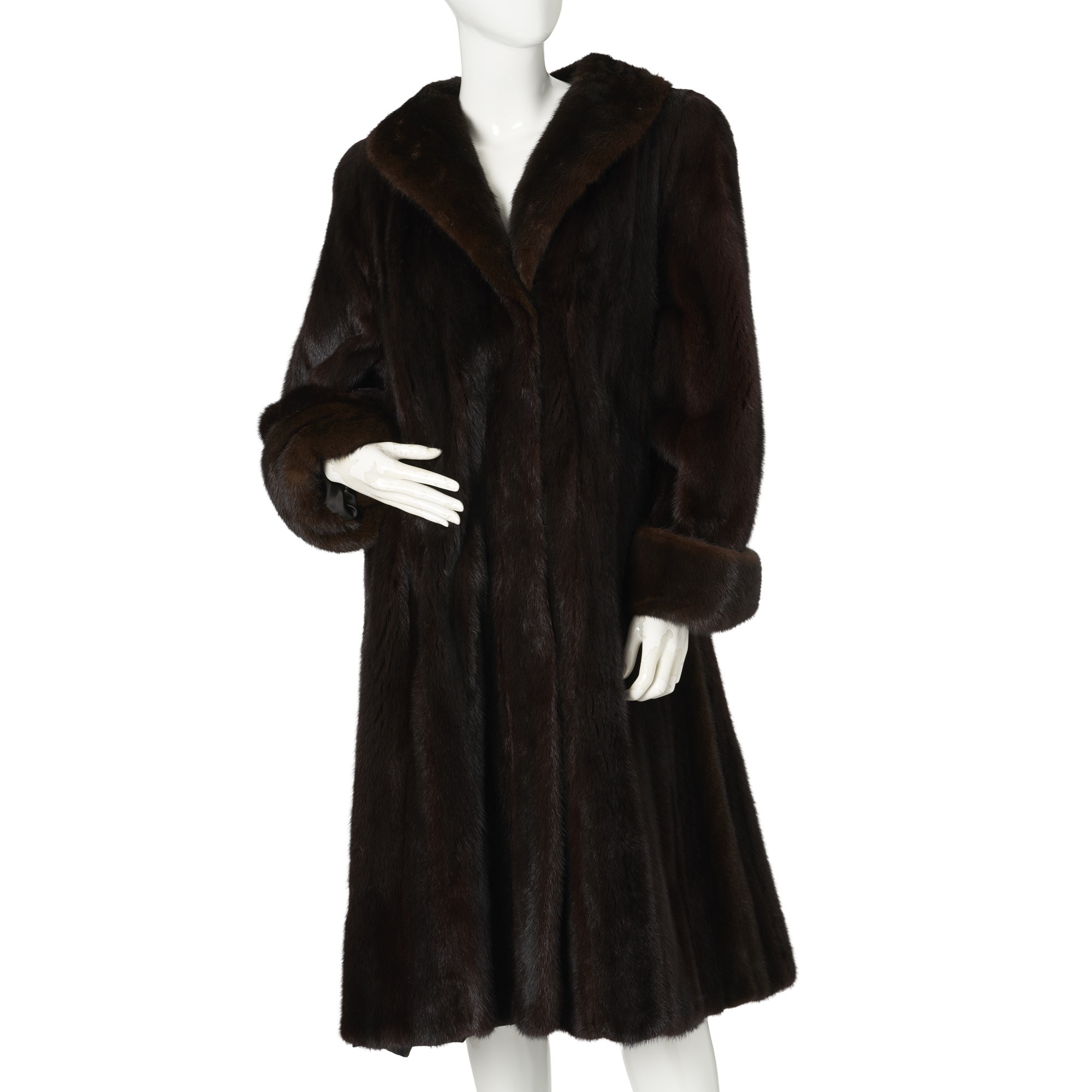 A ranch mink coat, with a lapel collar, hook and eye clip fastenings, cocktail cuffs, two exterior pockets, and one interior patch pocket, labelled Epogonatos Furs, chest measures approximately 44 inches