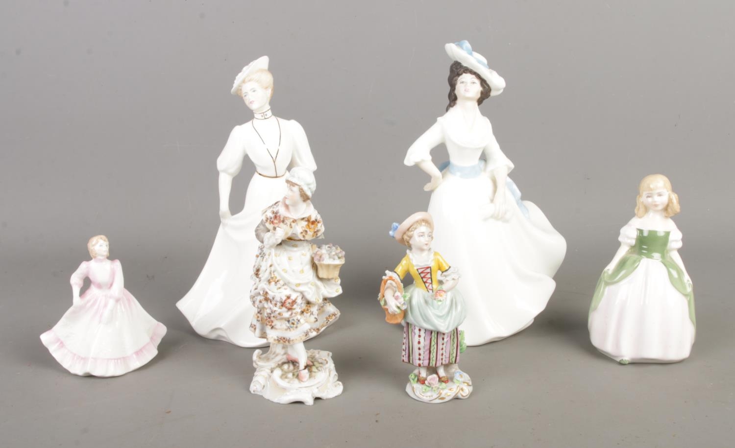 A quantity of ceramic figures to include Sitzendorf, Volkstedt, Coalport Ladies of Fashion Lorraine, Coalport Elisa, Royal Doulton Margaret (HN2397) and Royal Doulton Penny (HN2338).