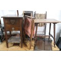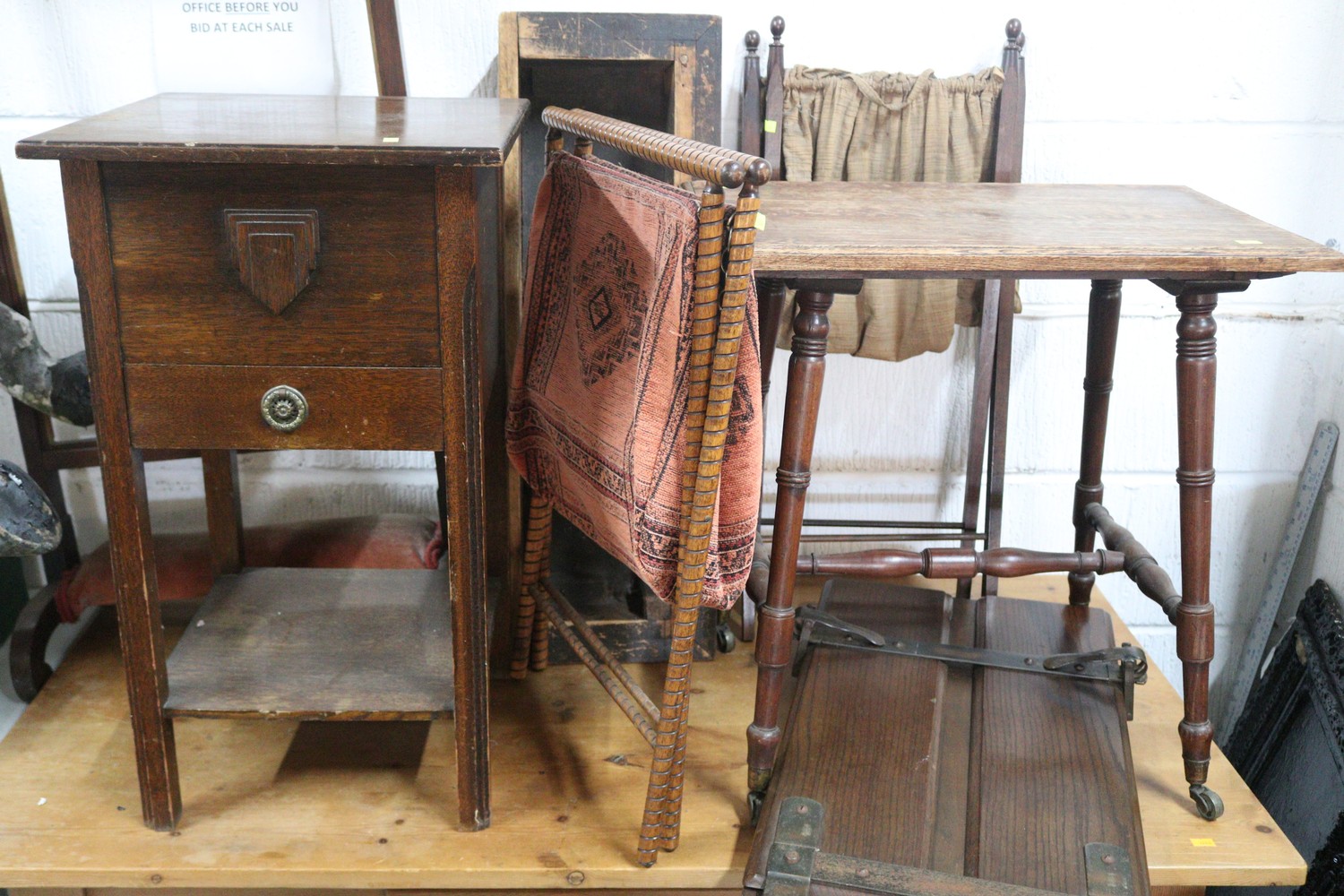 Art Deco oak sewing box with drawer, table with casters and Selfridges London trouser press, two folding sewing bags Plinth and firescreen frame