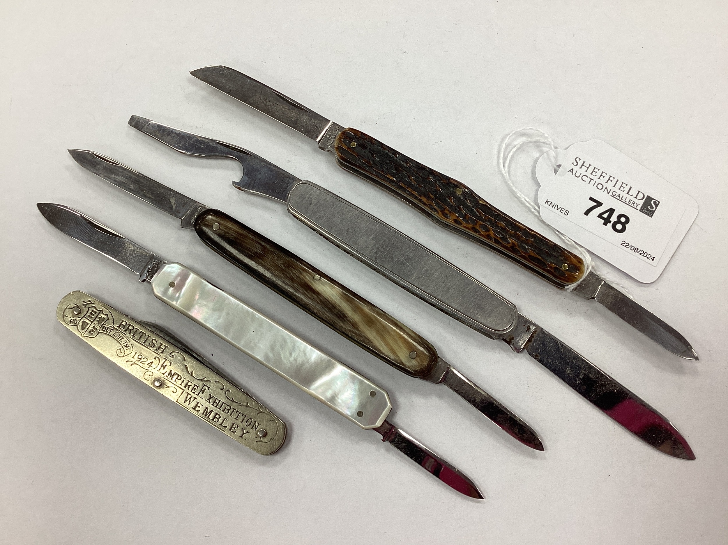 A Collection of Folding Penknives, including British Empire Exhibition Wembley 1924 souvenir, mother of pearl scales, stag, horn etc. (5)