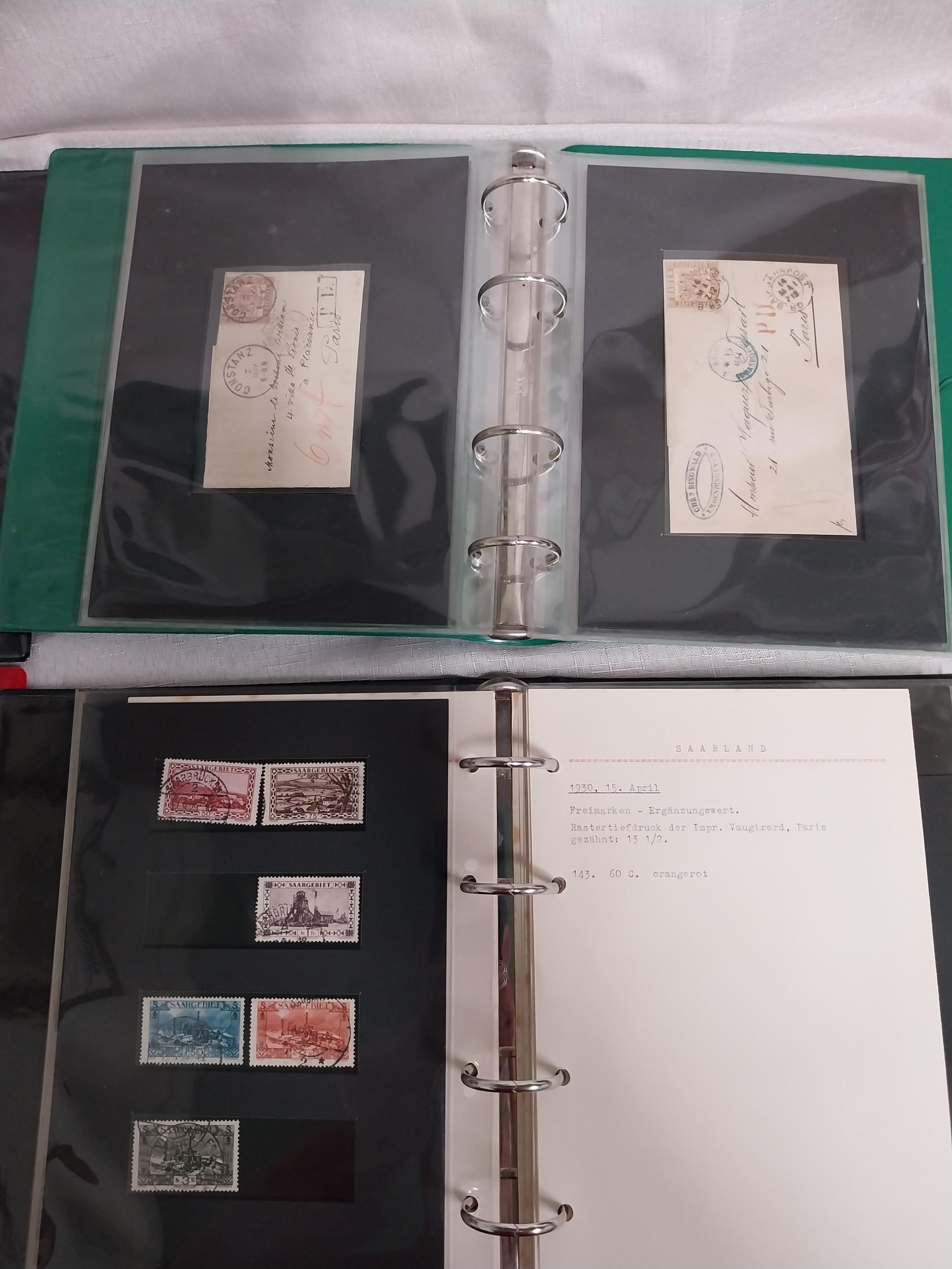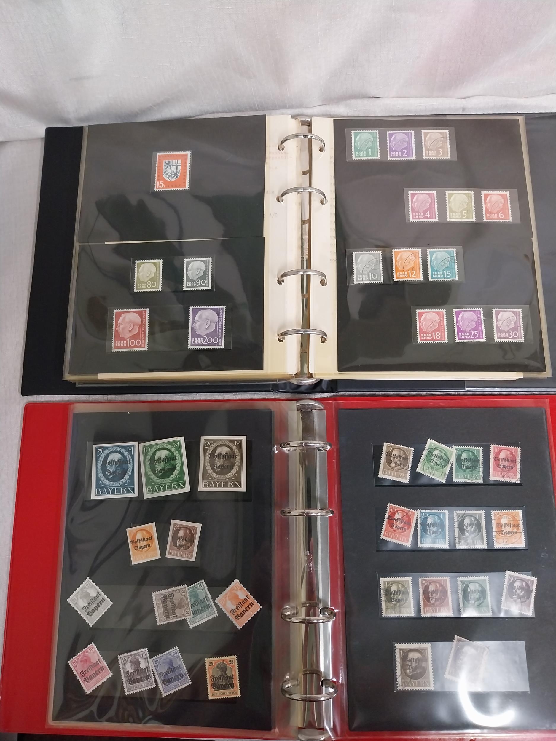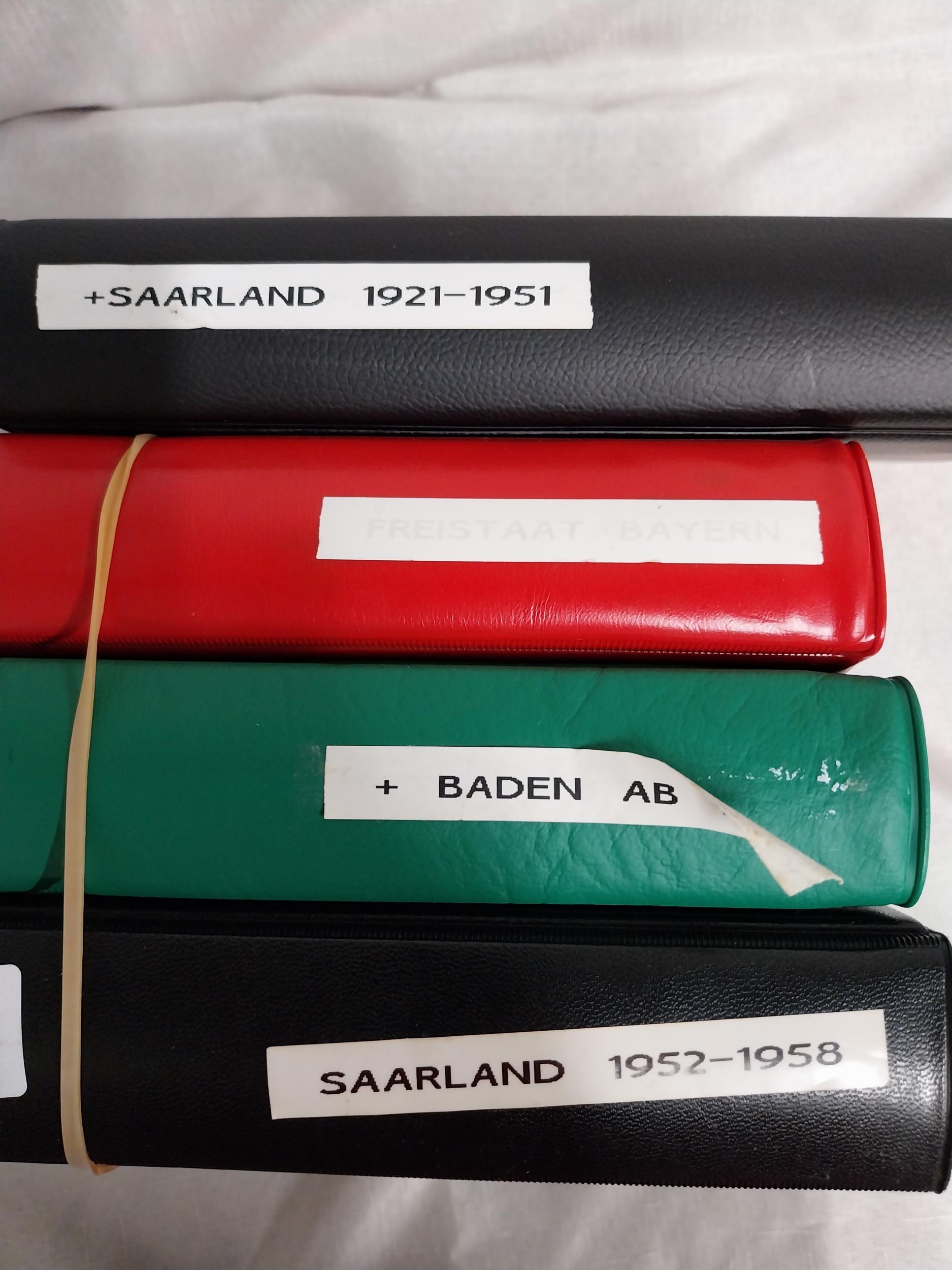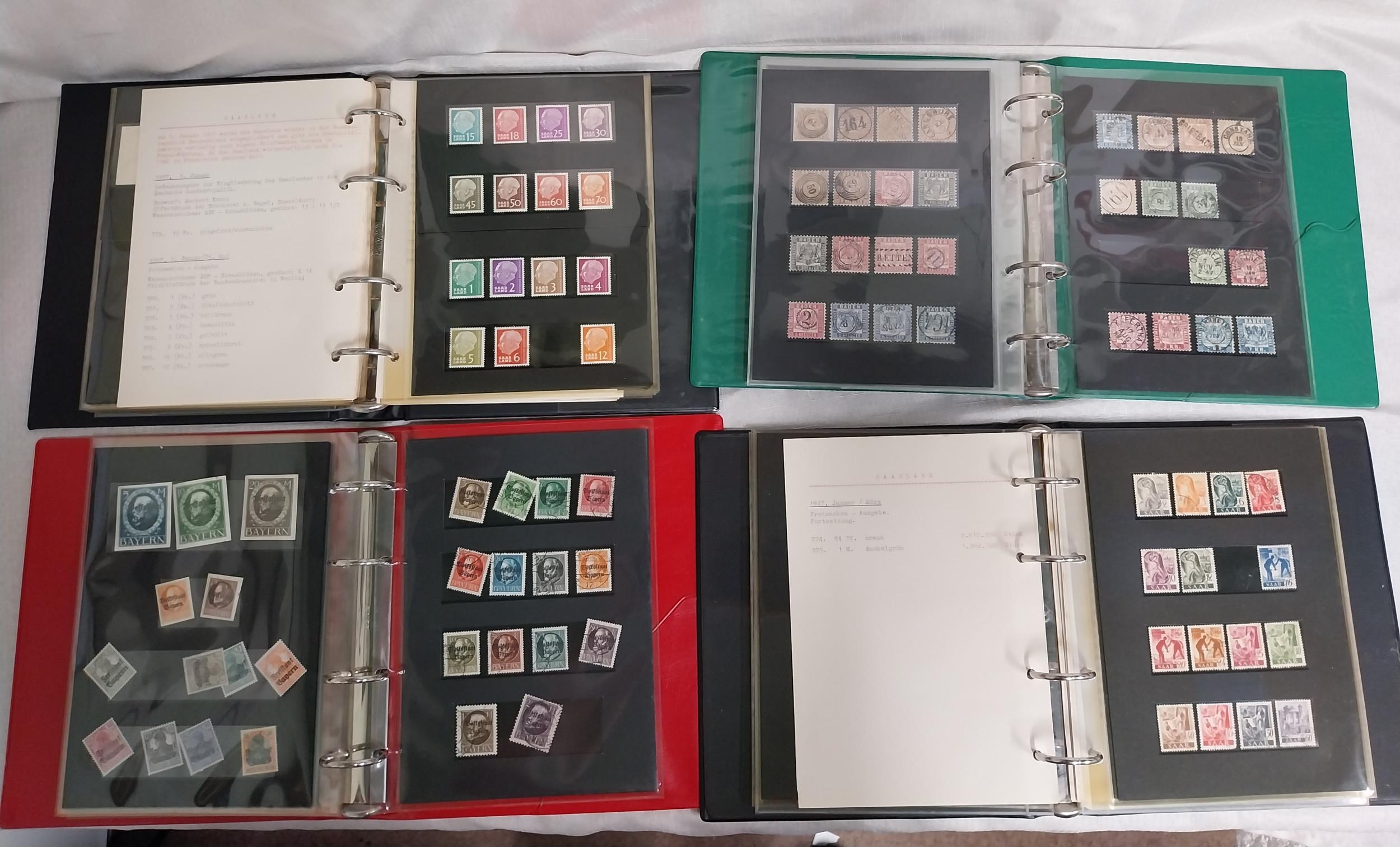 Two albums of Saarland German stamps, 1921 - 1951 & 1952 - 1958, album of overstamped Bayern stamps 1914 - 1920's & album of Baden stamps 1860's .