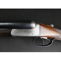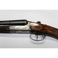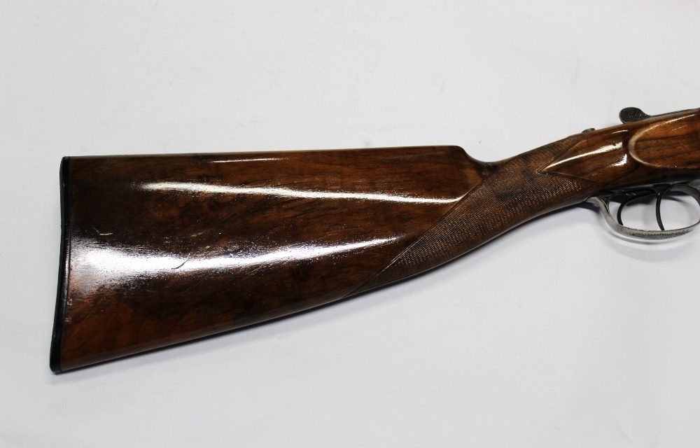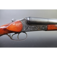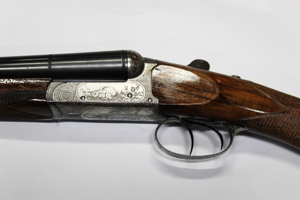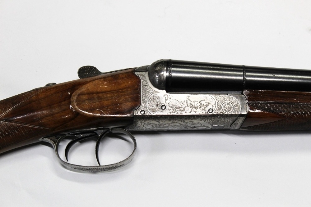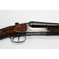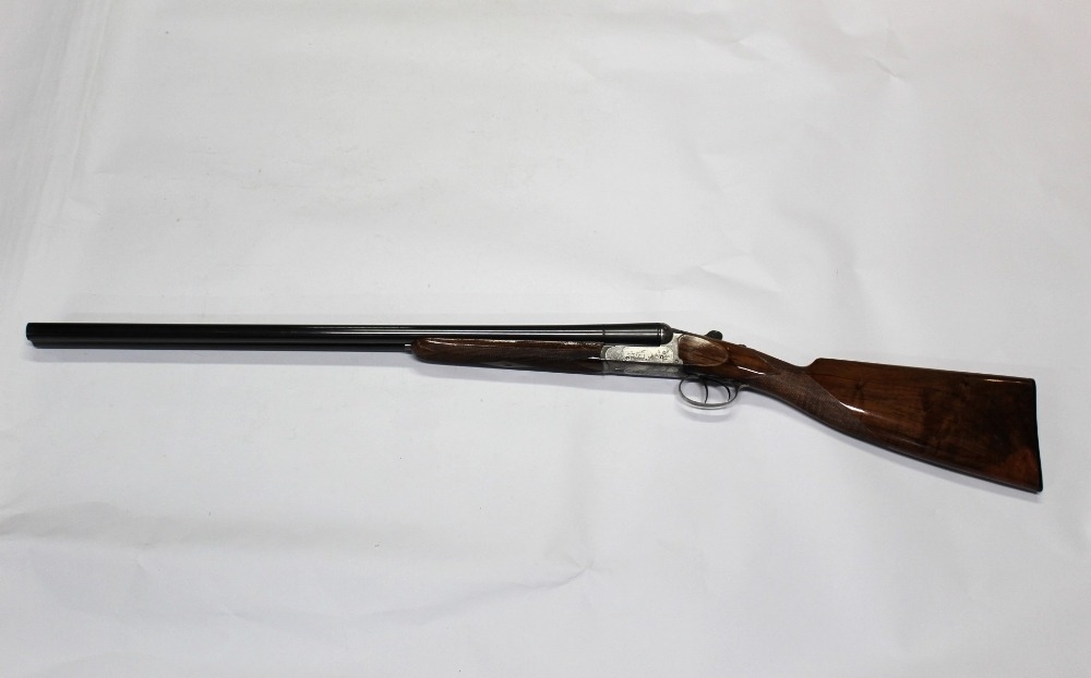 Fias For Gower Ltd, a 12 bore side by side shotgun, with 27 3/4" barrels, half and three quarter choke, 70 mm chambers, boxlock, ejector, the action engraved with rabbits partridge etc, top lever, automatic safety, double trigger and fitted with a 14 1/2" lop swans neck stock. Serial No. 61864. SHOTGUN CERTIFICATE REQUIRED.