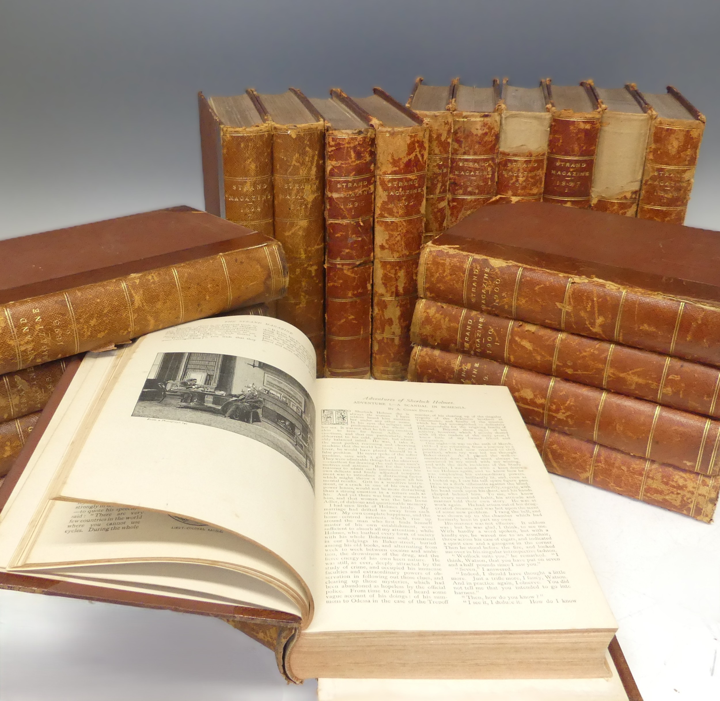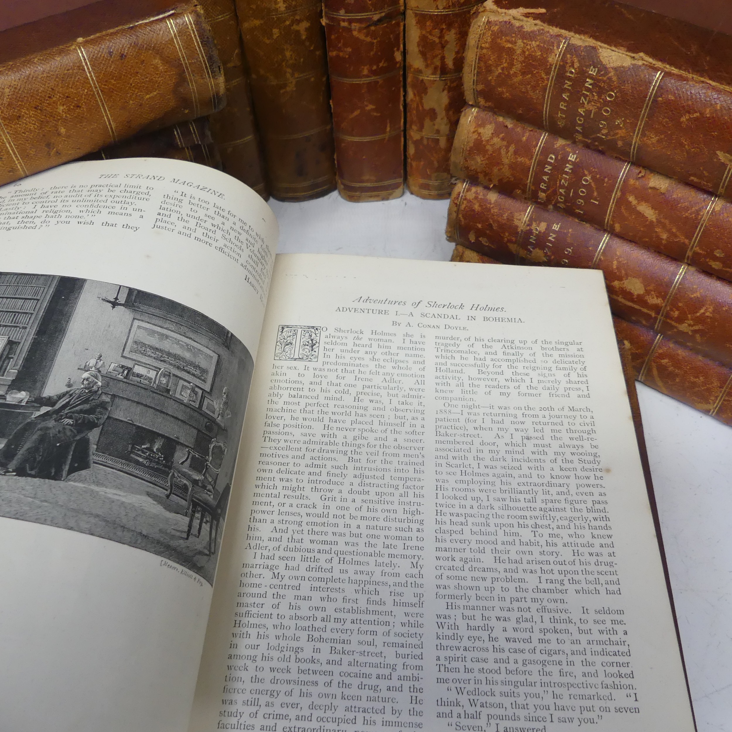 Newnes (George, editor), The Strand Magazine: An Illustrated Monthly, Volumes I-XX (1891 - 1900), including Vol. II and the first of Arthur Conan Doyle's Sherlock Holmes stories 'A Scandal in Bohemia', contemporary half morocco, spines particularly with knocks and losses, see images. (20)