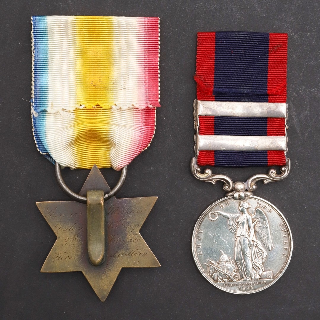 A TWO CLASP SUTLEJ WITH FEROZESHUHUR REVERSE AND A GWALIOR STAR FOR THE PUNNIAR BATTLE, 1843, TO THE HORSE ARILLERY. A group of two medals comprising Sutlej medal with Ferozeshuhur 1845 reverse with Aliwal and Sobraon clasps, named to Gunner M: Daley 4th Batn Arty. And a Gwalior Star, the silver centre for Punniar, 29th December 1843. The reverse with original hook fitting, named to Gunner Michael Daley 1st Troop 3rd Brigade Horse Artillery. This medal, awarded by the Indian Government were made using bronze from guns captured at the battles of Maharajpoor and Punniar which both took place on the 29th December 1843.