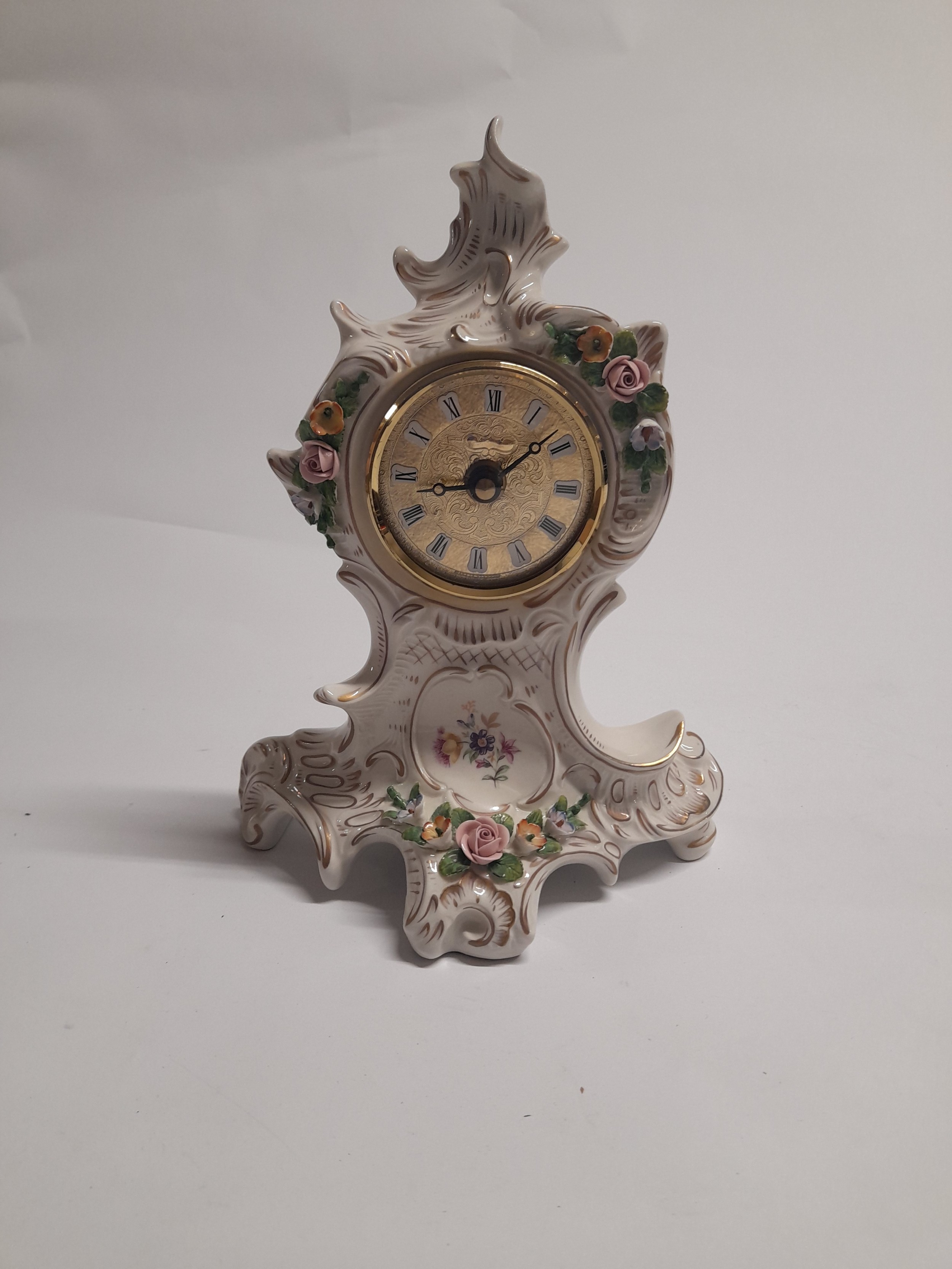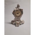 A 20th Century Dresden timepiece with applied and painted floral decoration, 20cm tall (C)