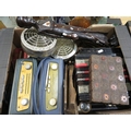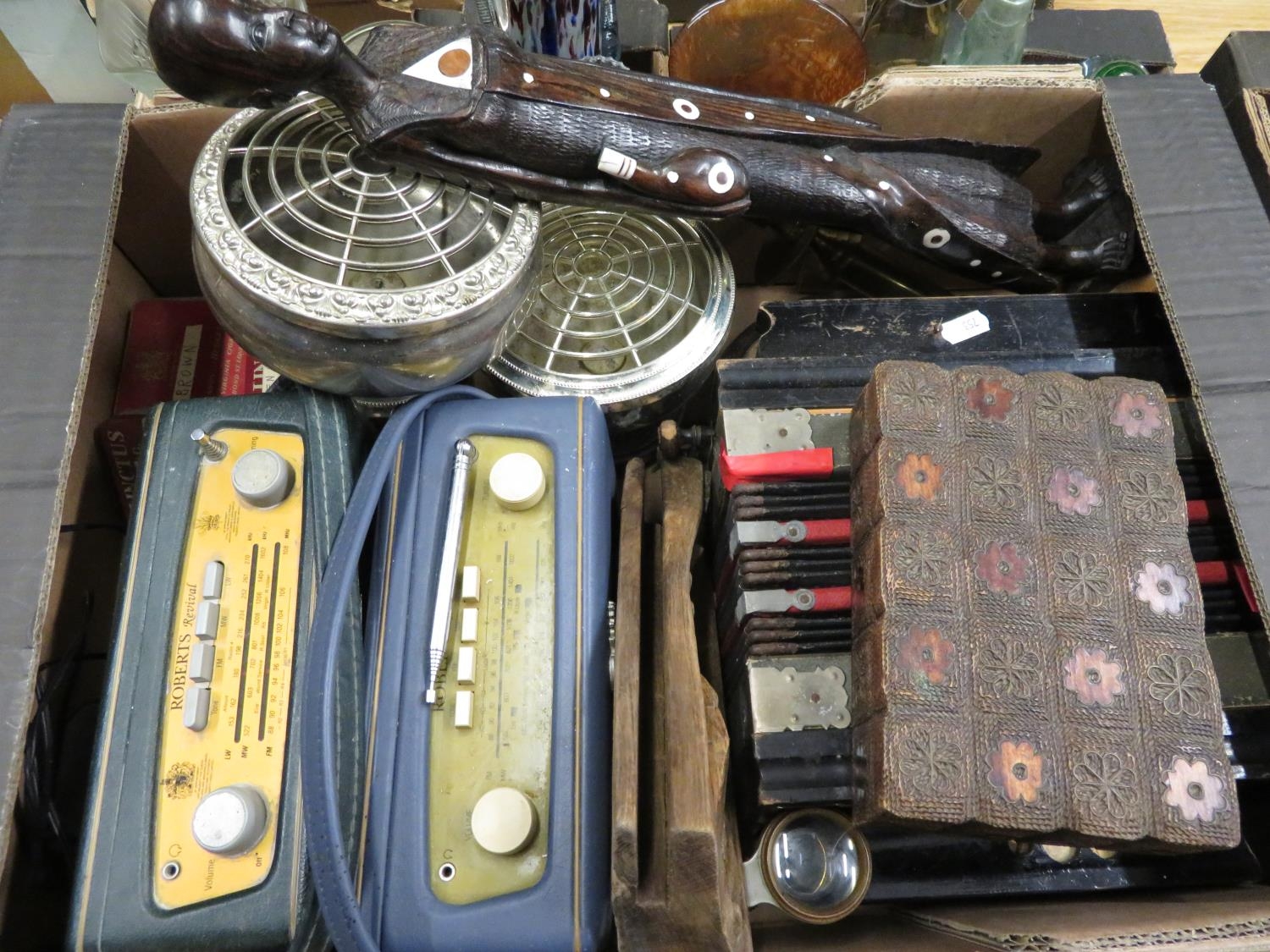 Roberts radio in blue leather case, Roberts revival radio various tins, an accordian, carved hardwood figure inset with bone, etc
