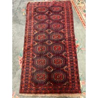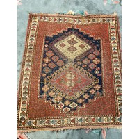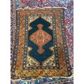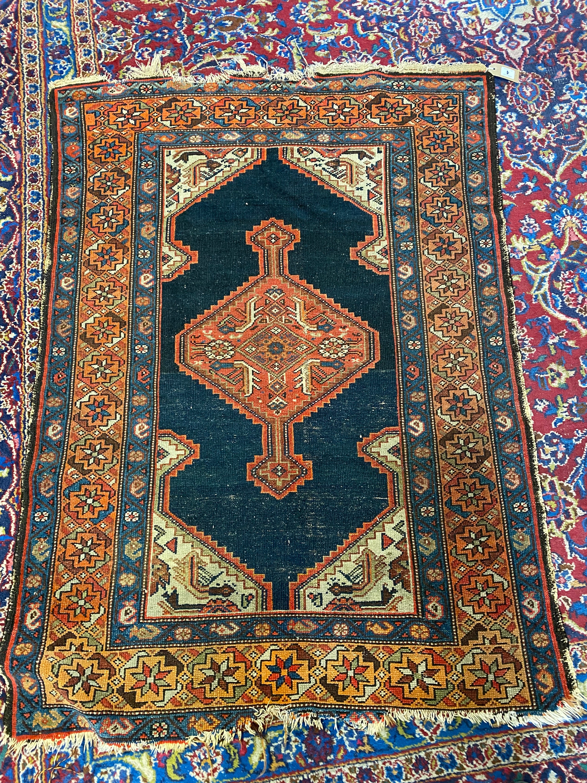 A Persian rug, blue centre with red medallion within geometric border, fringed - 48in. x 36in.