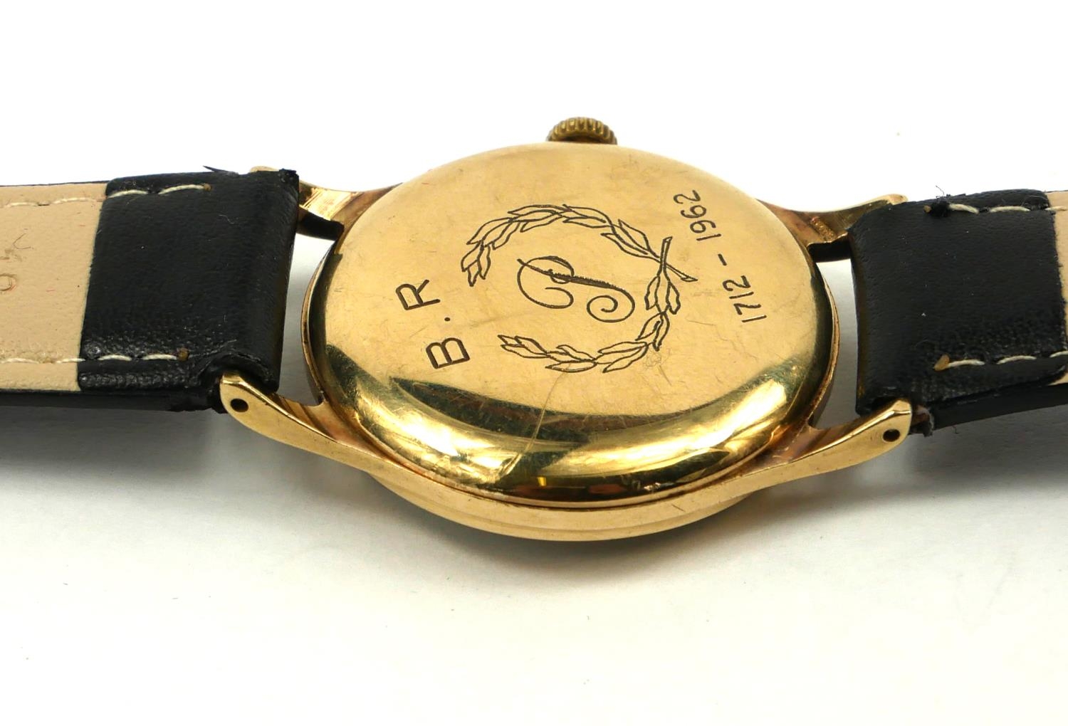 Silver tone dial with gilt number markings and subsidiary dial, engraved to rear ‘B.T. 1712 - 1962’ with initial P within a wreath, number 12321 and 169500, on a black leather strap, in a fitted velvet lined Garrard box.