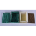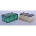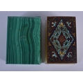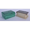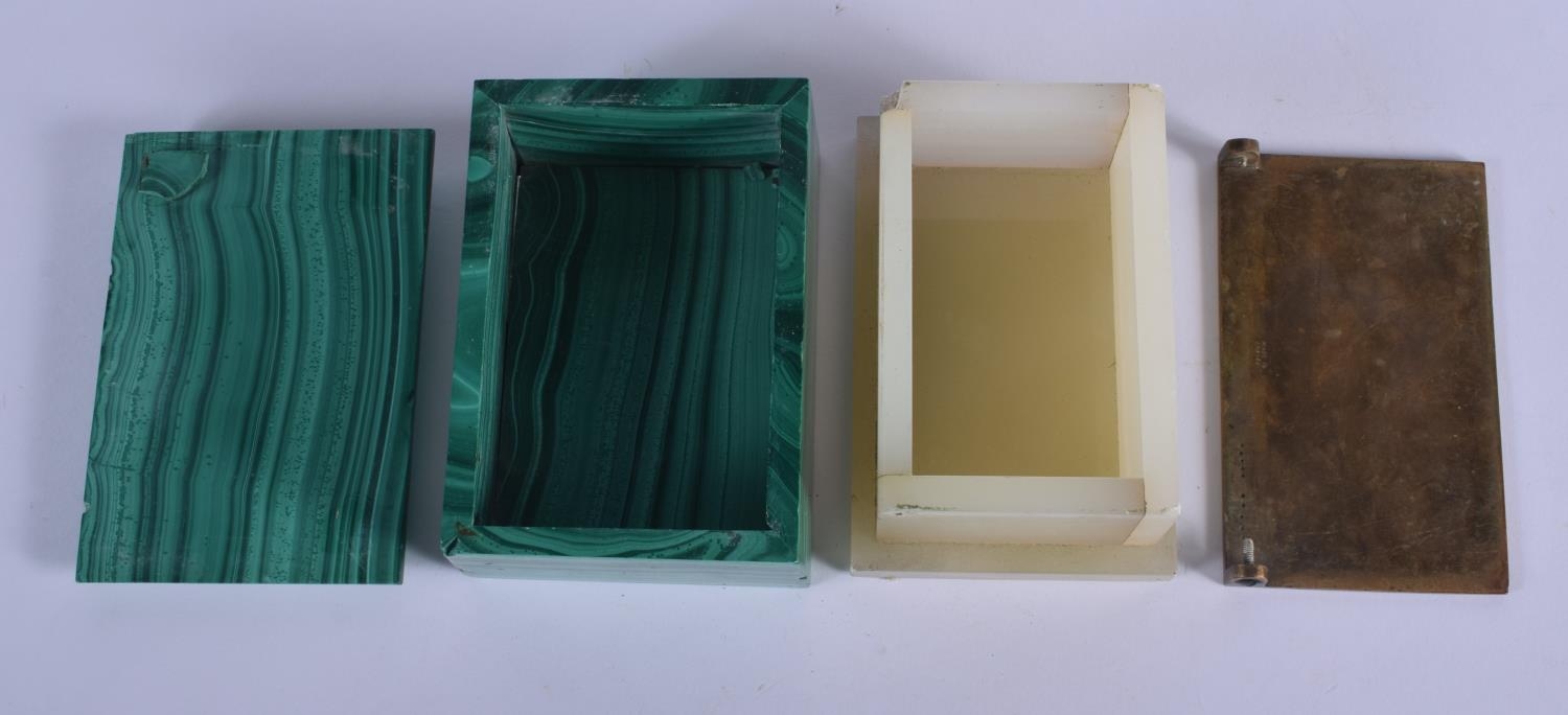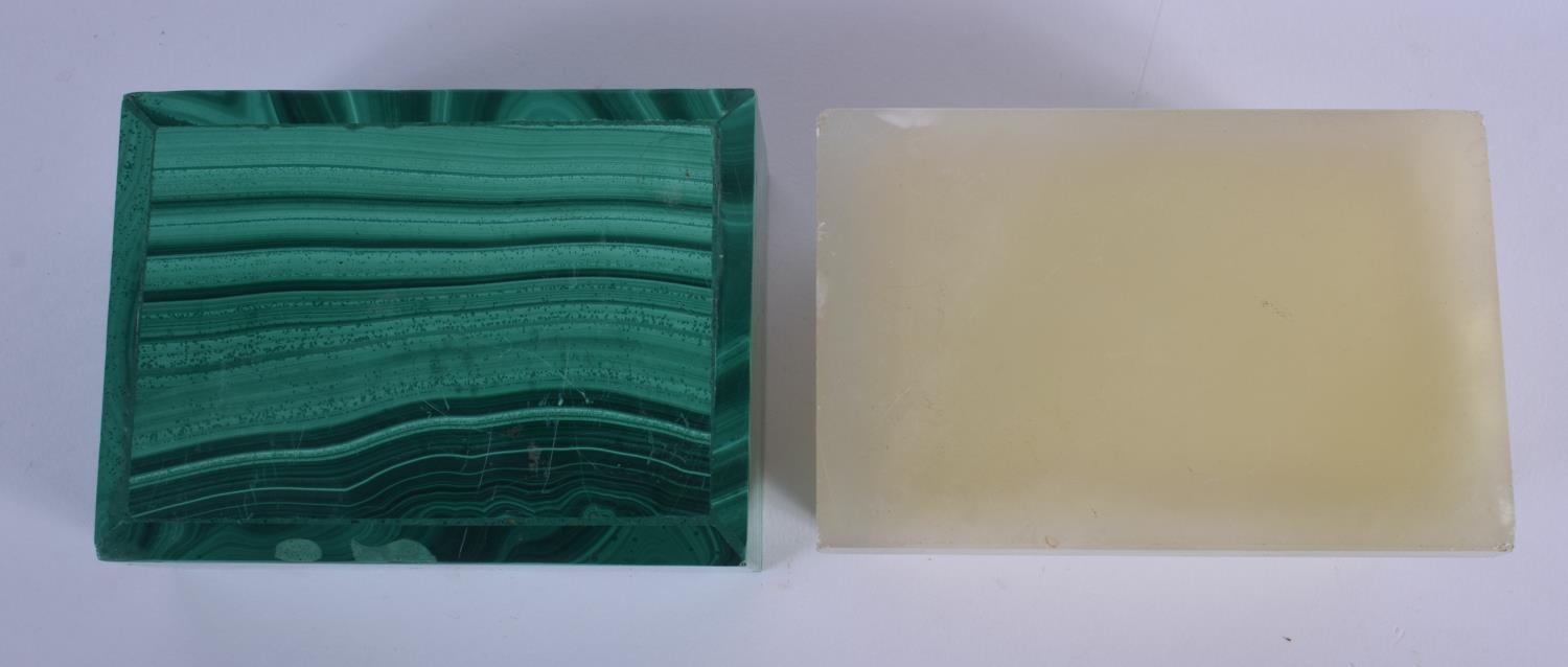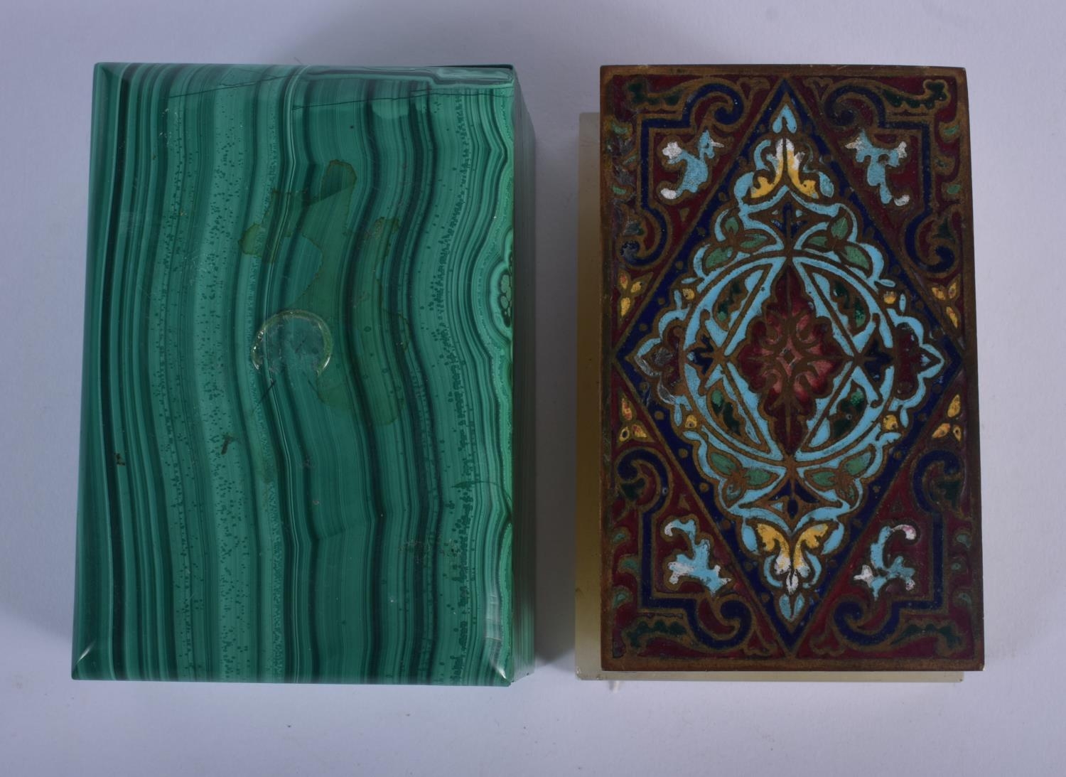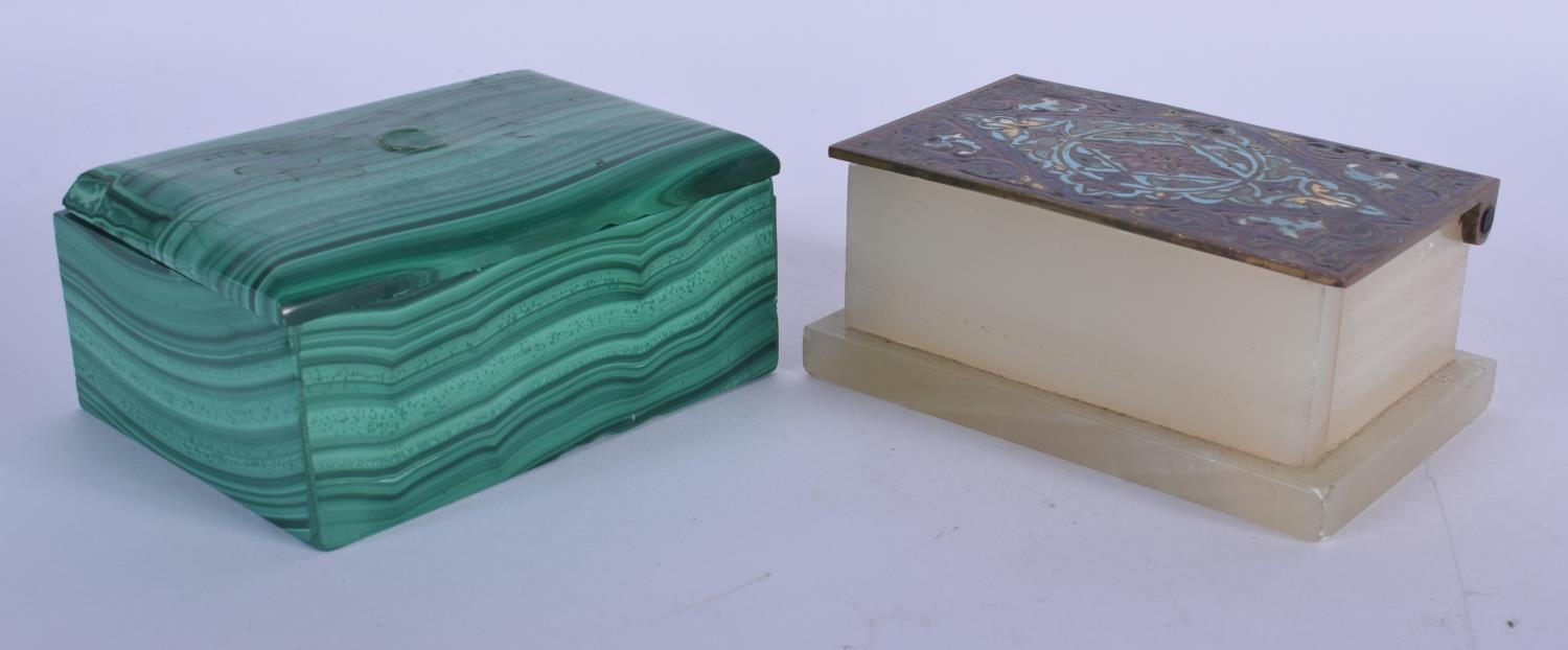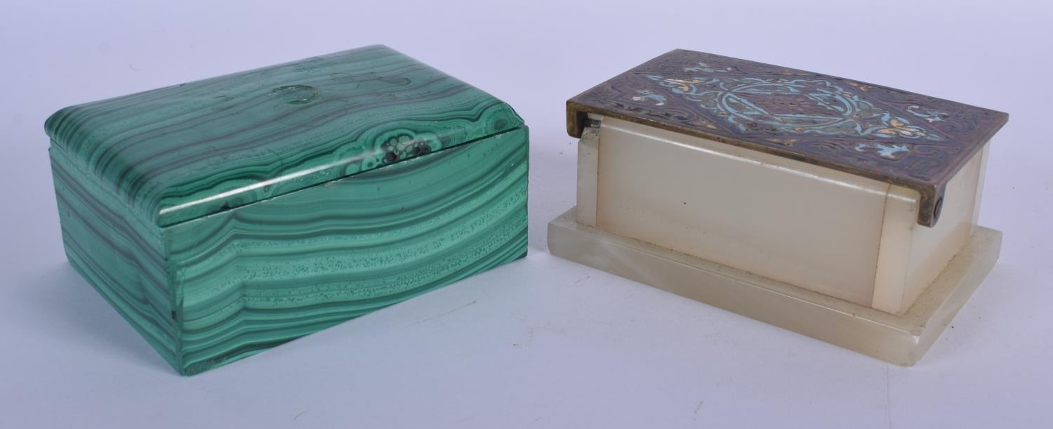 A LATE 19TH CENTURY FRENCH CHAMPLEVE ENAMEL AND ONYX BOX together with a malachite box. Largest 10 cm x 7 cm. (2)