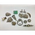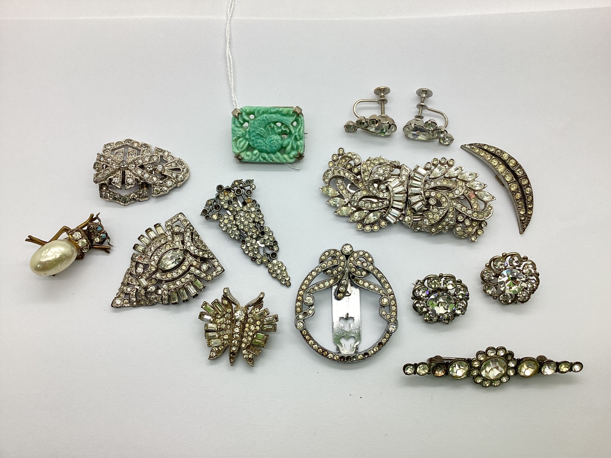 A Collection of Art Deco Style Diamanté Jewellery, to include double dress clips, flowerhead cluster brooch, carved hardstone panel brooch, etc.
