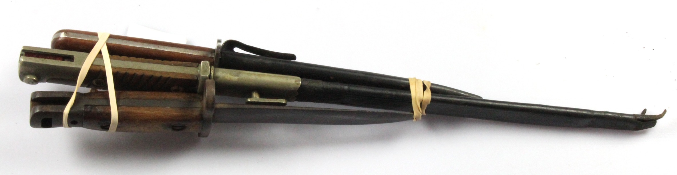 Trench knives etc including a WW1 shortened '07 pattern bayonet, WW1 German shortened mod. 98 Mauser with part scabbard and German boot knife. Sold as seen