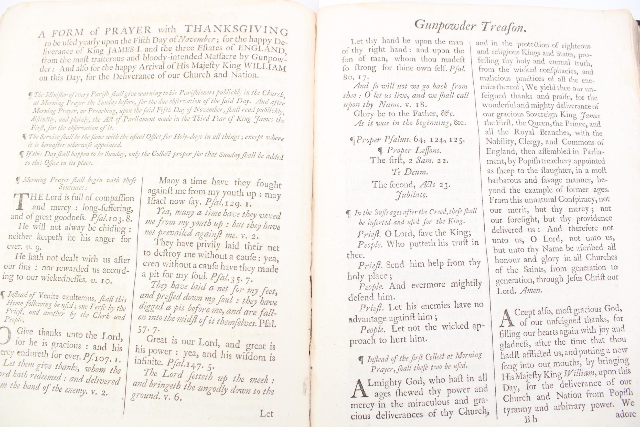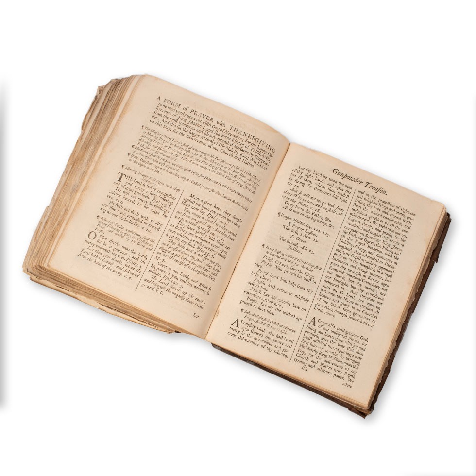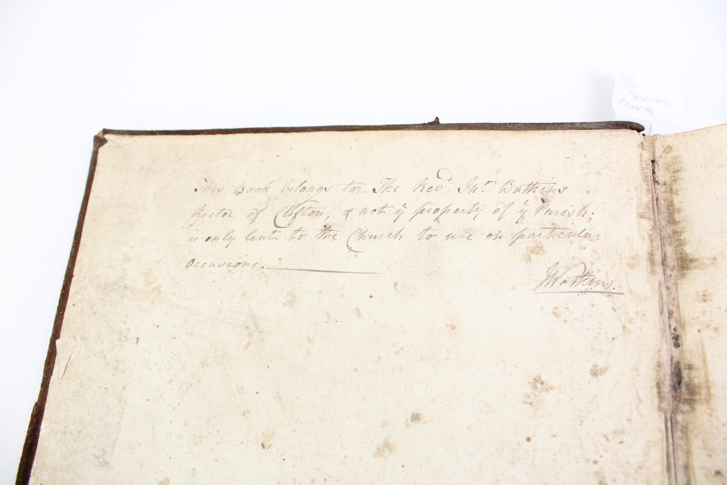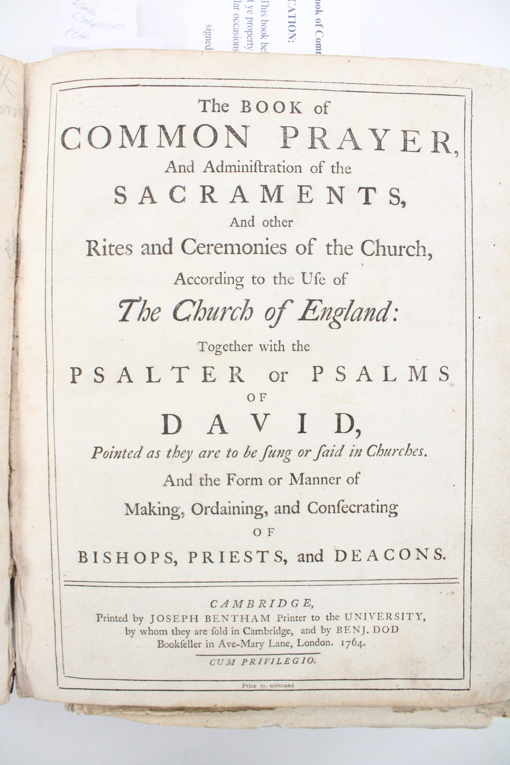 The Book of Common Prayer and Administration of the Sacrements....According to the Church of England, 1764, printed by Joseph Bentham Ave-Mary Lane, London, dedication 'This book belongs to the Revd. Jn.on Wakins Rector of Clifton, (Clifton Campville, Staffordshire) and not ye property of ye Parish: is only lent to the Church to use on particular occasions' signs John Watkins 1783, also included are sermons on 'The Gunpowder Plot' and 'King Charles Martyr'.