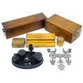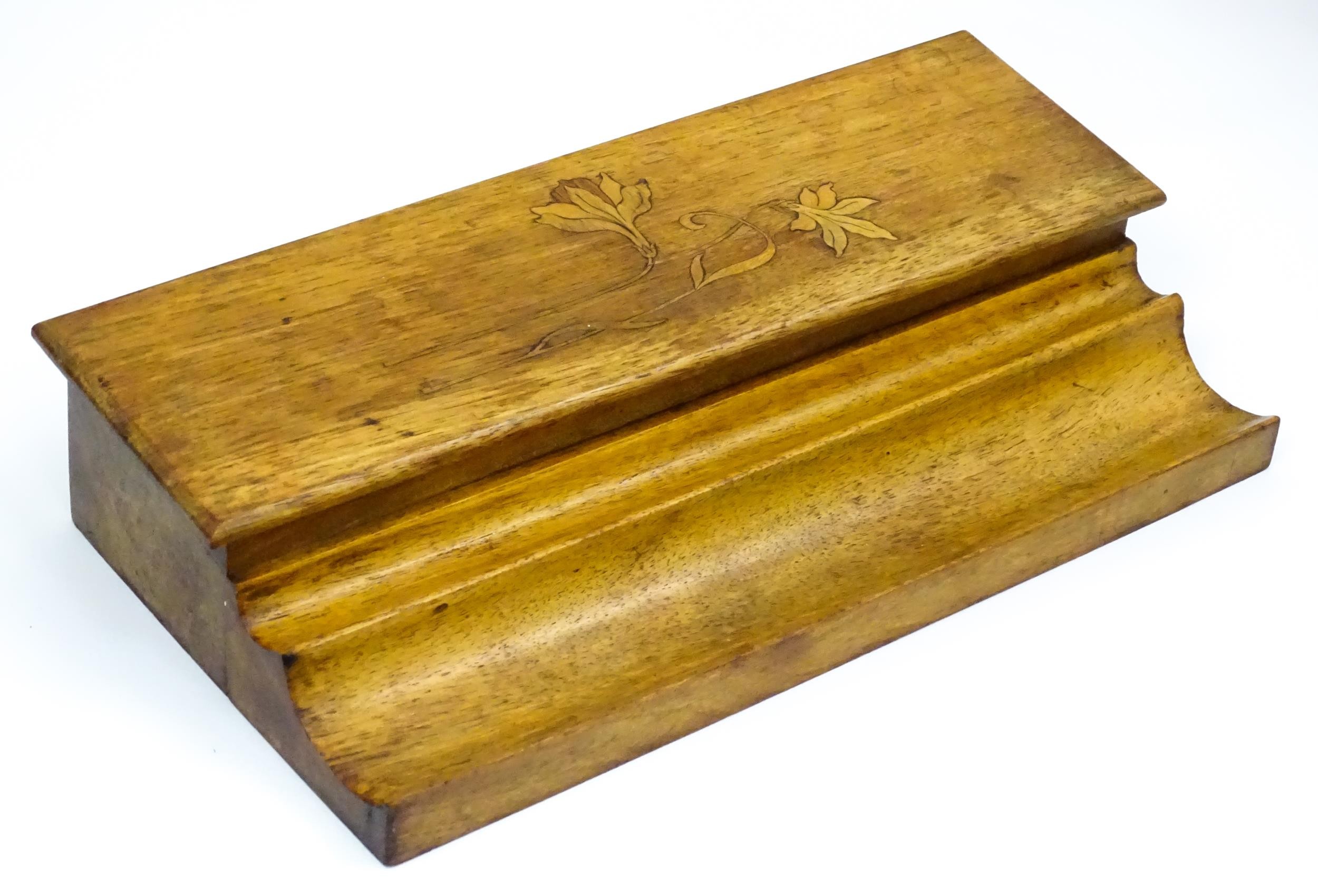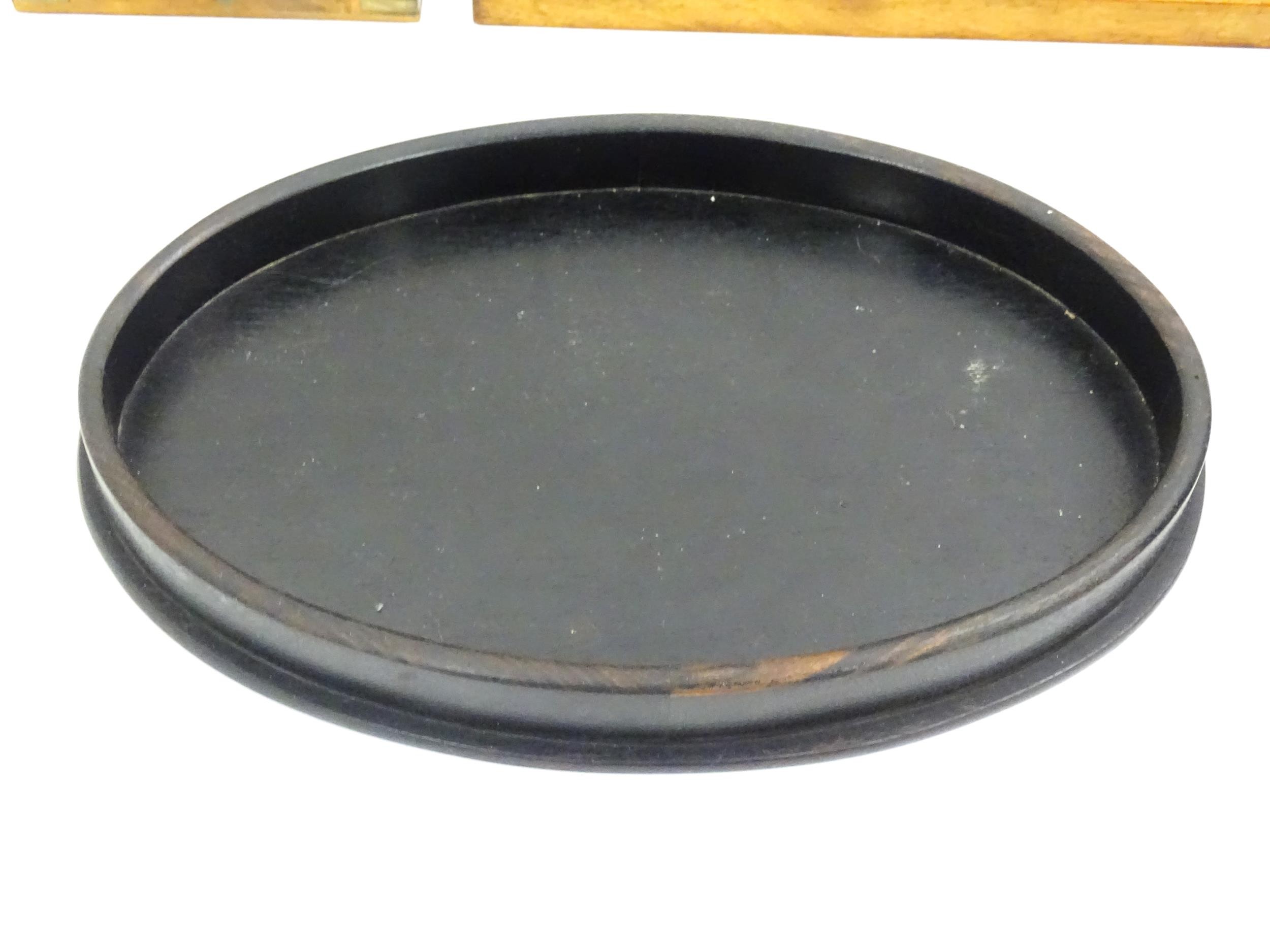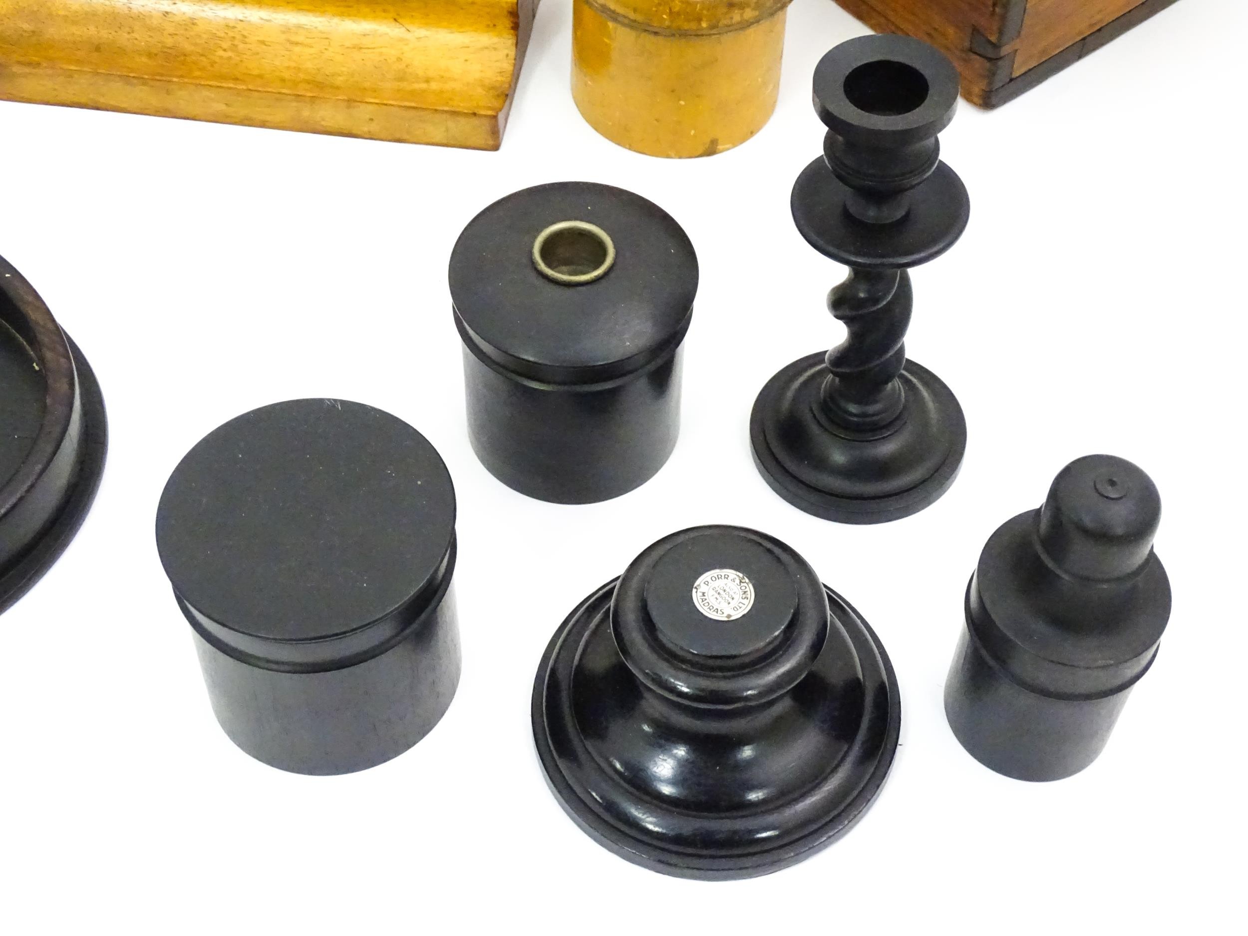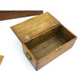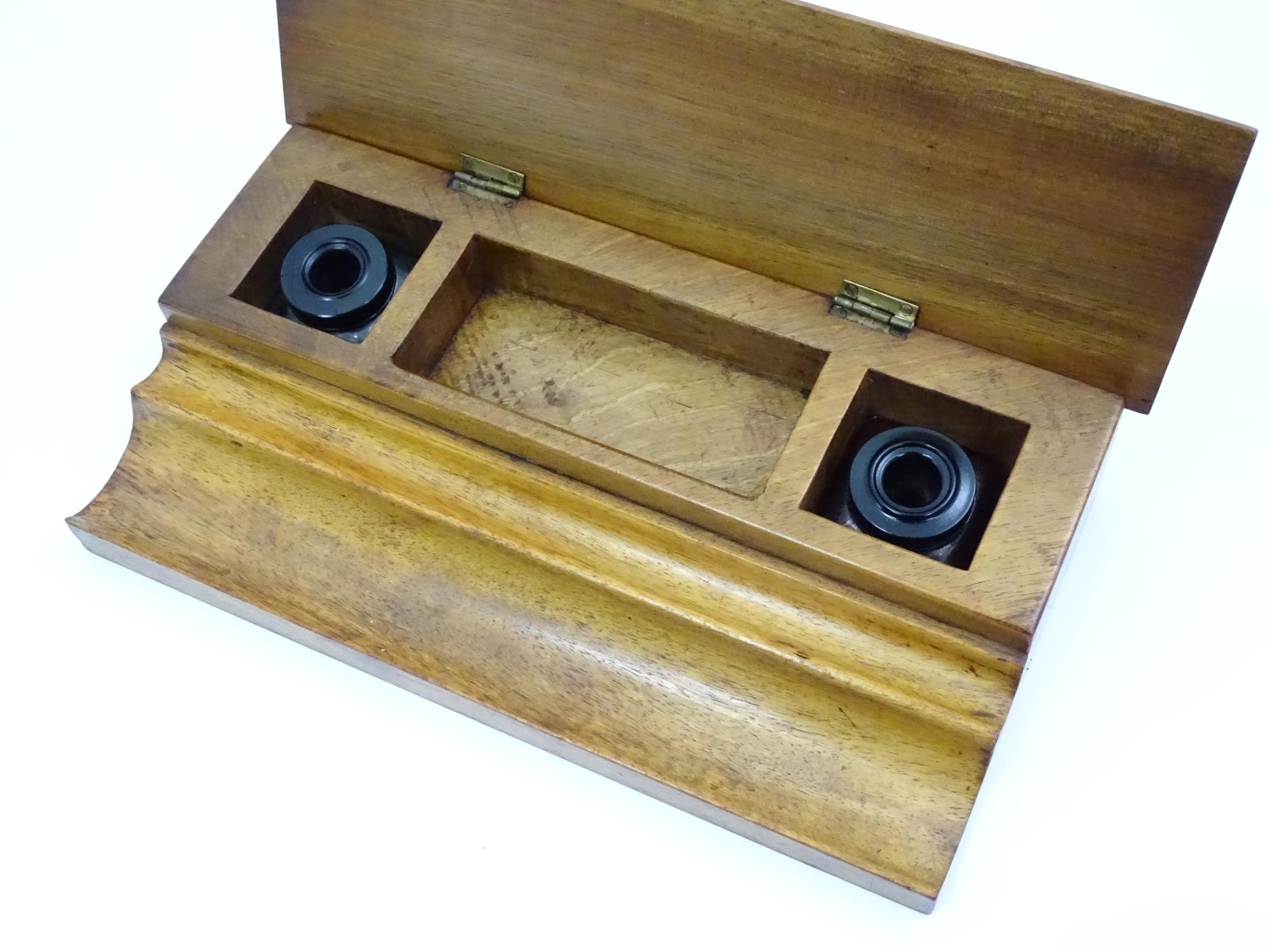 Assorted items to include an oak box with brass handles, a cast wall hanging candle holder with bird detail, a wooden desk stand / standish with marquetry flower detail opening to reveal two inkwells, a mahogany case, ebonised dressing table items to include tray, hair tidy, pot and cover, candlesticks, etc. Largest box approx. 20" long