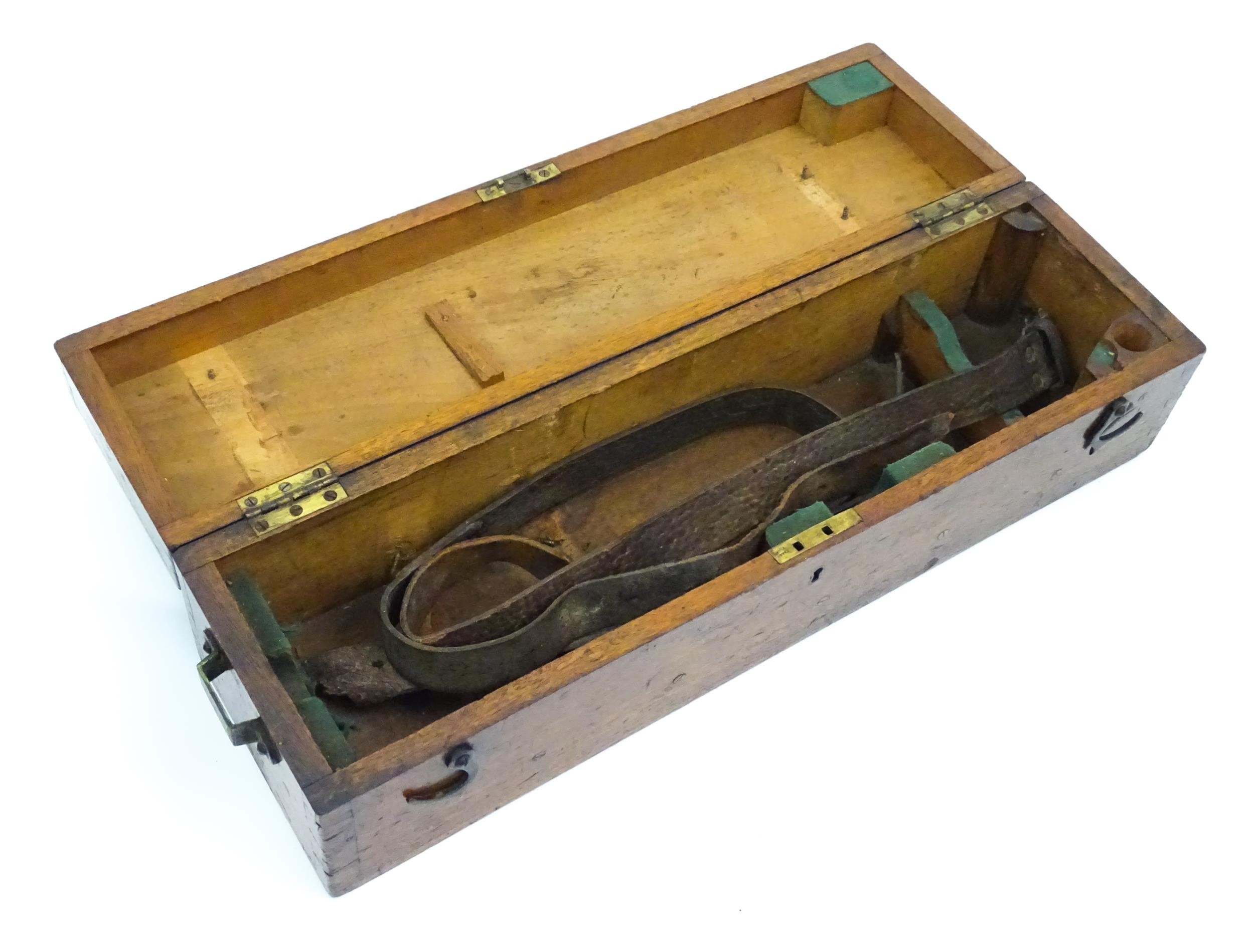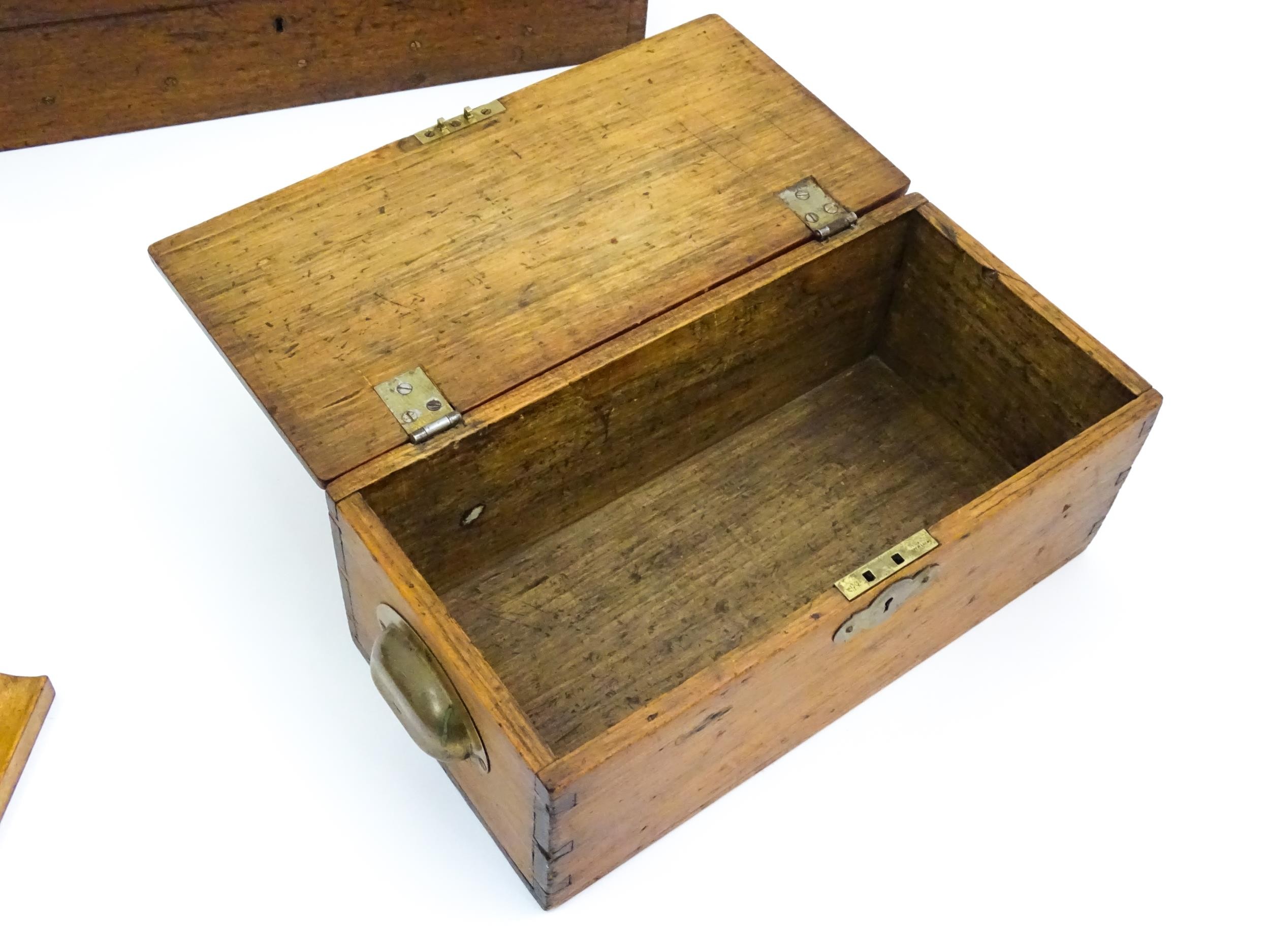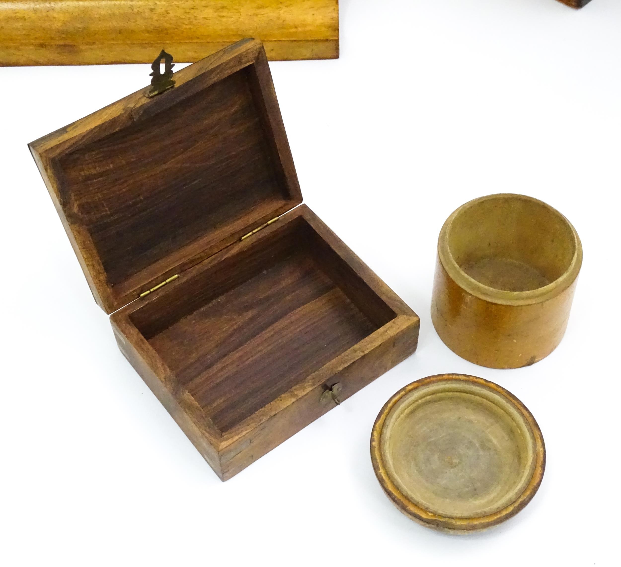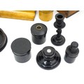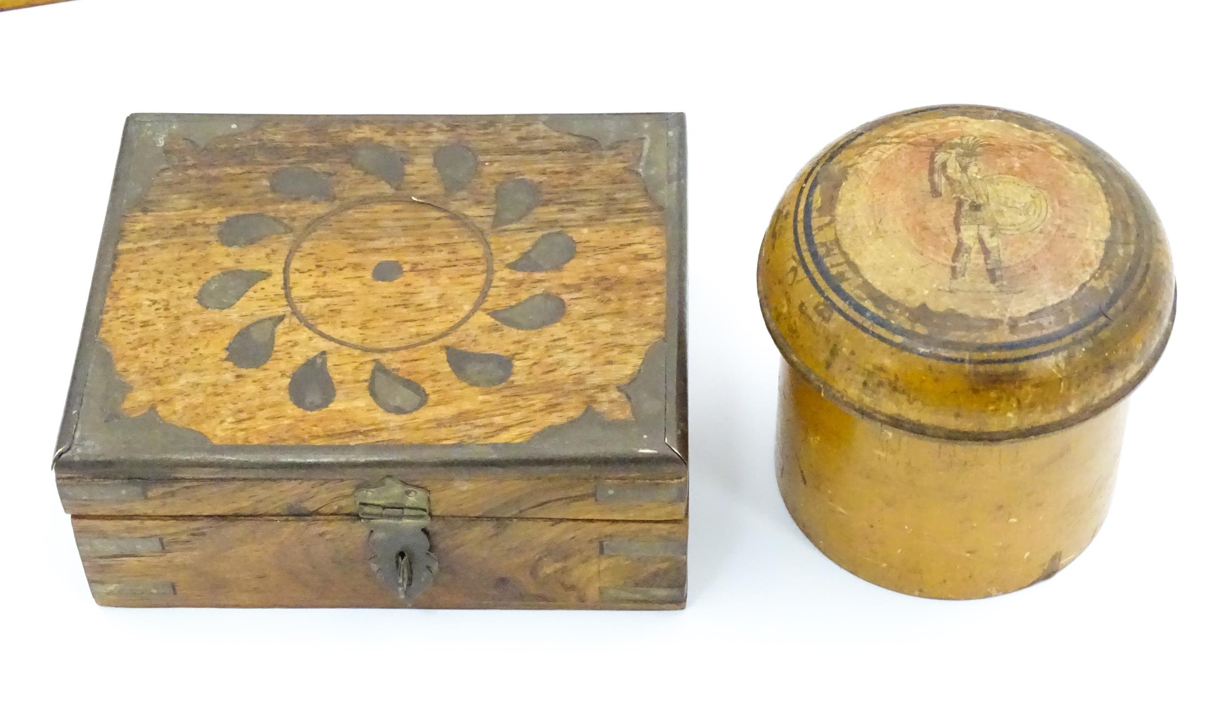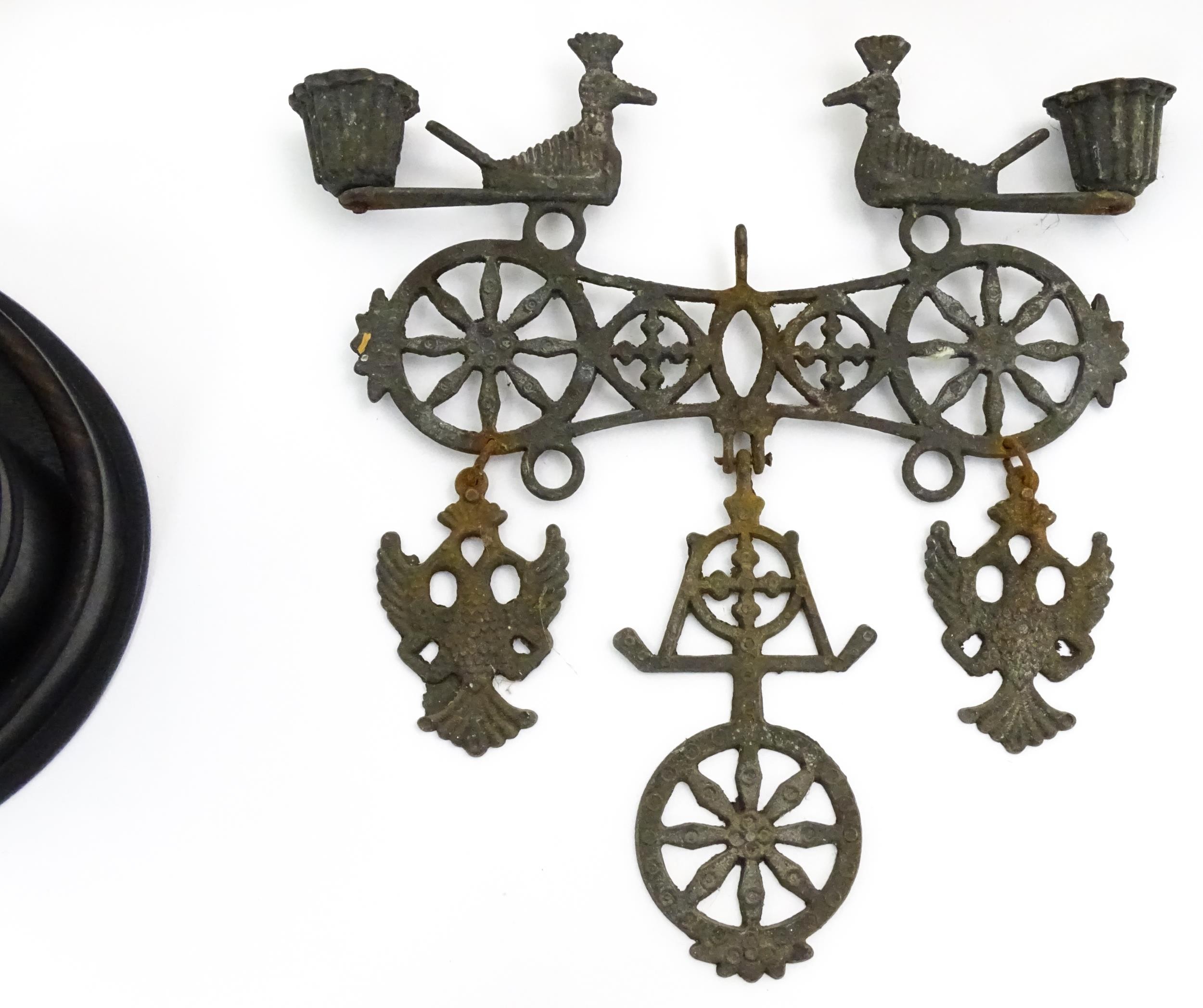 Assorted items to include an oak box with brass handles, a cast wall hanging candle holder with bird detail, a wooden desk stand / standish with marquetry flower detail opening to reveal two inkwells, a mahogany case, ebonised dressing table items to include tray, hair tidy, pot and cover, candlesticks, etc. Largest box approx. 20" long