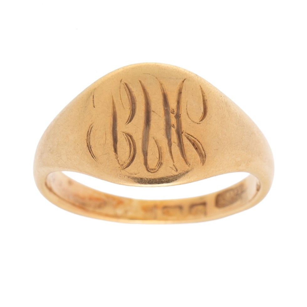An 18ct gold signet ring, the oval reserve monogram engraved, ring size F, hallmarked inside shank, 3.5g.