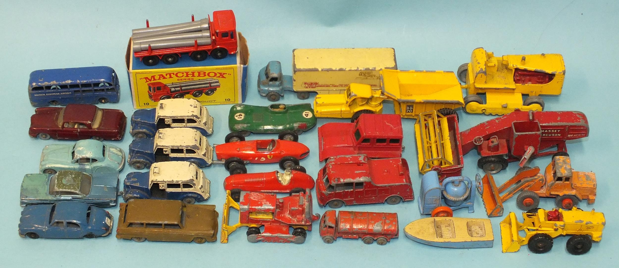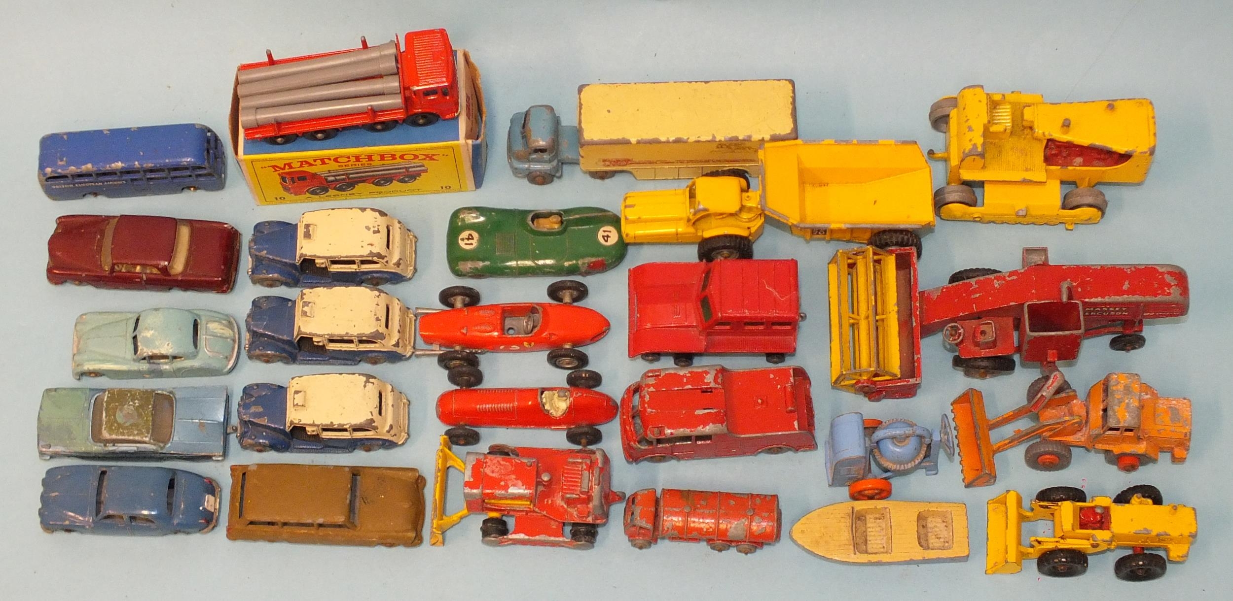 Three Dublo Dinky Austin taxis (unboxed), a boxed Matchbox 10 Pipe Truck and twenty Lesney Matchbox vehicles, unboxed and play-worn, including 41 D-type Jaguar, 52 Maserati 4CLT/1948 and 73 F1 Ferrari, (x2).