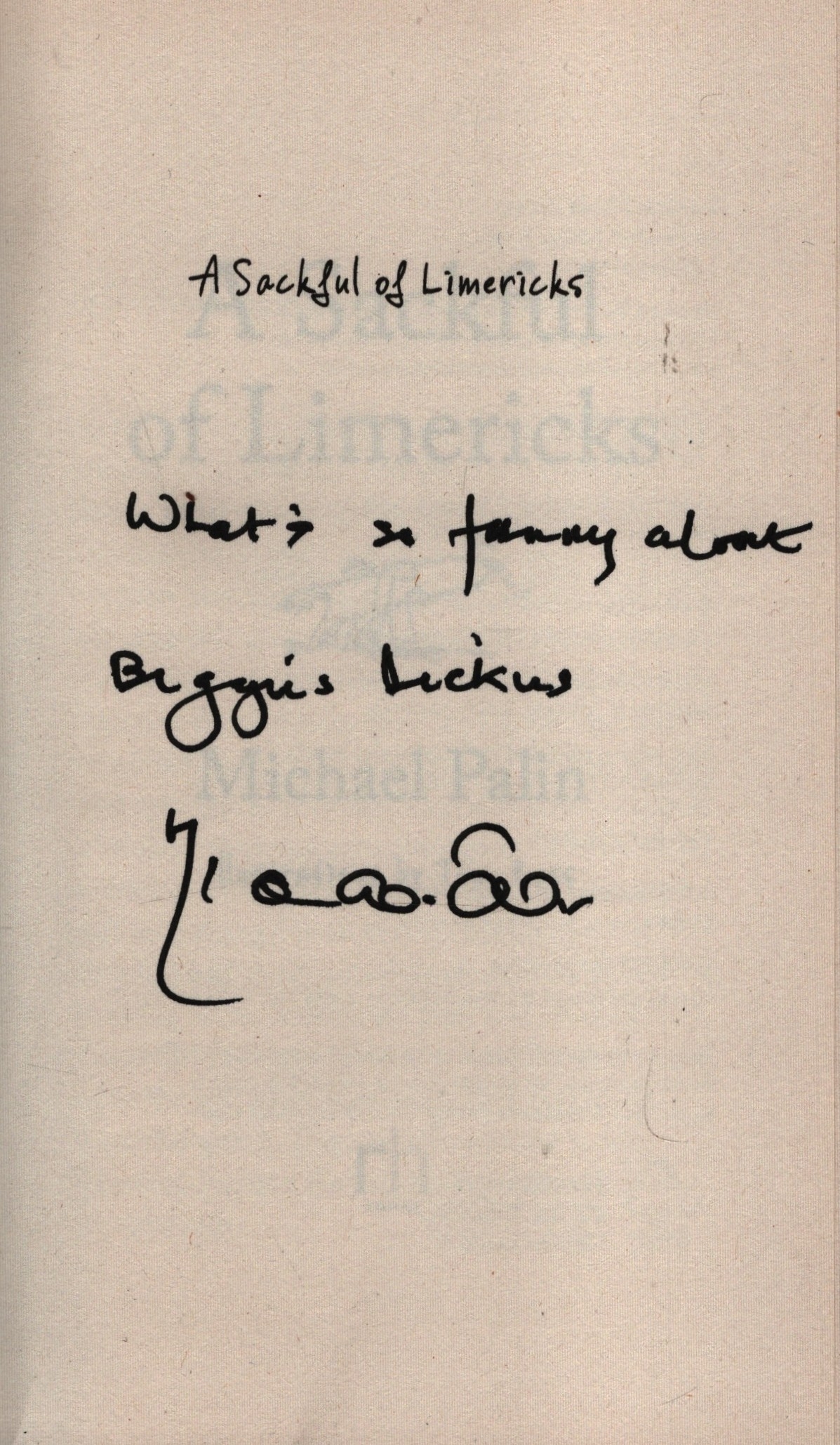 Michael Palin signed hardback book. Titled: A Sackful of Limericks. Edition: Reprint. Publisher: RH Books. Penguin Random House.