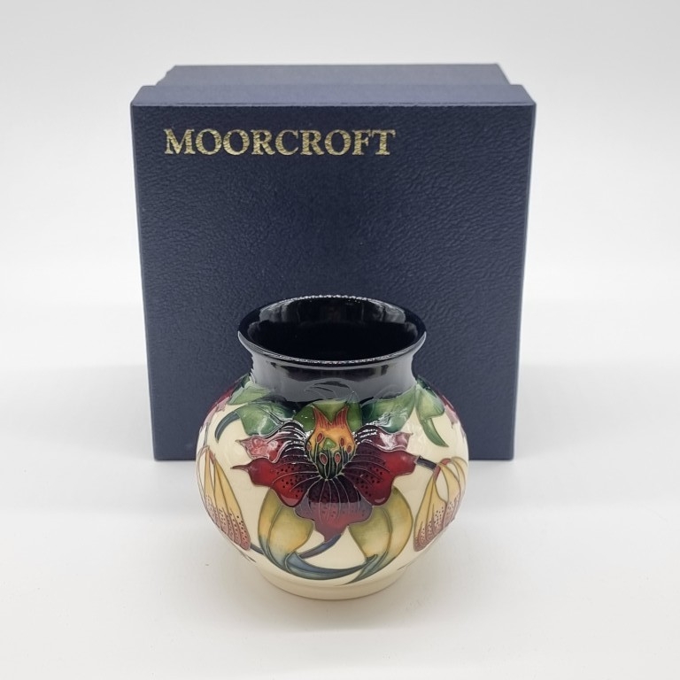 A Moorcroft 'Anna Lily' pattern ovoid vase, by Nicola Slaney, 11cm high, boxed.