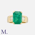 An Emerald and Diamond Ring in yellow gold, comprising an elongated octagonal emerald of approximately 5.40 carats, flanked either side by a trio of baguette cut diamonds to each shoulder. Marked 5.40 BM, tests indicate 18 carat gold.