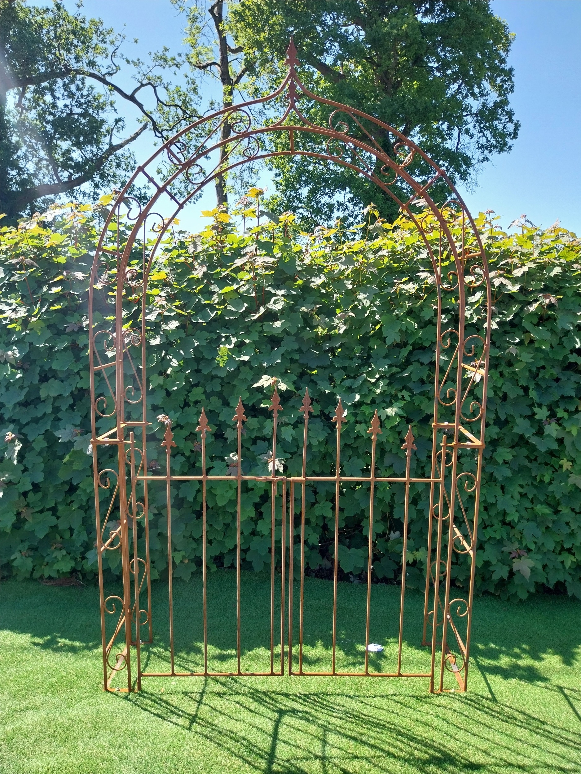 Wrought iron rose arch with gate. {200 cm H x 142 cm W x 34 cm D].