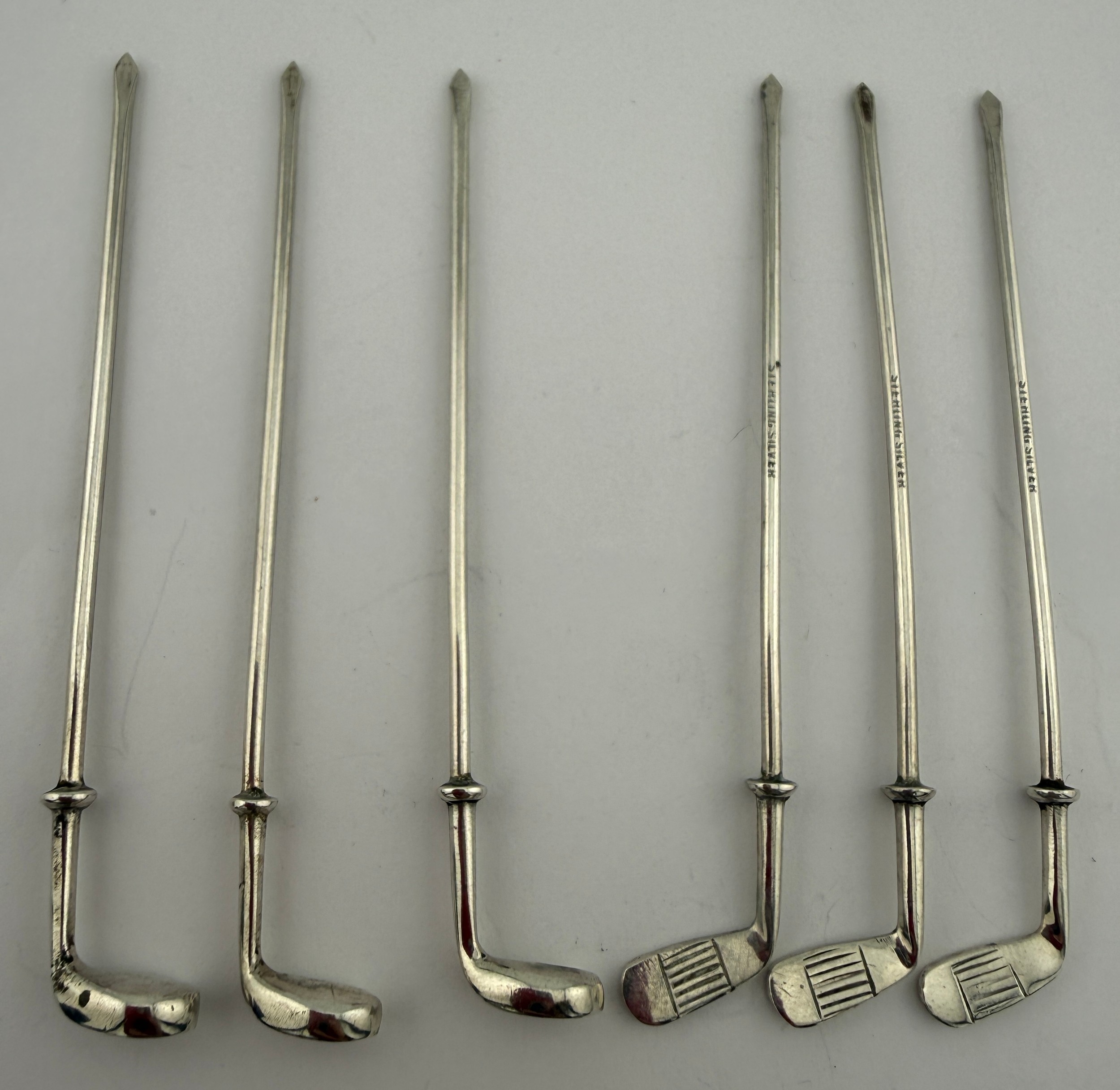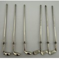 Six sterling silver golf club cocktail sticks. 9cm l. Total weight 24gm.